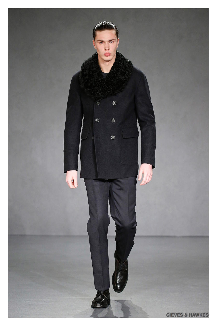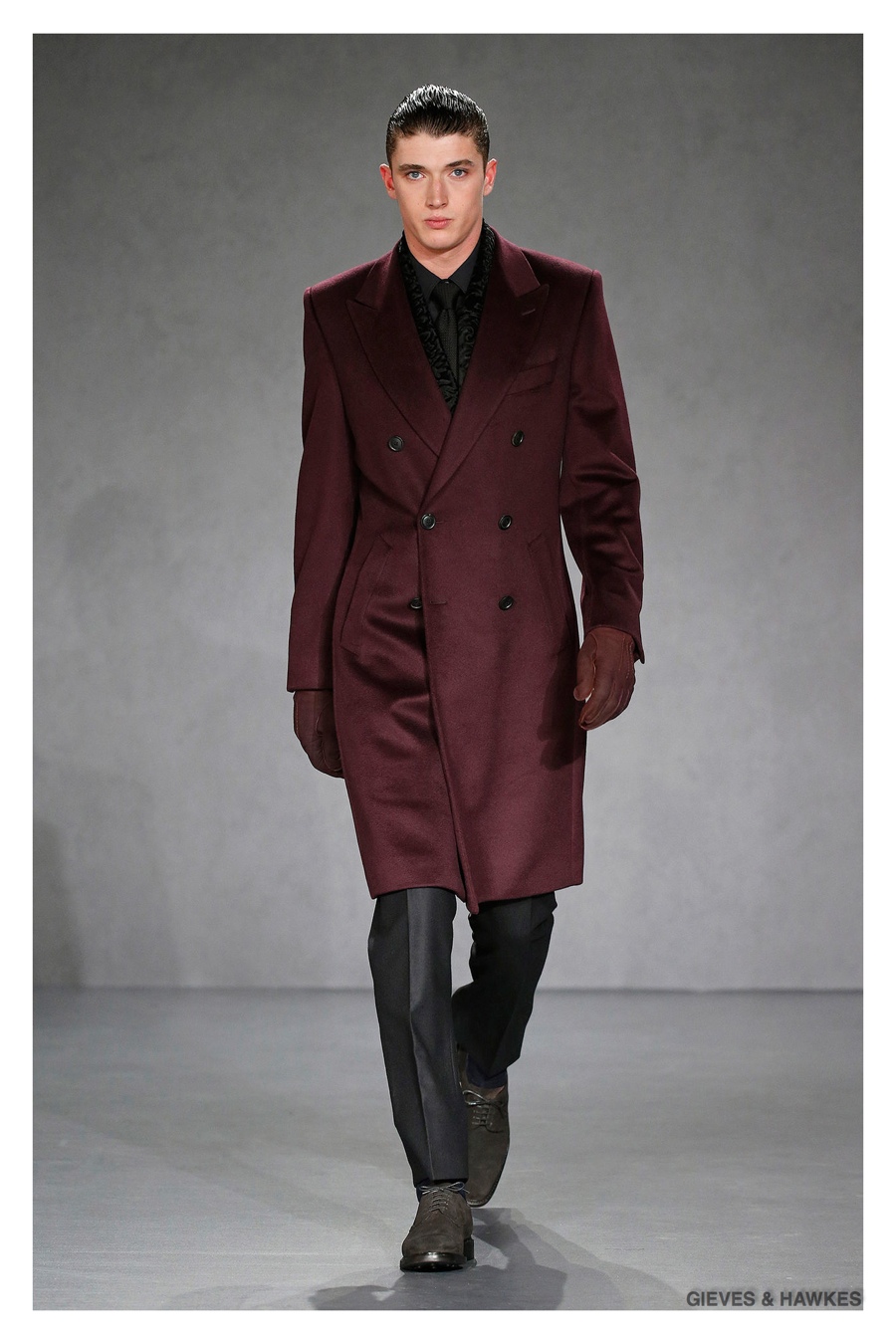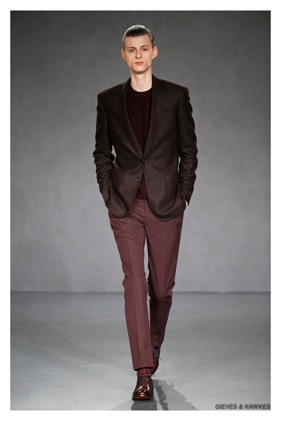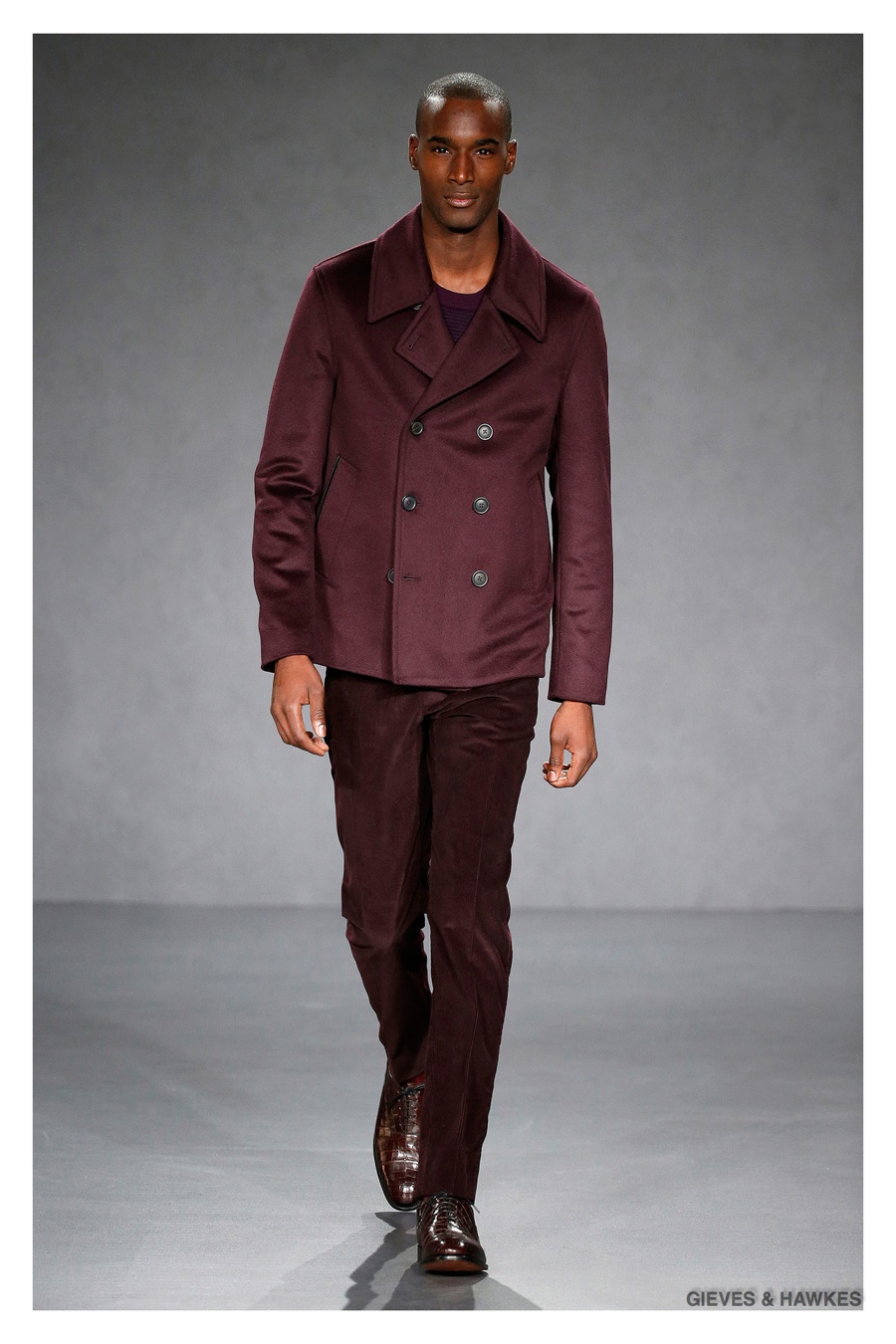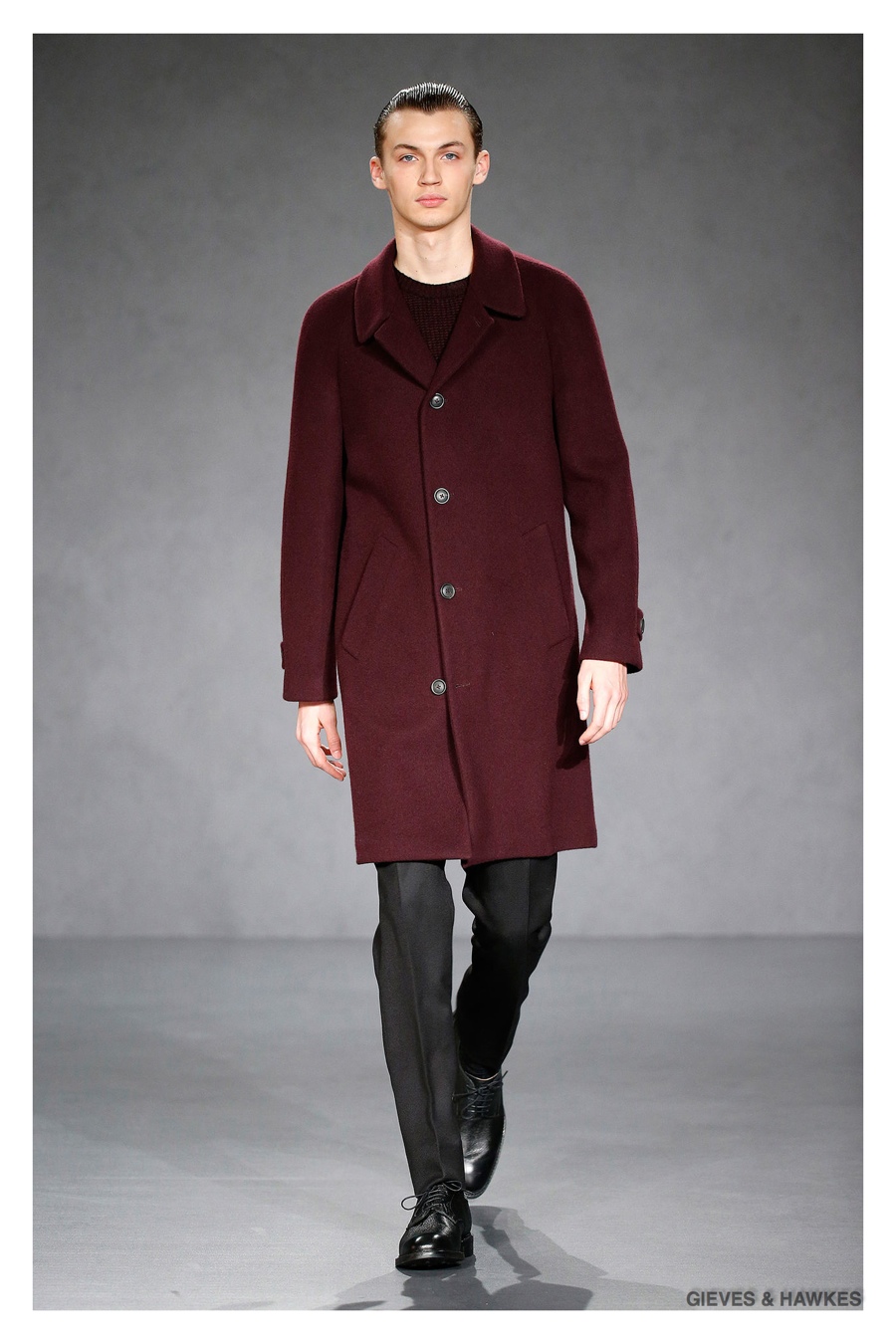 Unveiled during London Collections: Men, Gieves & Hawkes creative director Jason Basmajian presented a smart fall-winter 2015 outing that married the brand’s Savile Row heritage with a contemporary affection for polished men’s style. Bringing together burgundy, navy and charcoal, a somber take on fall provided choice moments for structured outerwear, essential cable-knit sweaters, lean, pleated trousers and sharp suiting. One of the season’s stars, outerwear was well represented with a variety of styles, ranging from dufflecoats and leather jackets to double-breasted coats, rounding out the strong showing.
