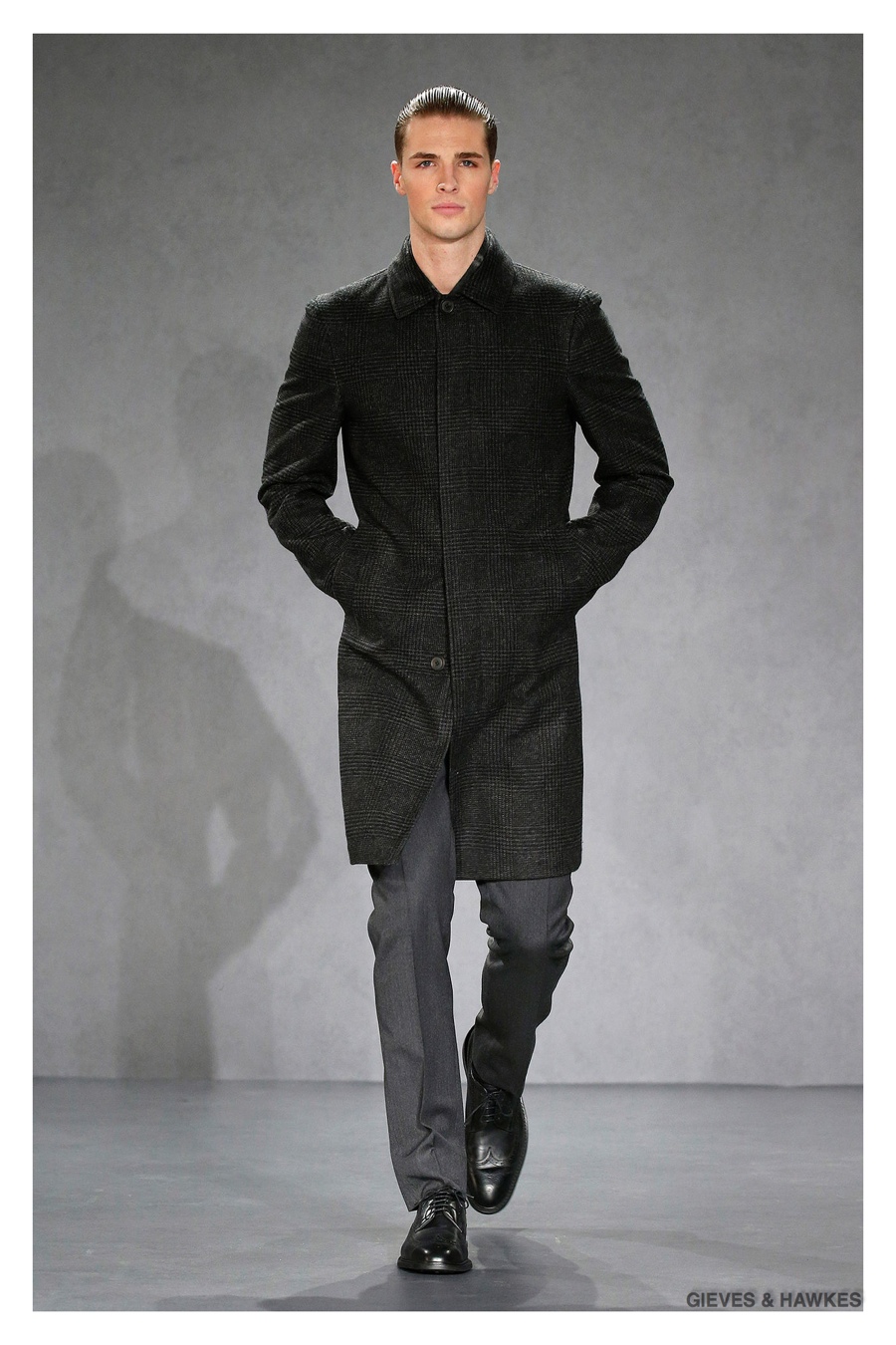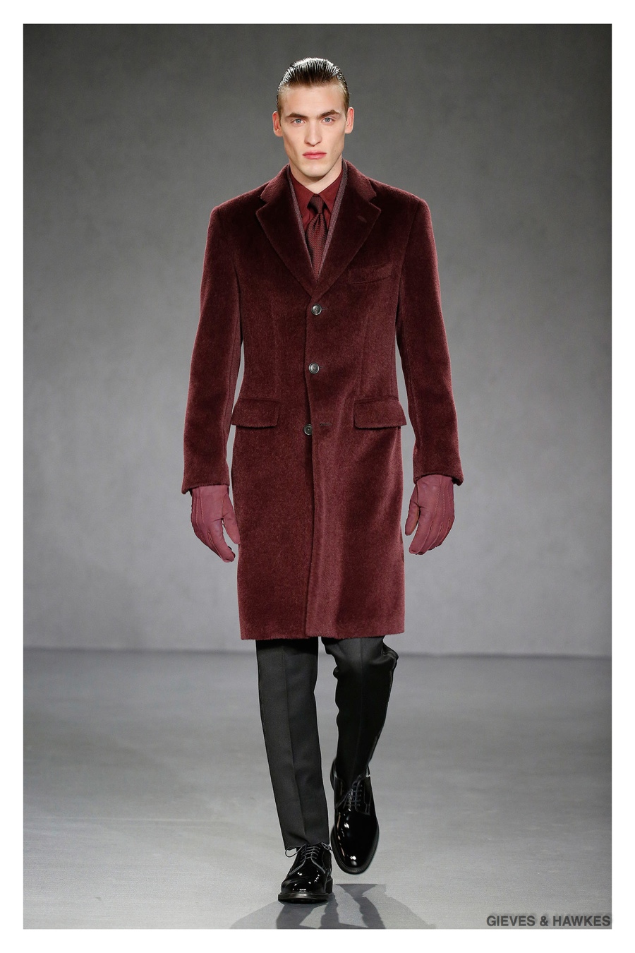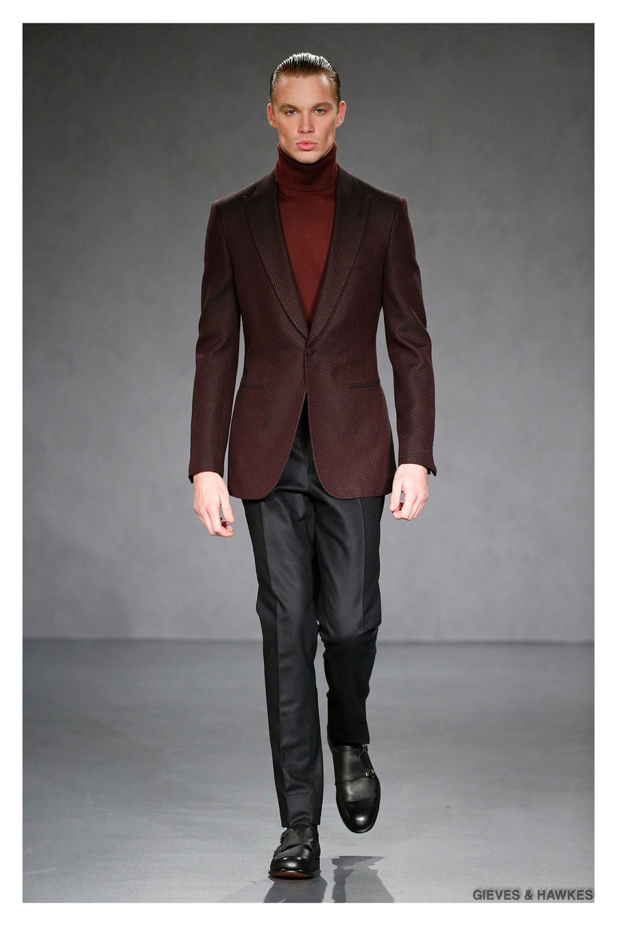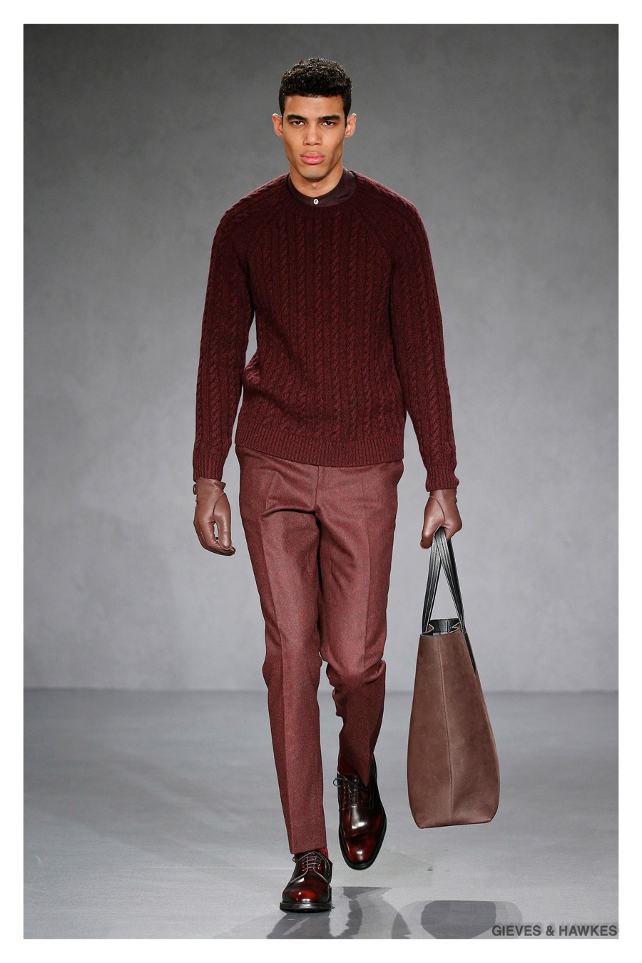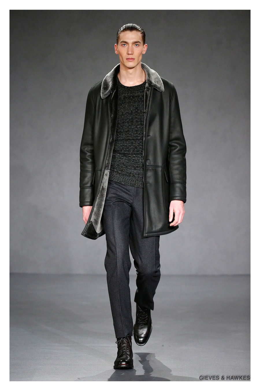 Unveiled during London Collections: Men, Gieves & Hawkes creative director Jason Basmajian presented a smart fall-winter 2015 outing that married the brand’s Savile Row heritage with a contemporary affection for polished men’s style. Bringing together burgundy, navy and charcoal, a somber take on fall provided choice moments for structured outerwear, essential cable-knit sweaters, lean, pleated trousers and sharp suiting. One of the season’s stars, outerwear was well represented with a variety of styles, ranging from dufflecoats and leather jackets to double-breasted coats, rounding out the strong showing.