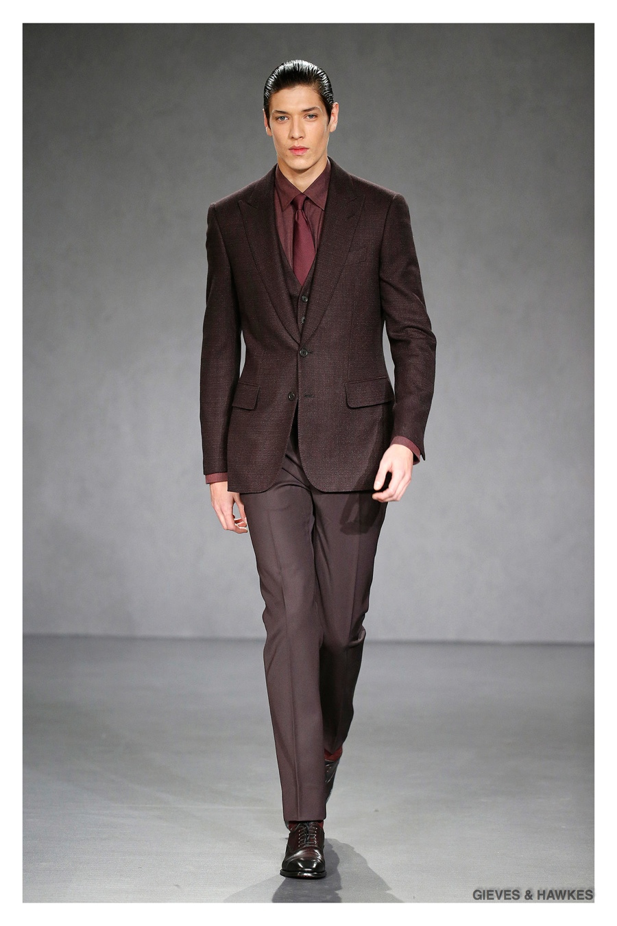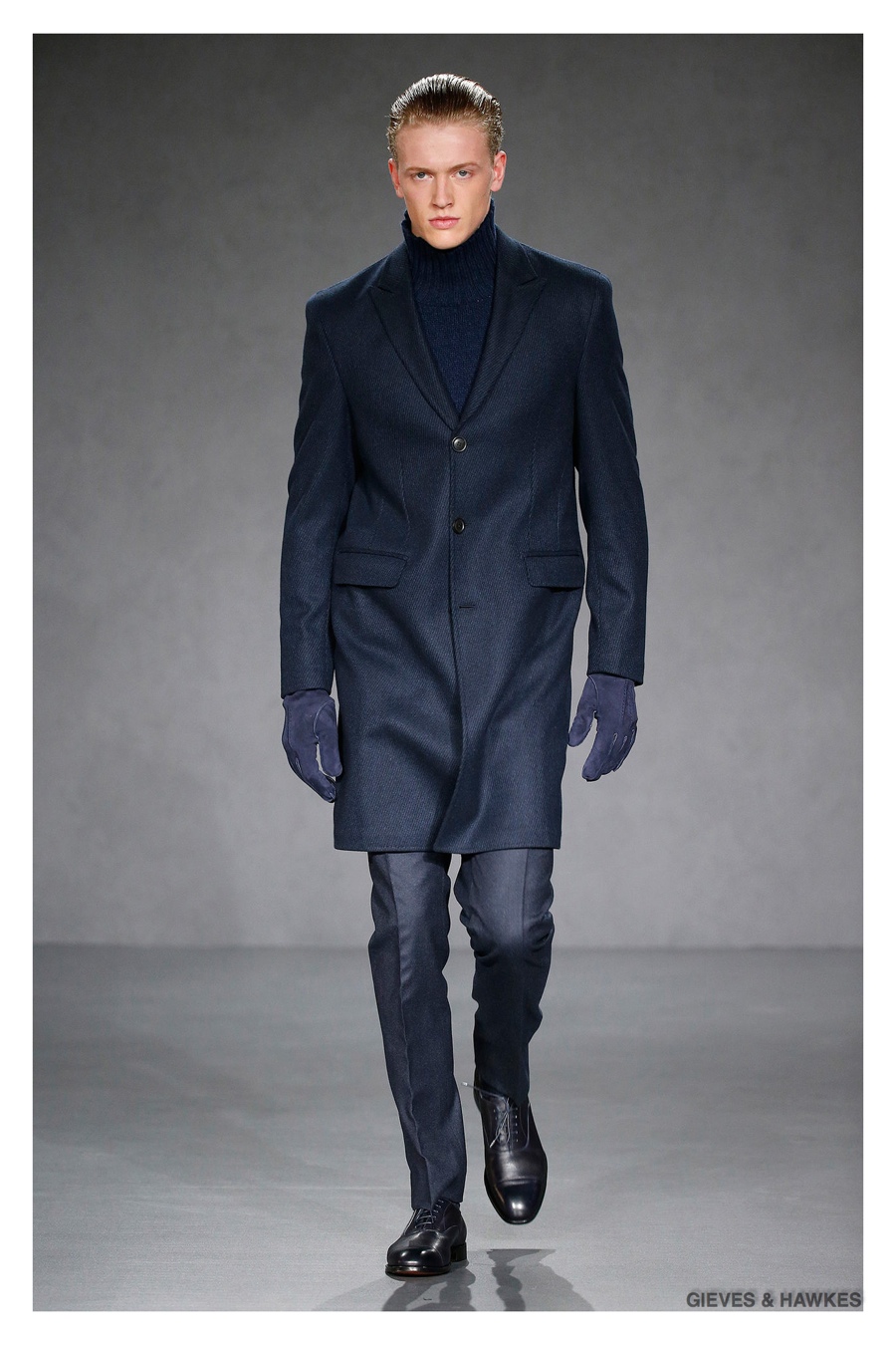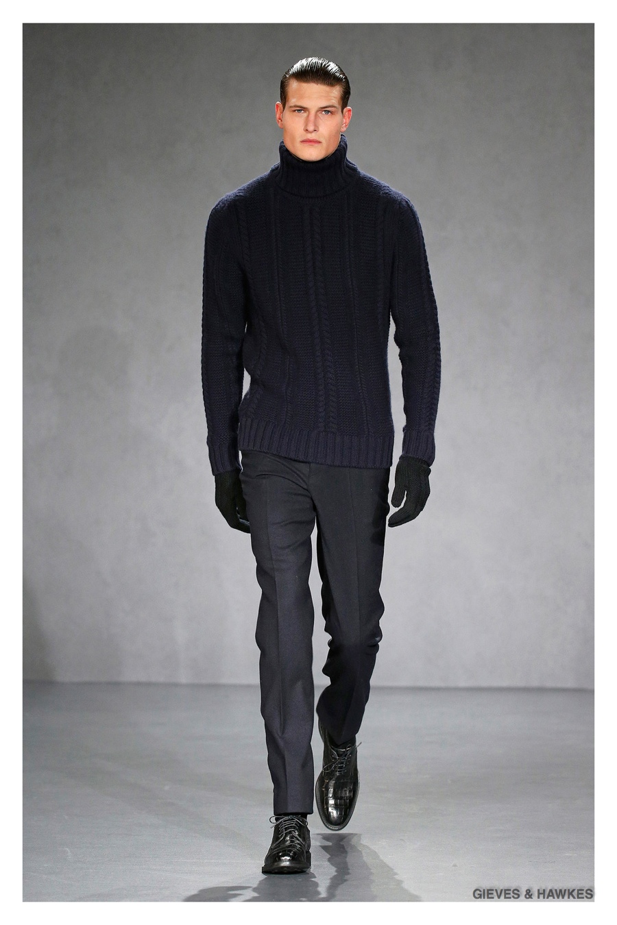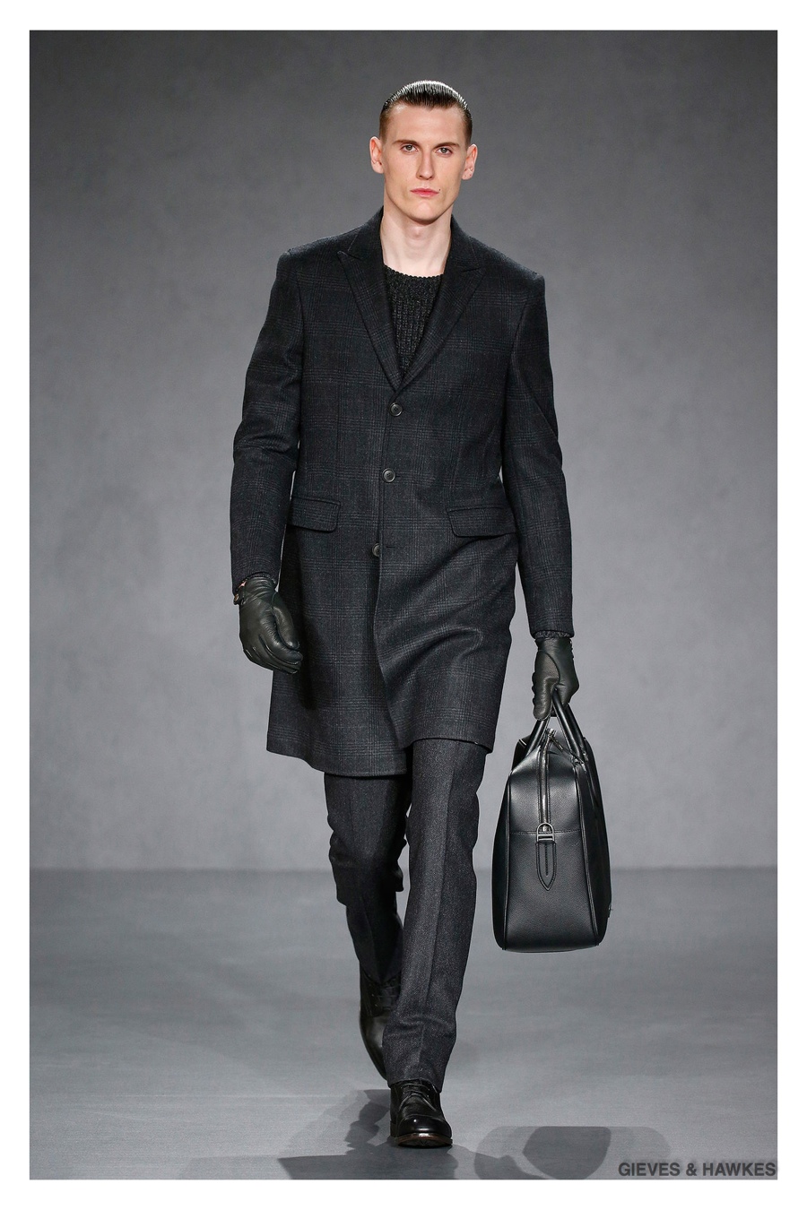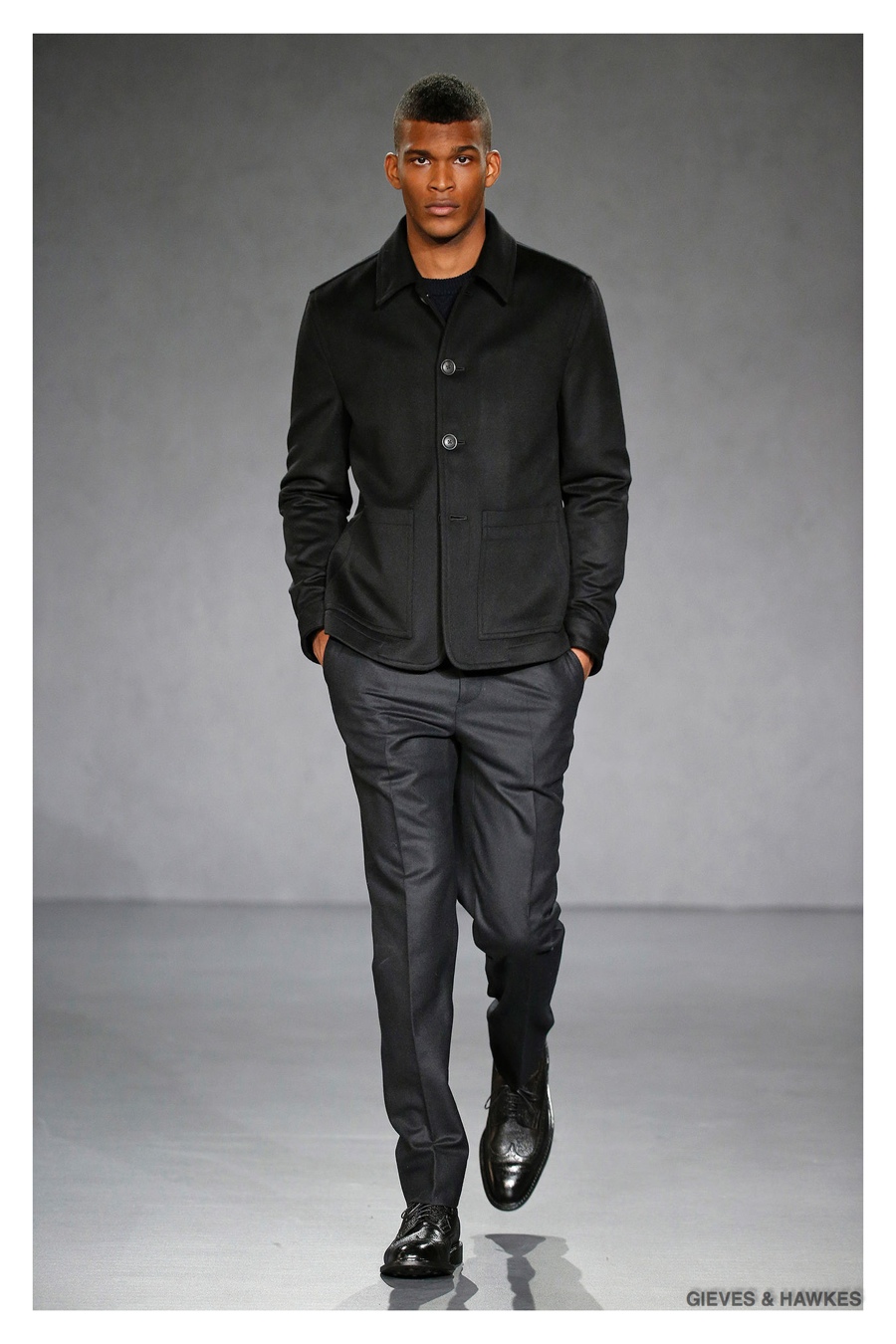 Unveiled during London Collections: Men, Gieves & Hawkes creative director Jason Basmajian presented a smart fall-winter 2015 outing that married the brand’s Savile Row heritage with a contemporary affection for polished men’s style. Bringing together burgundy, navy and charcoal, a somber take on fall provided choice moments for structured outerwear, essential cable-knit sweaters, lean, pleated trousers and sharp suiting. One of the season’s stars, outerwear was well represented with a variety of styles, ranging from dufflecoats and leather jackets to double-breasted coats, rounding out the strong showing.
