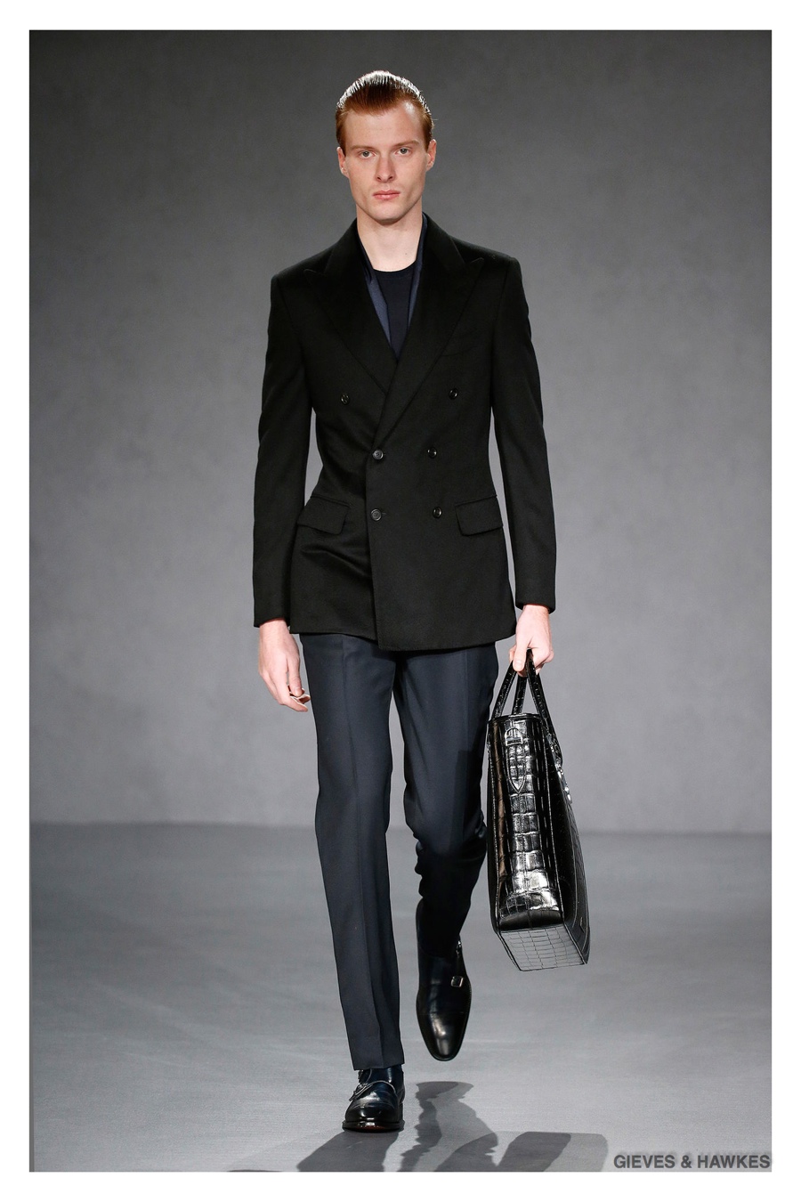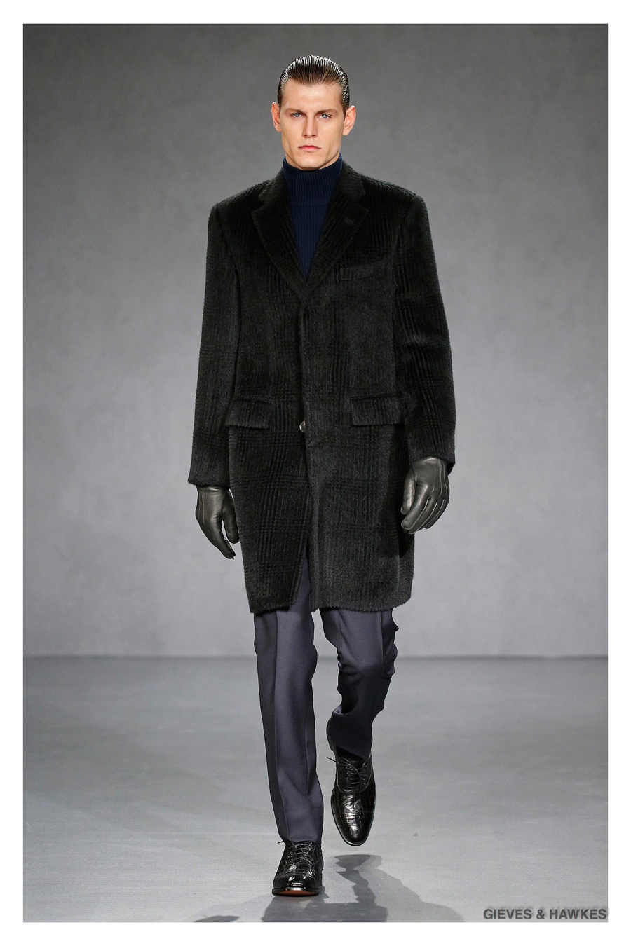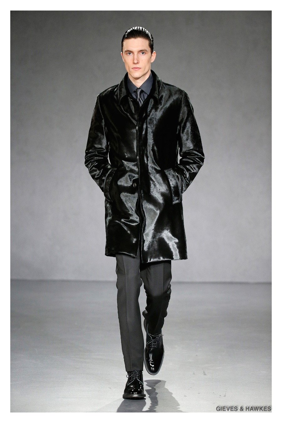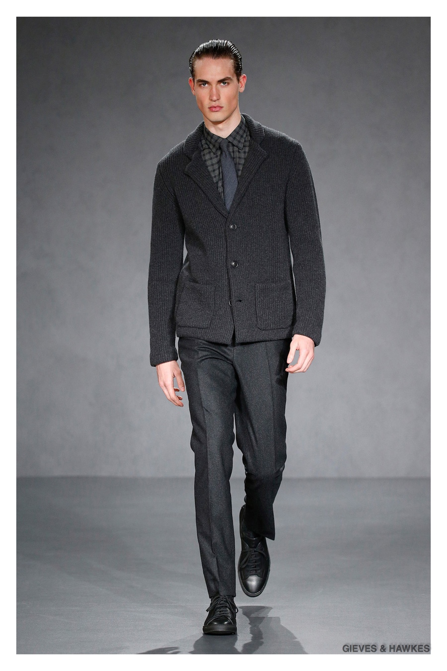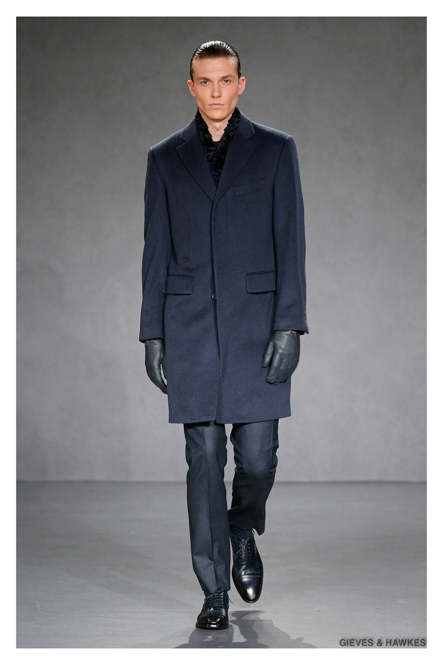 Unveiled during London Collections: Men, Gieves & Hawkes creative director Jason Basmajian presented a smart fall-winter 2015 outing that married the brand’s Savile Row heritage with a contemporary affection for polished men’s style. Bringing together burgundy, navy and charcoal, a somber take on fall provided choice moments for structured outerwear, essential cable-knit sweaters, lean, pleated trousers and sharp suiting. One of the season’s stars, outerwear was well represented with a variety of styles, ranging from dufflecoats and leather jackets to double-breasted coats, rounding out the strong showing.