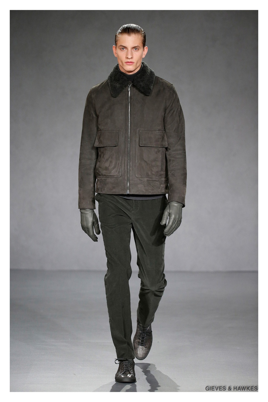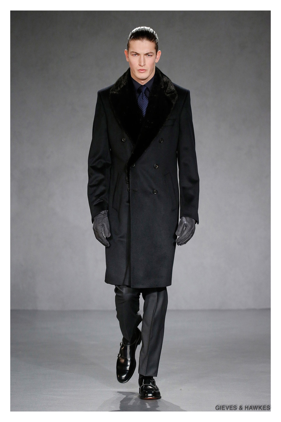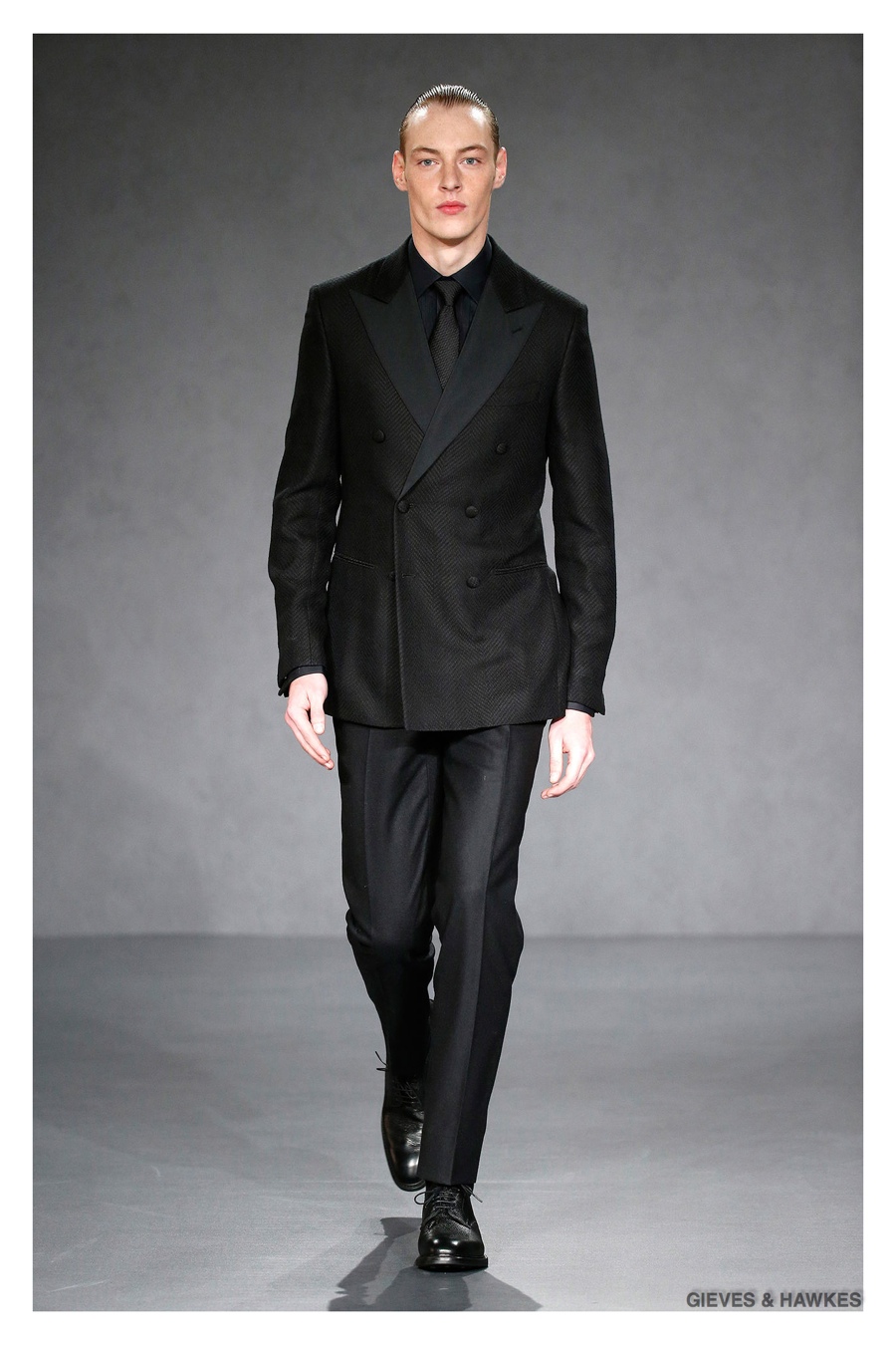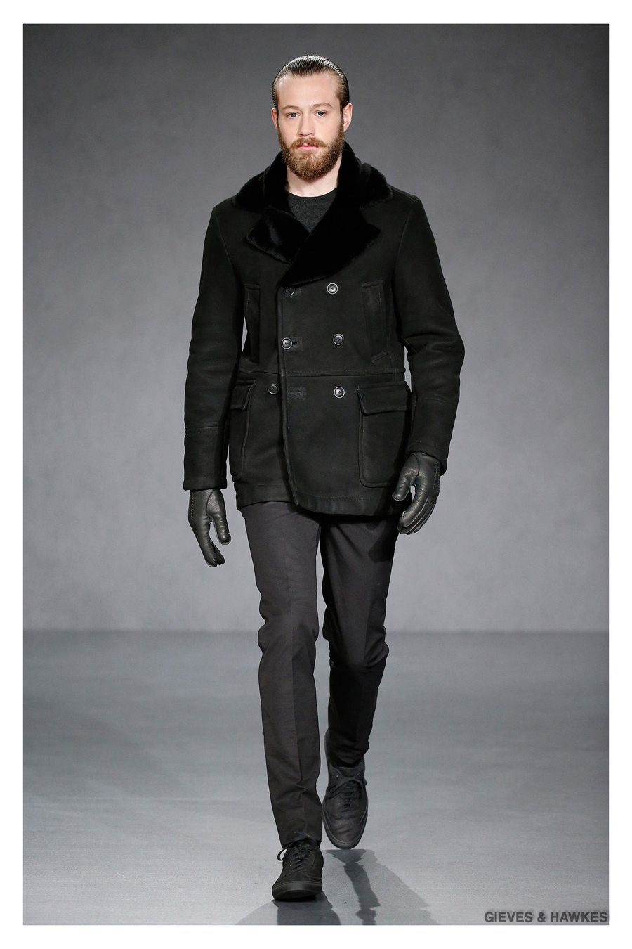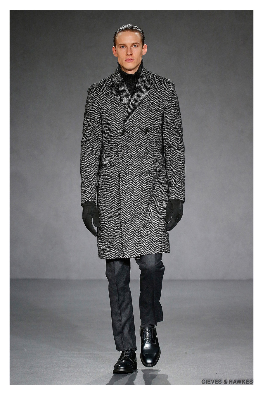 Unveiled during London Collections: Men, Gieves & Hawkes creative director Jason Basmajian presented a smart fall-winter 2015 outing that married the brand’s Savile Row heritage with a contemporary affection for polished men’s style. Bringing together burgundy, navy and charcoal, a somber take on fall provided choice moments for structured outerwear, essential cable-knit sweaters, lean, pleated trousers and sharp suiting. One of the season’s stars, outerwear was well represented with a variety of styles, ranging from dufflecoats and leather jackets to double-breasted coats, rounding out the strong showing.