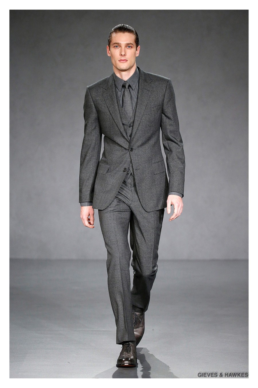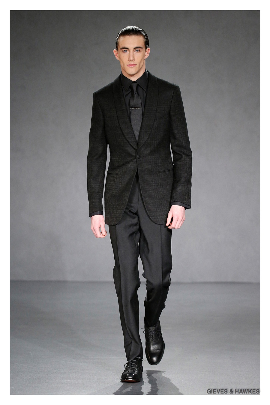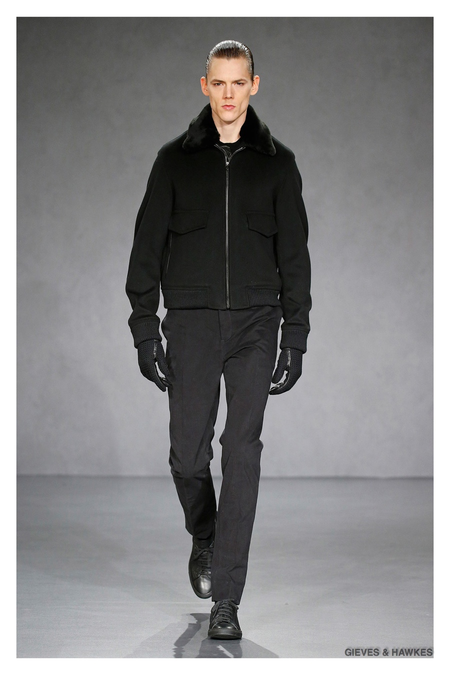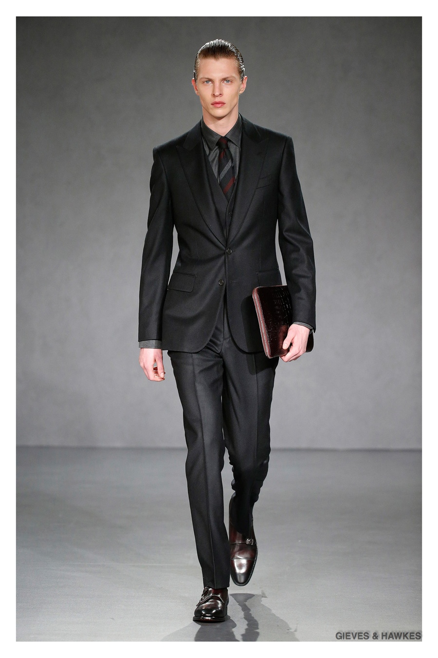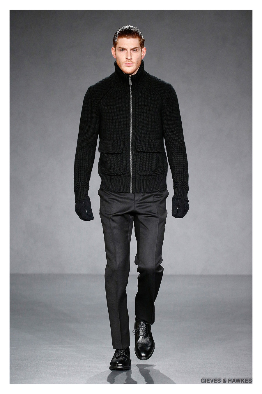 Unveiled during London Collections: Men, Gieves & Hawkes creative director Jason Basmajian presented a smart fall-winter 2015 outing that married the brand’s Savile Row heritage with a contemporary affection for polished men’s style. Bringing together burgundy, navy and charcoal, a somber take on fall provided choice moments for structured outerwear, essential cable-knit sweaters, lean, pleated trousers and sharp suiting. One of the season’s stars, outerwear was well represented with a variety of styles, ranging from dufflecoats and leather jackets to double-breasted coats, rounding out the strong showing.