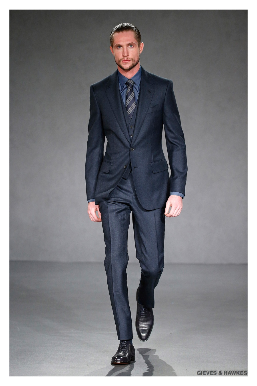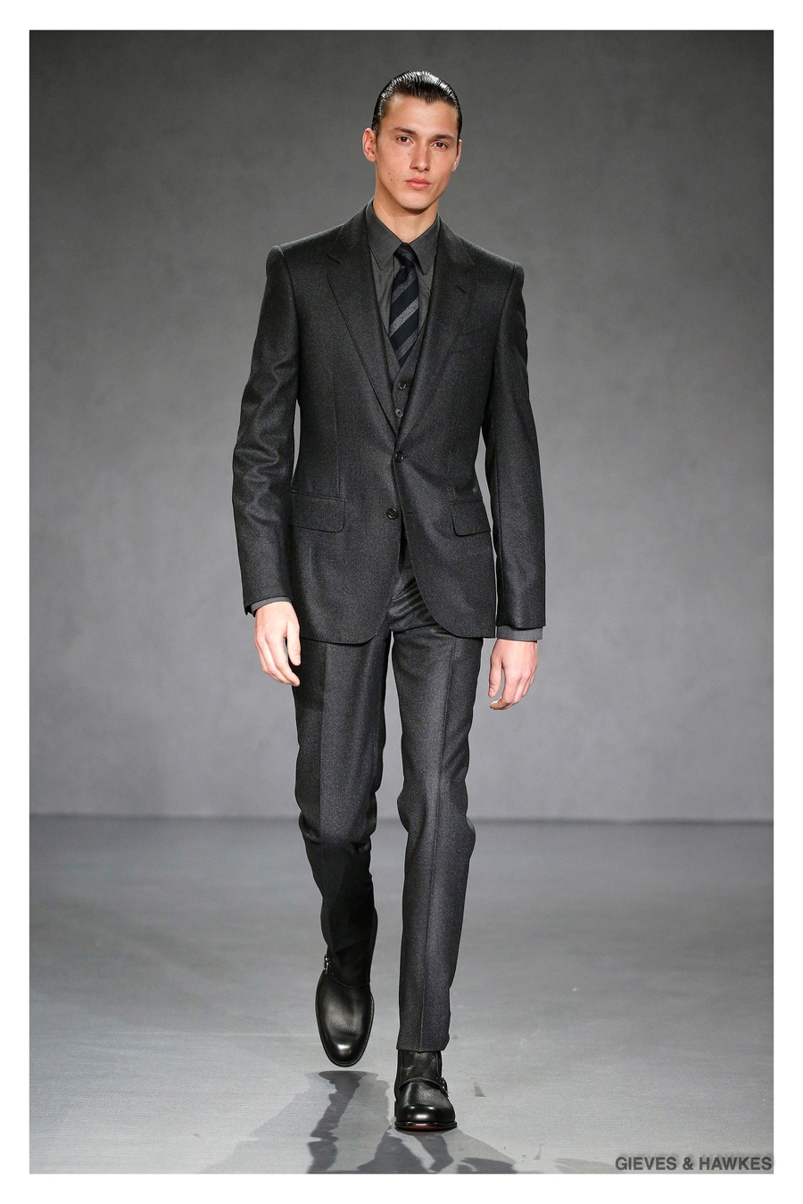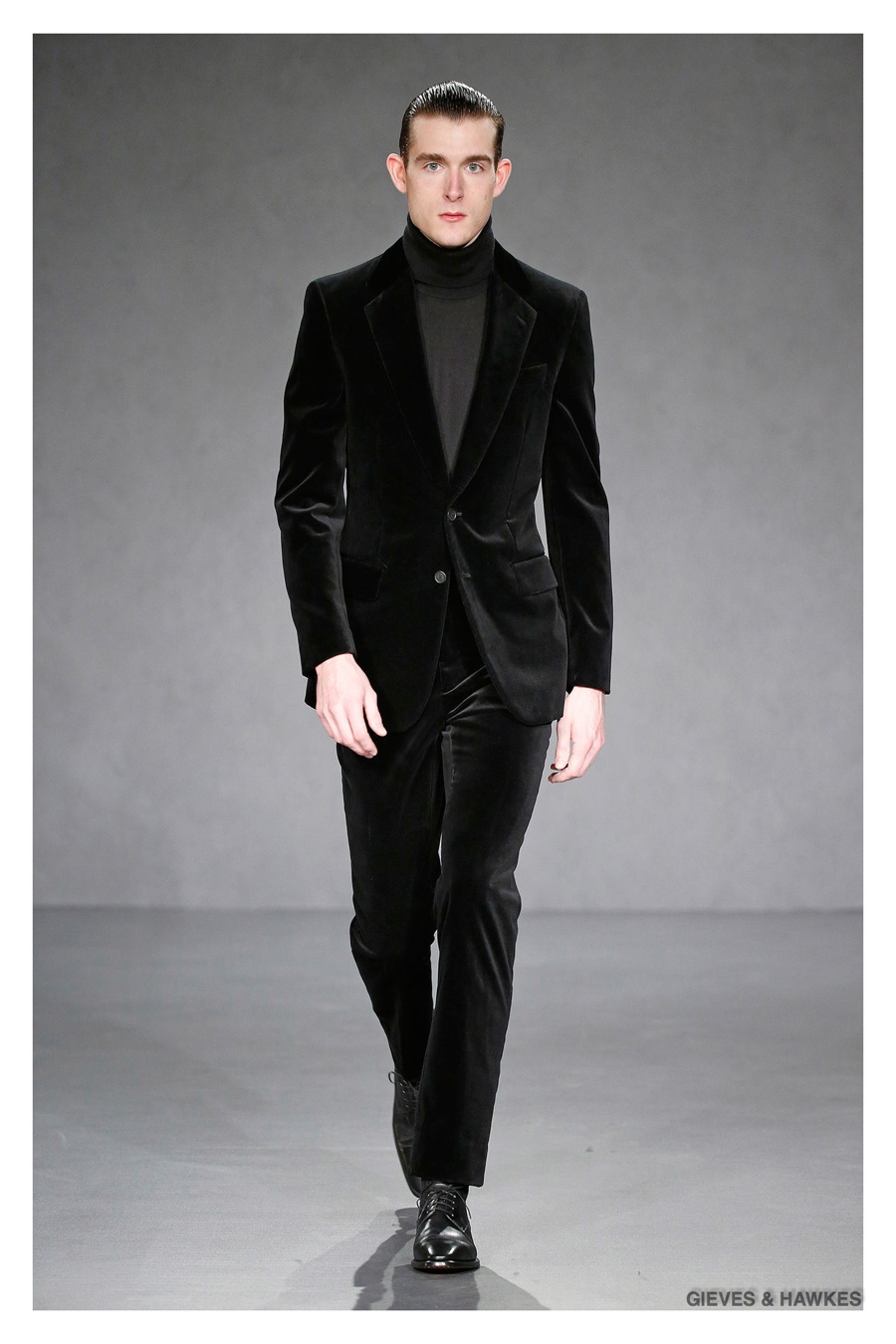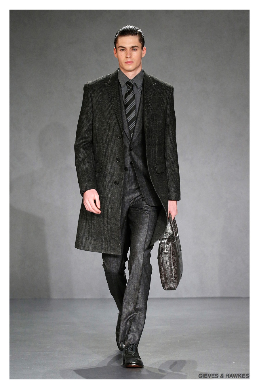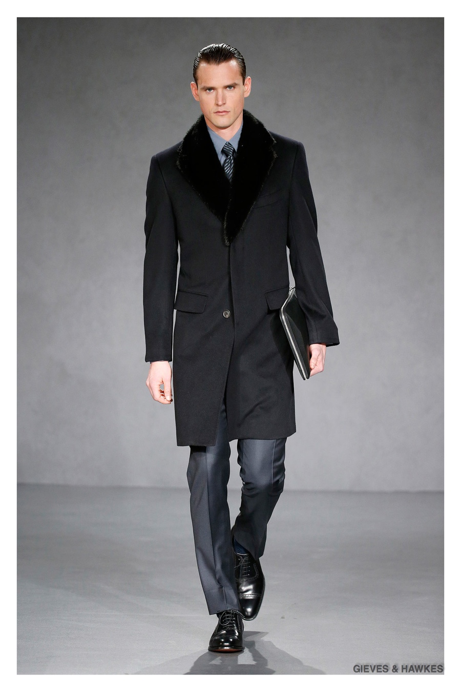 Unveiled during London Collections: Men, Gieves & Hawkes creative director Jason Basmajian presented a smart fall-winter 2015 outing that married the brand’s Savile Row heritage with a contemporary affection for polished men’s style. Bringing together burgundy, navy and charcoal, a somber take on fall provided choice moments for structured outerwear, essential cable-knit sweaters, lean, pleated trousers and sharp suiting. One of the season’s stars, outerwear was well represented with a variety of styles, ranging from dufflecoats and leather jackets to double-breasted coats, rounding out the strong showing.