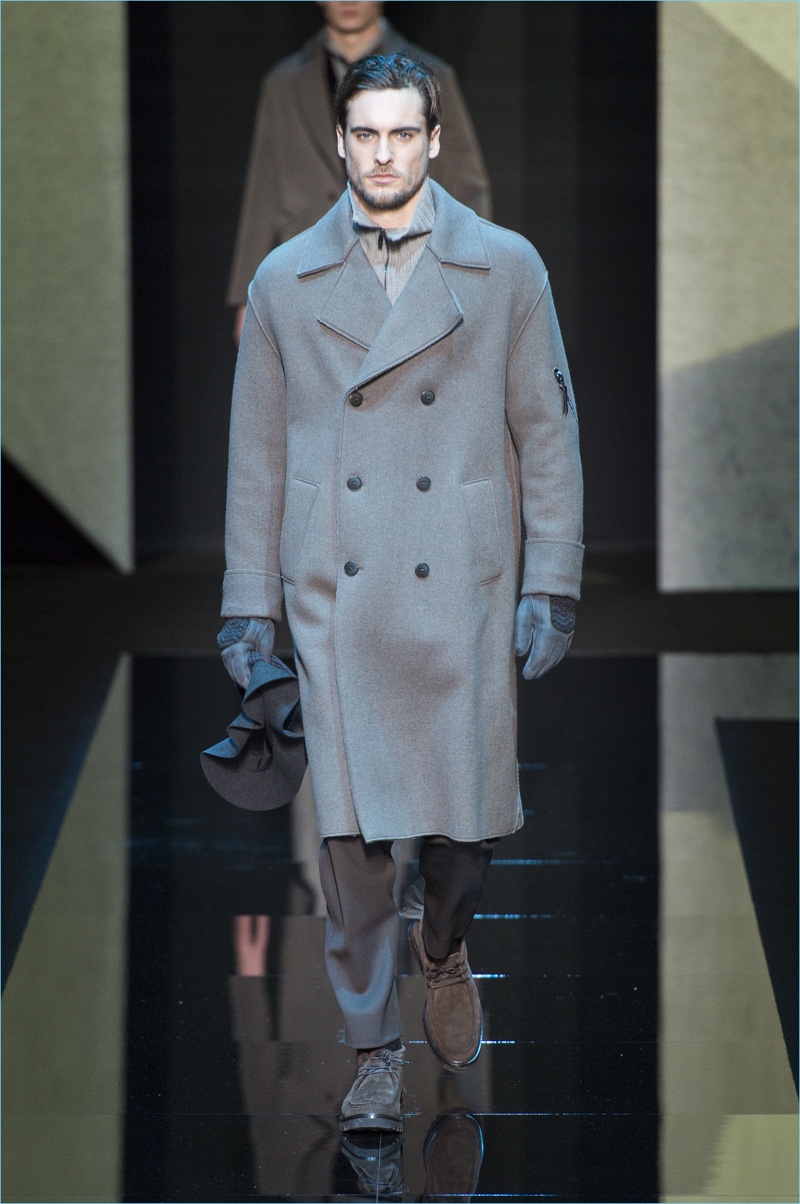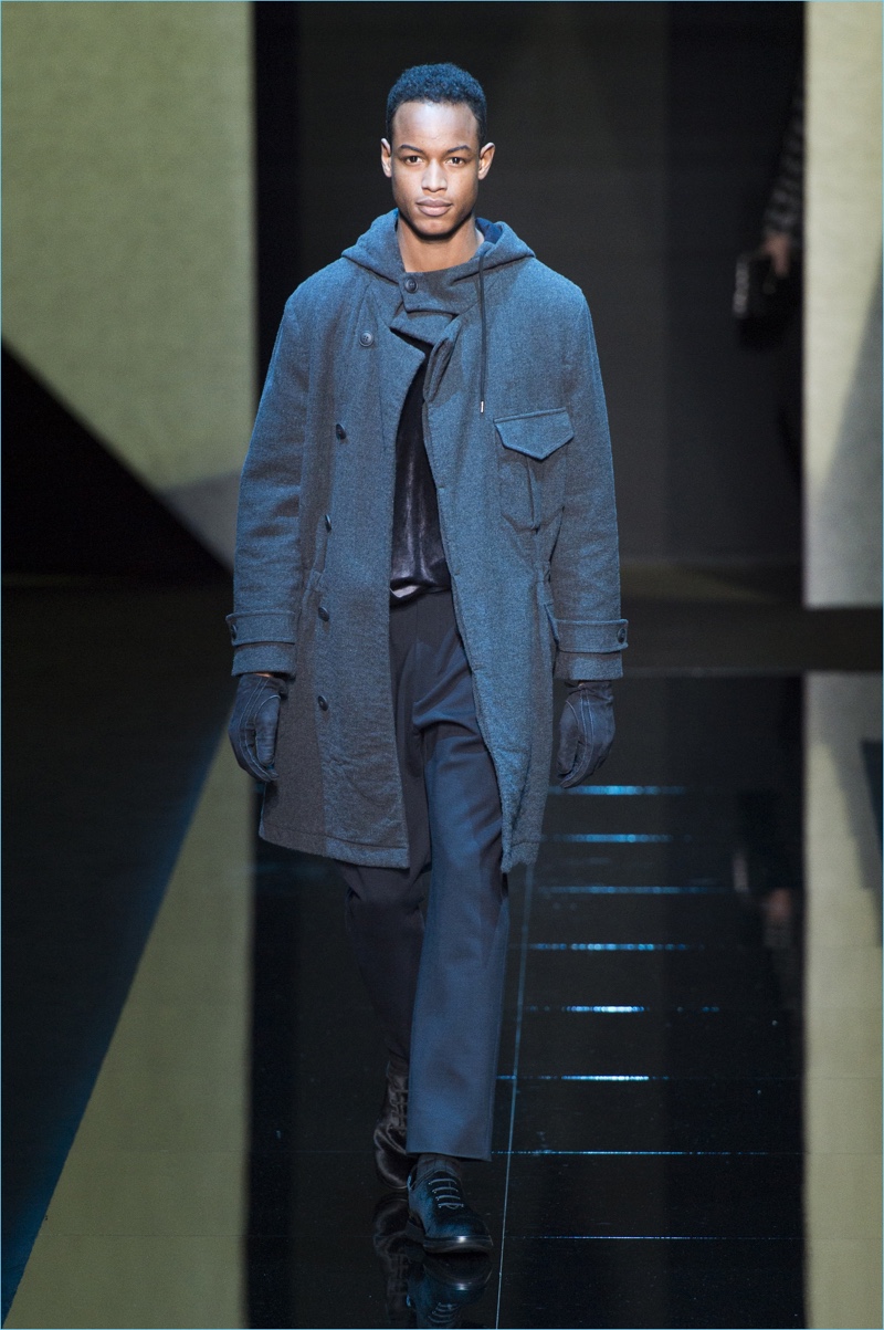 Hooded coats contribute to Giorgio Armani’s hero pieces for fall-winter 2017.