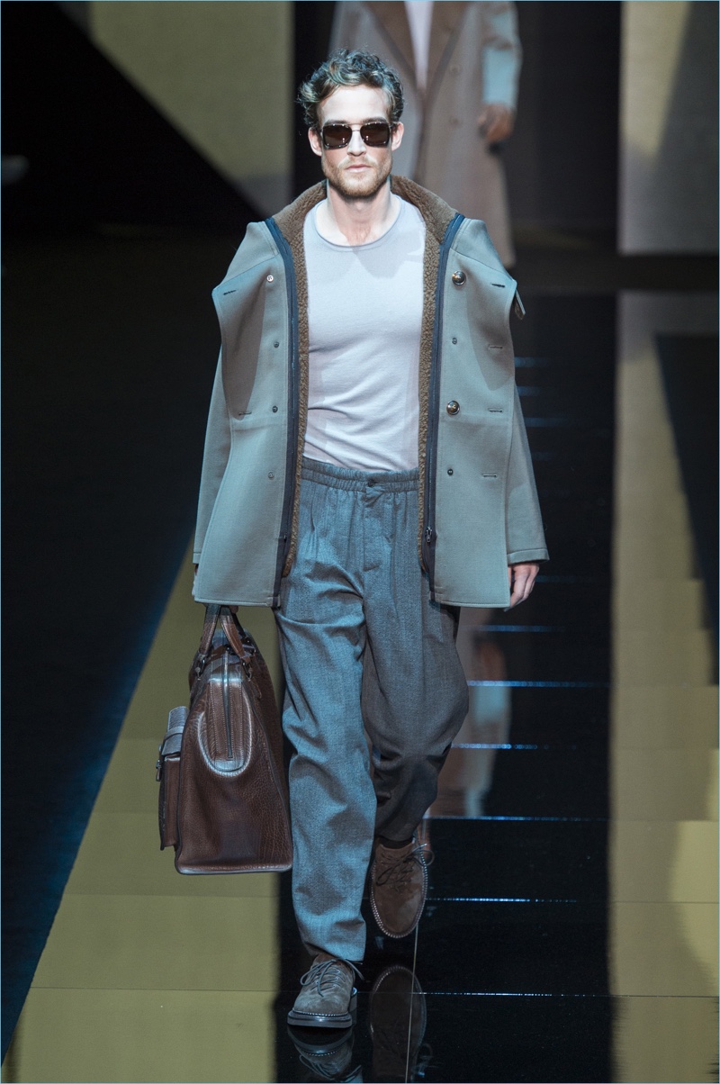 Greens and blues make a splash against a quiet grey color palette. Meanwhile, check sports coats, geometric print sweaters, and hooded coats strike up a sleek appeal. Giorgio Armani’s man also finds confidence in choice leather bags, modern sunglasses, leather gloves, and classic footwear.