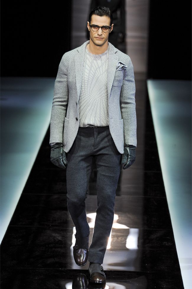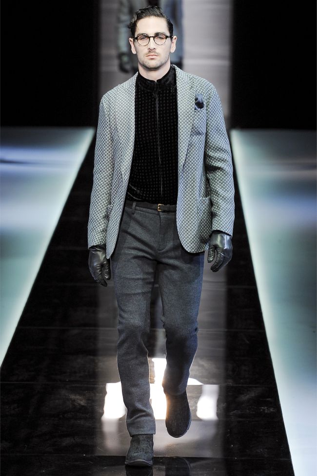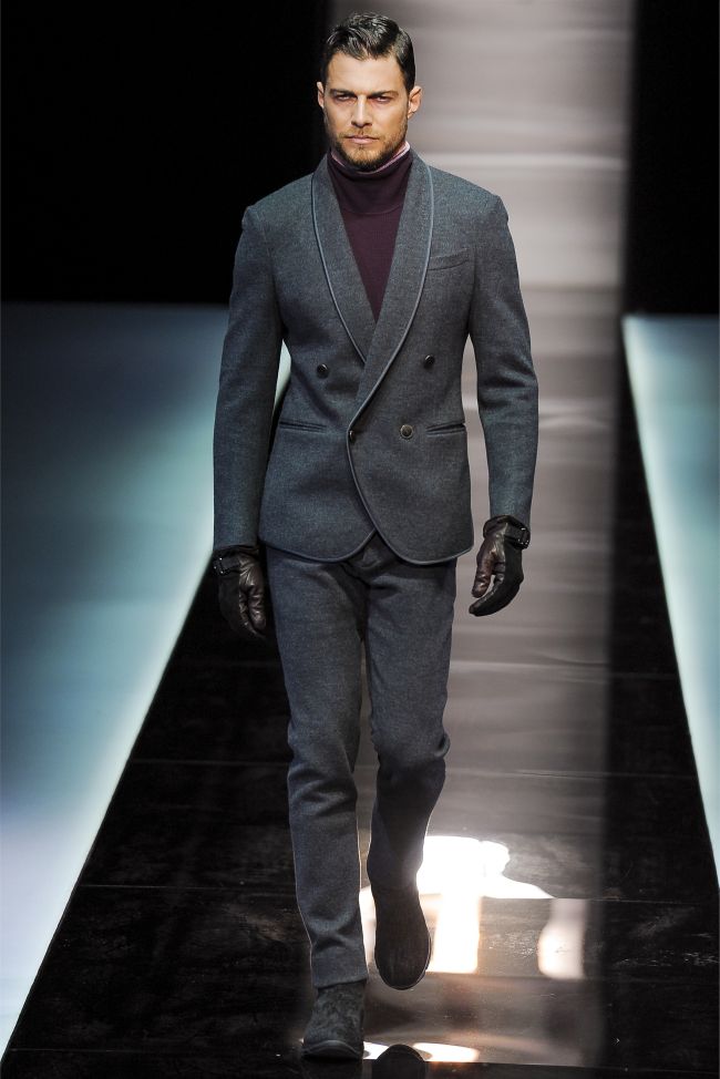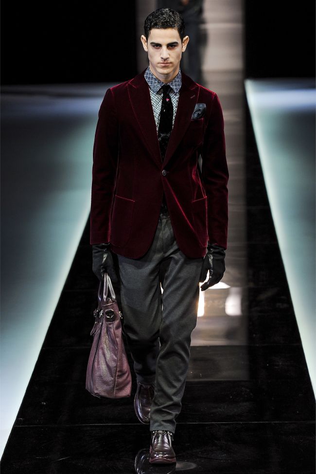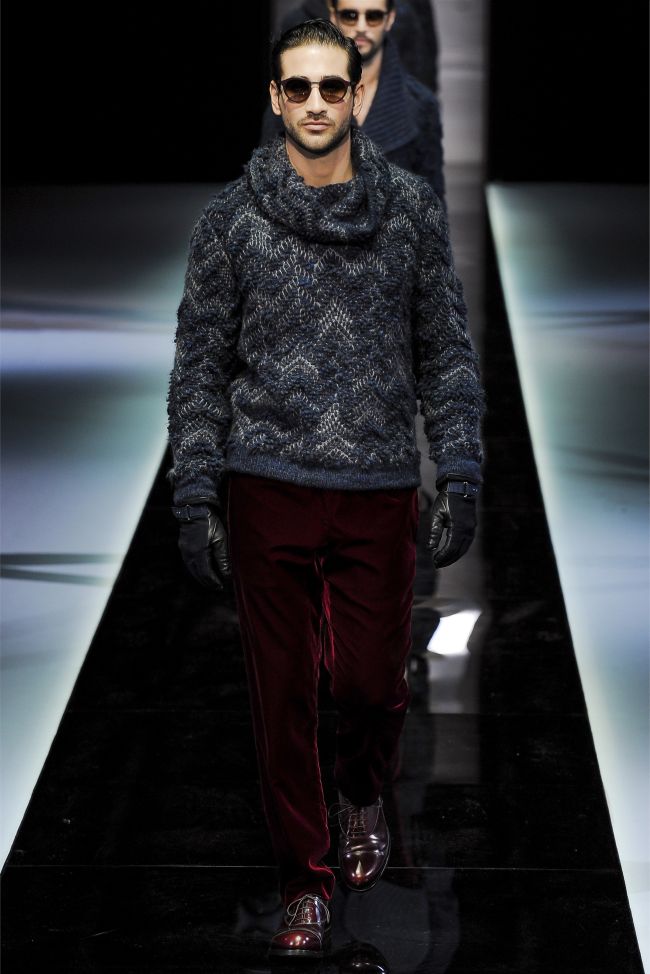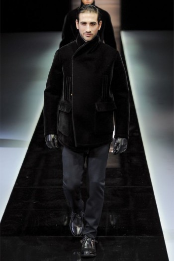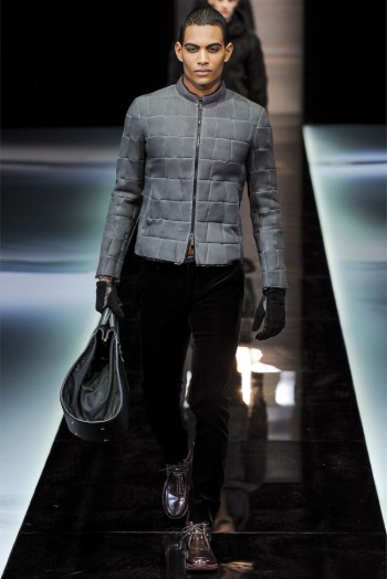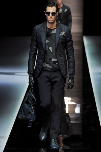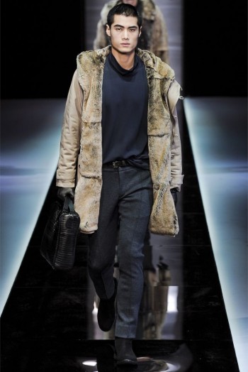 Armani’s Touch–It was all about the touch for Giorgio Armani’s latest Fall/Winter 2013 Collection. Showcasing a rich variety of heavy-weight fabrics, including luxe cashmere, patterned knits, thick wools, lavish velvets, chunky furs, and even crocodile, Armani played heavy on the tactile nature of fashion. Incorporating modern sportswear with a nostalgic worldliness, Armani featured a collection that moved from the militaristic man with the utilitarian jacket to the poised gentleman with streamlined three-piece suits, luxurious fur and shearling-lined coats, and posh velvet evening staples. Blending masculine, elegant design with pure functionality, Armani featured a collection of warm fabrics and chic outerwear that will protect any man for the unforgiving brutalities of the frigid seasons.