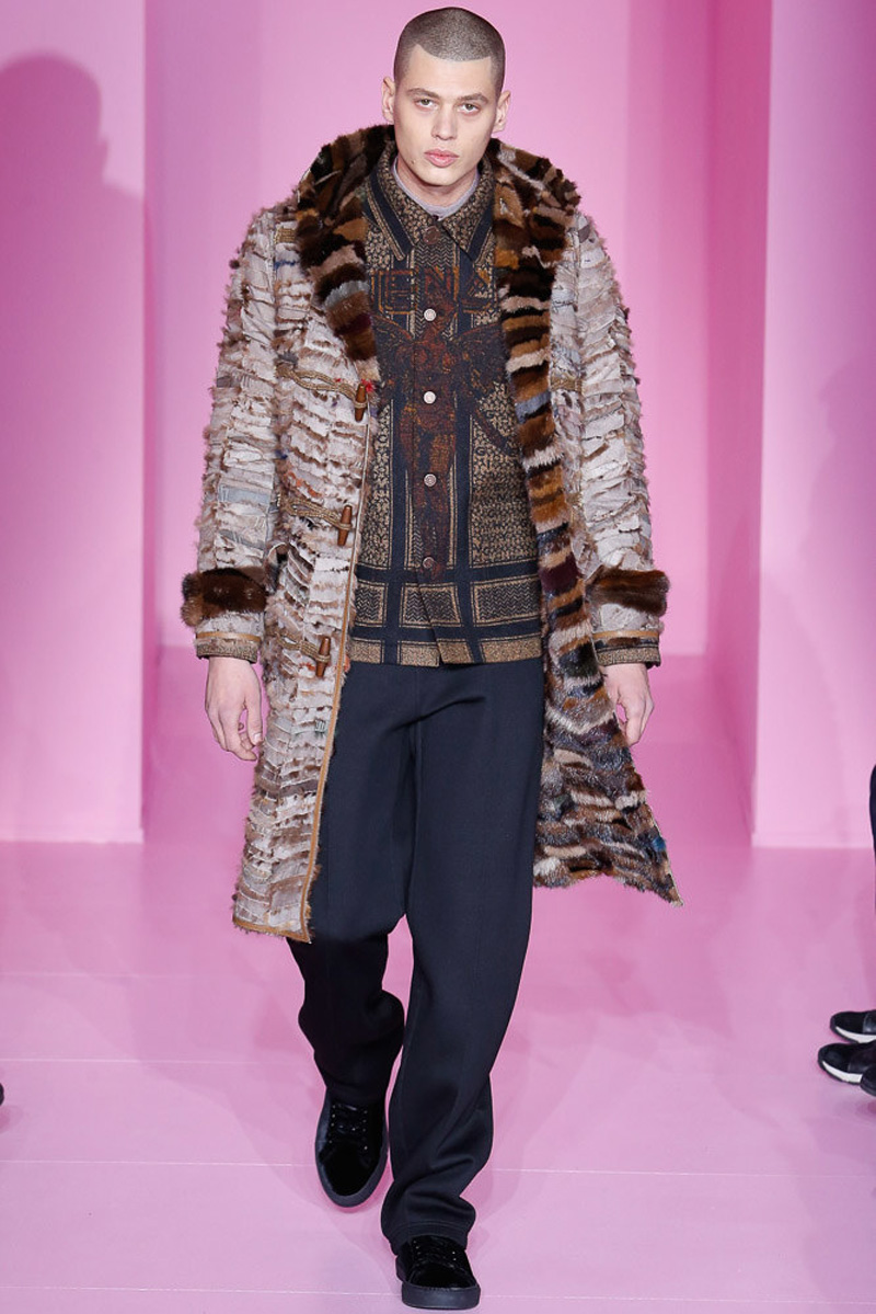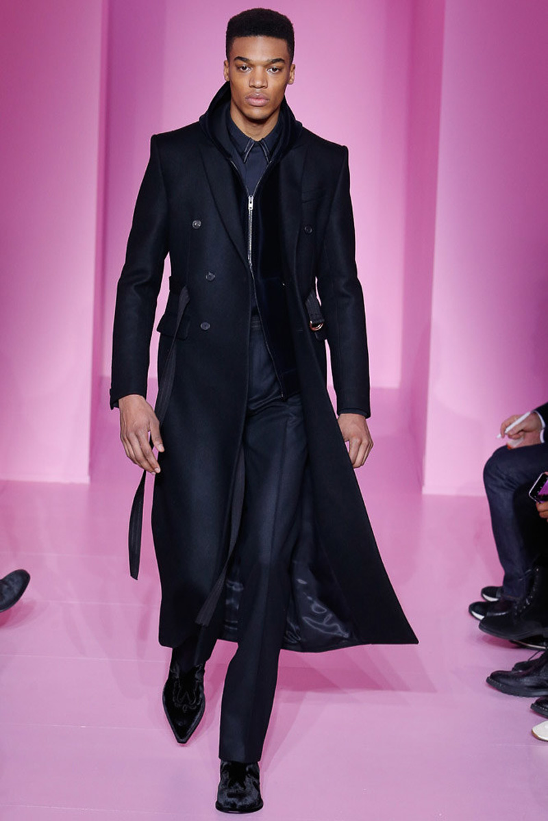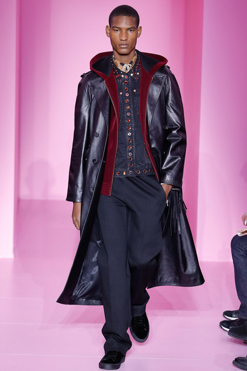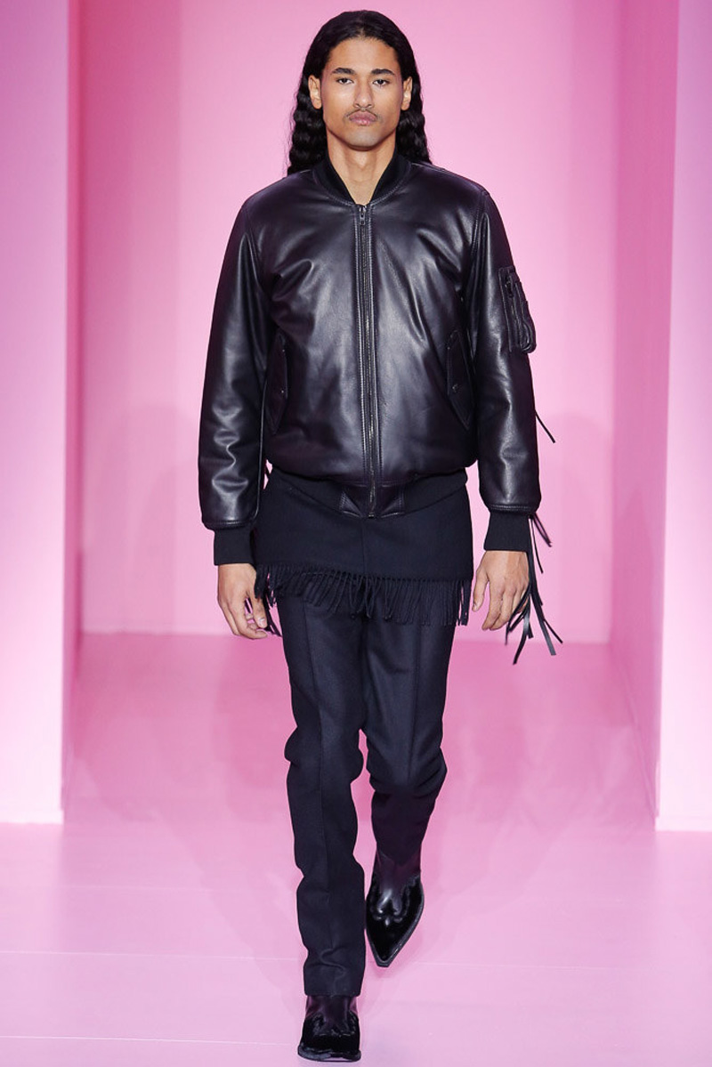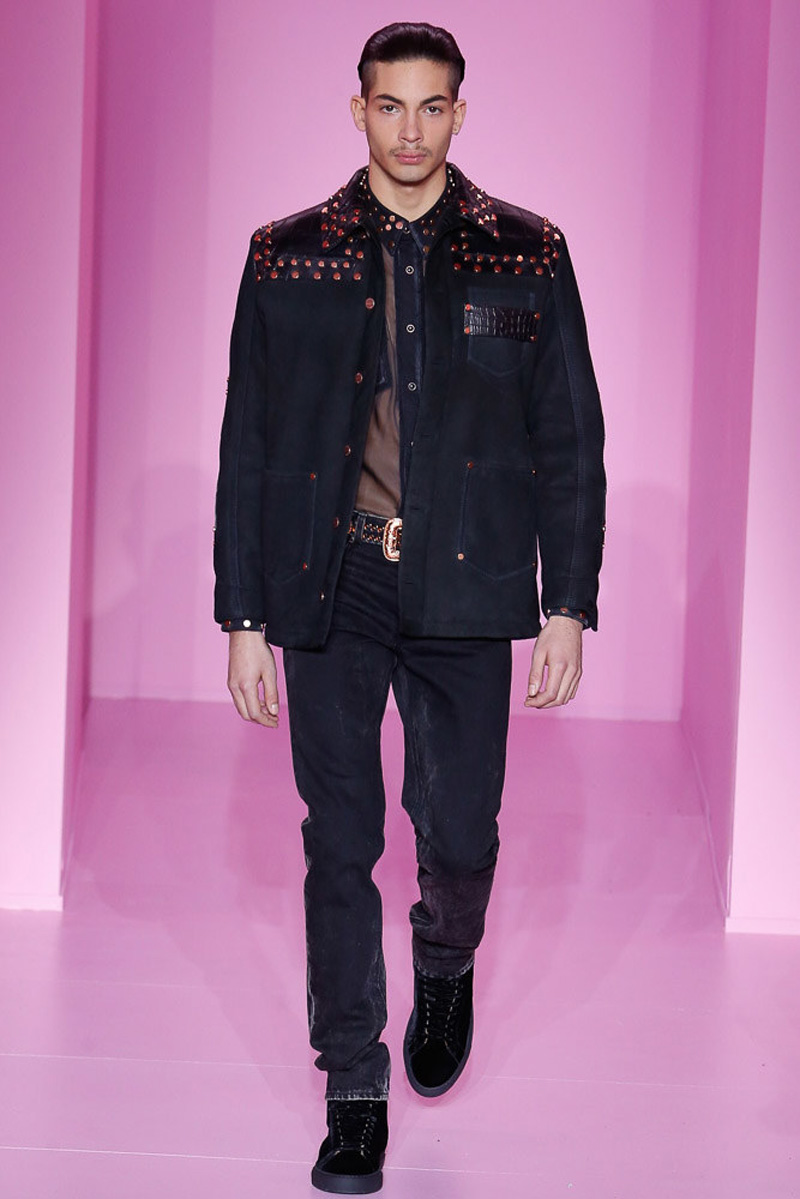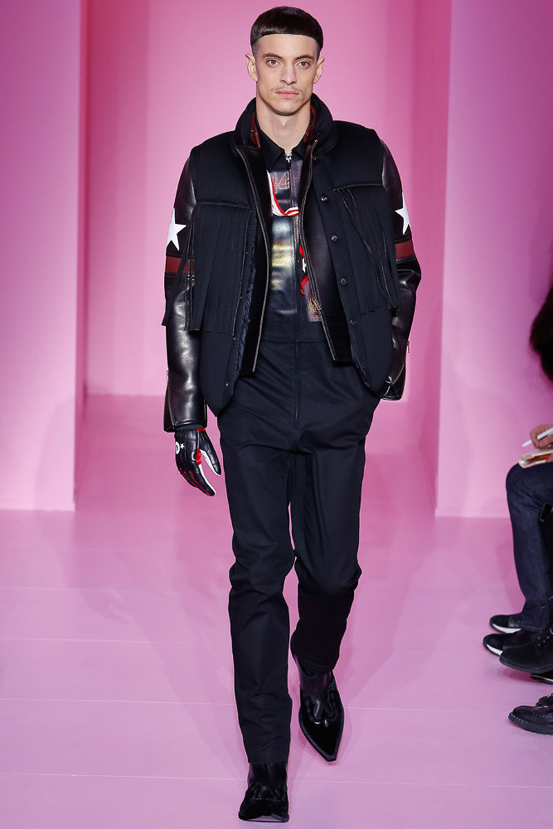 Givenchy creative director Riccardo Tisci offered a dark spin on western and Americana-inspired style for his fall-winter 2016 men’s collection. Sharp, trim tailoring received an instant update with lapels trimmed in fur and velvet. Boots accompanied the sartorial looks, finished in crushed velvet. Long boxy coats were embellished with patches of leather.
