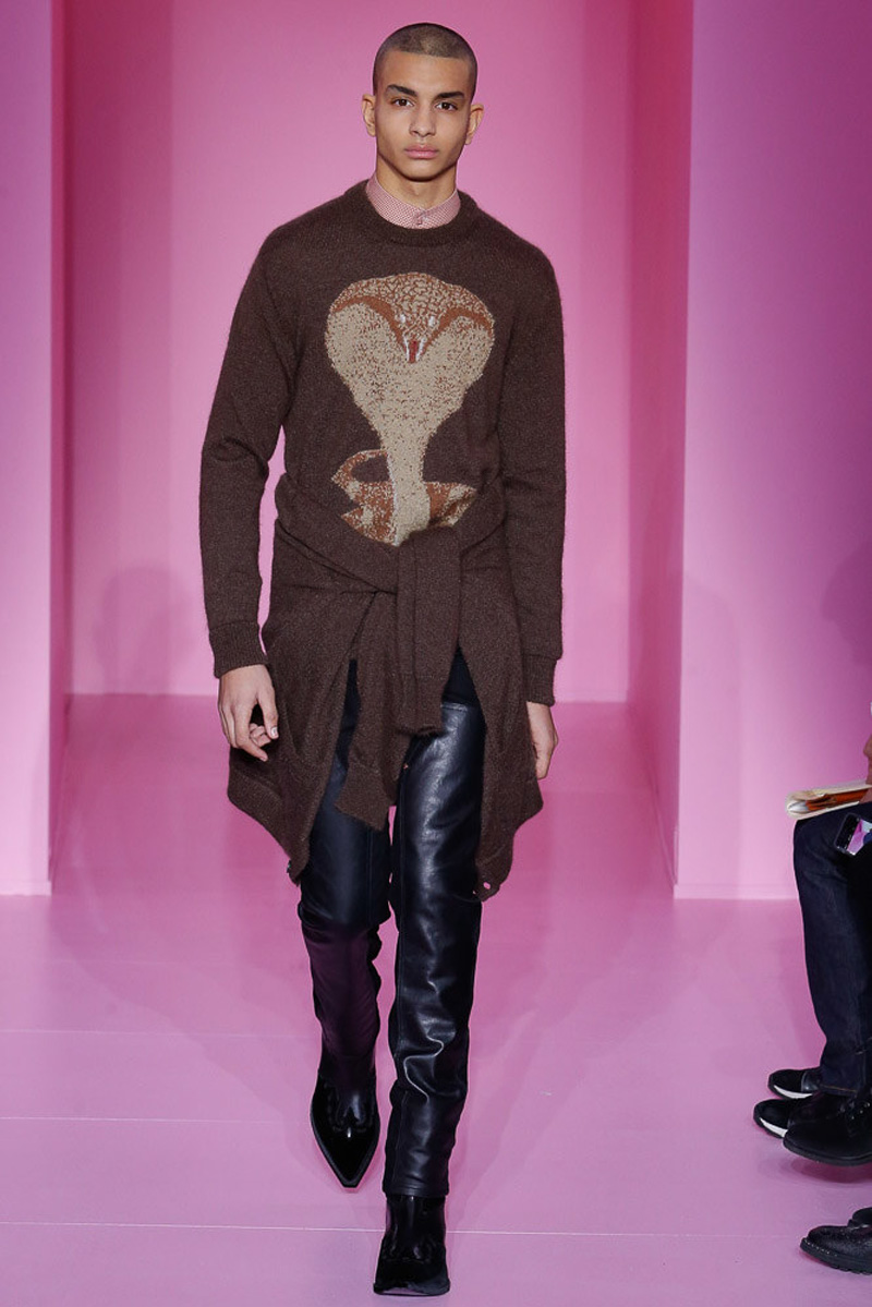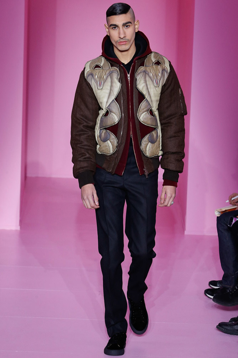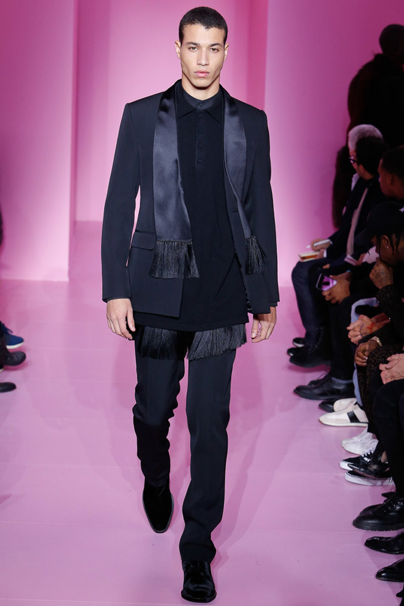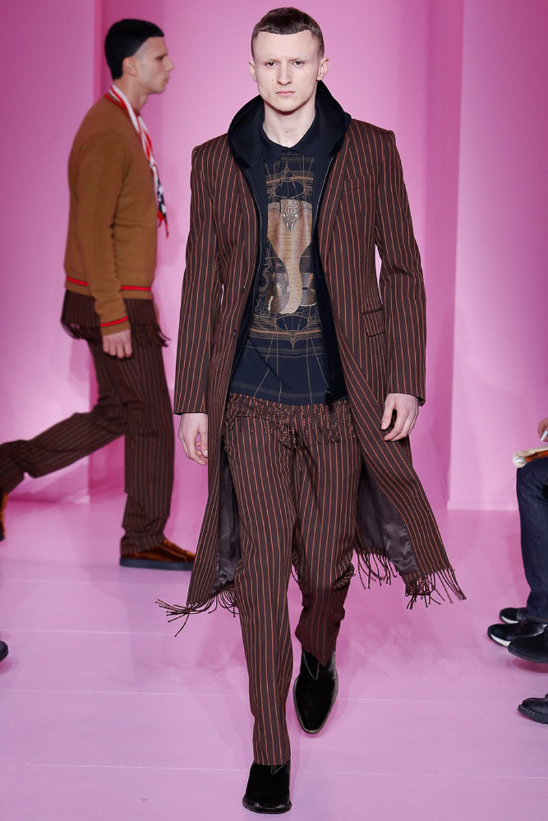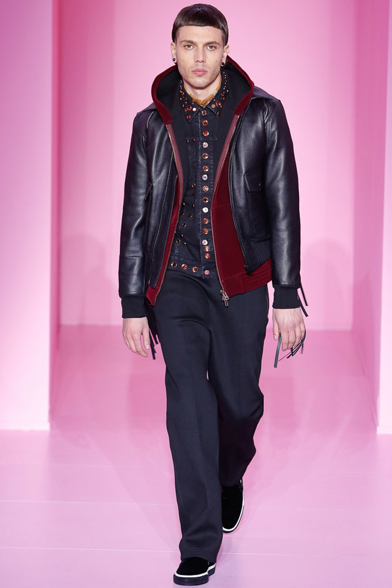 Givenchy creative director Riccardo Tisci offered a dark spin on western and Americana-inspired style for his fall-winter 2016 men’s collection. Sharp, trim tailoring received an instant update with lapels trimmed in fur and velvet. Boots accompanied the sartorial looks, finished in crushed velvet. Long boxy coats were embellished with patches of leather.