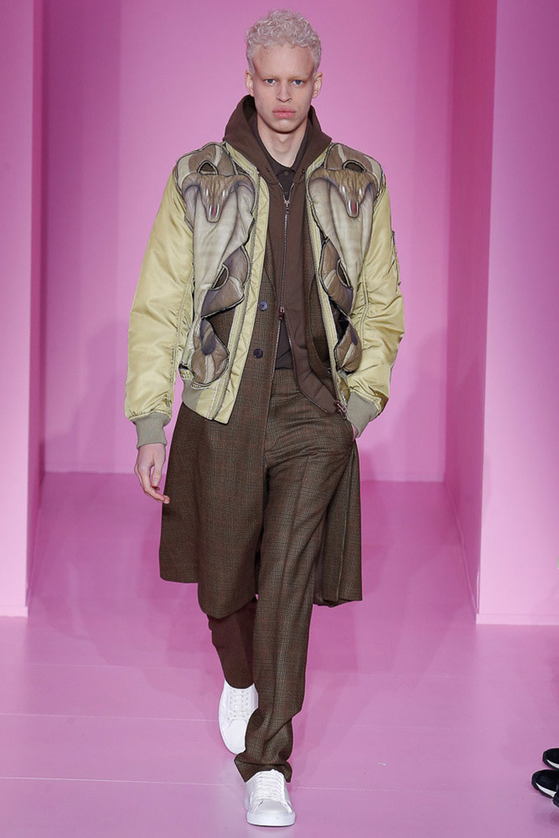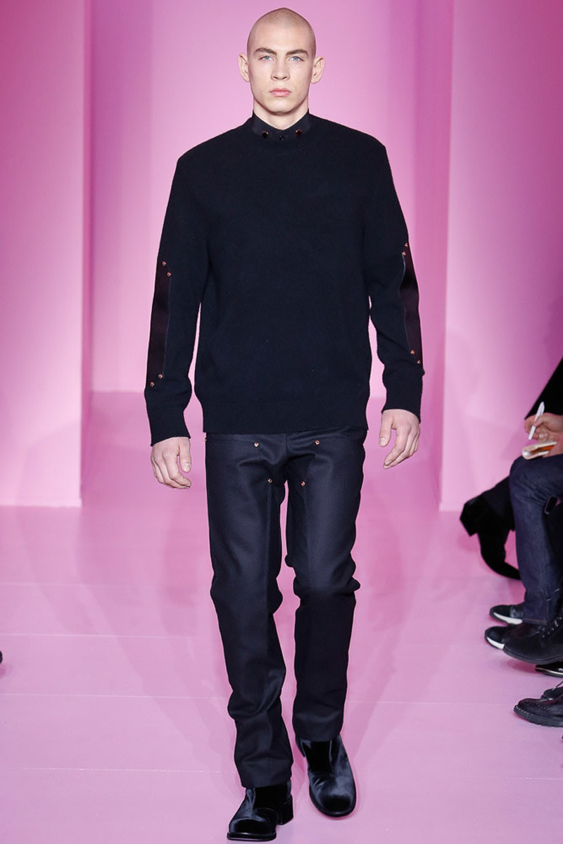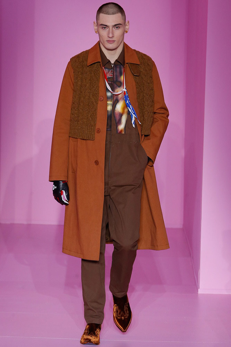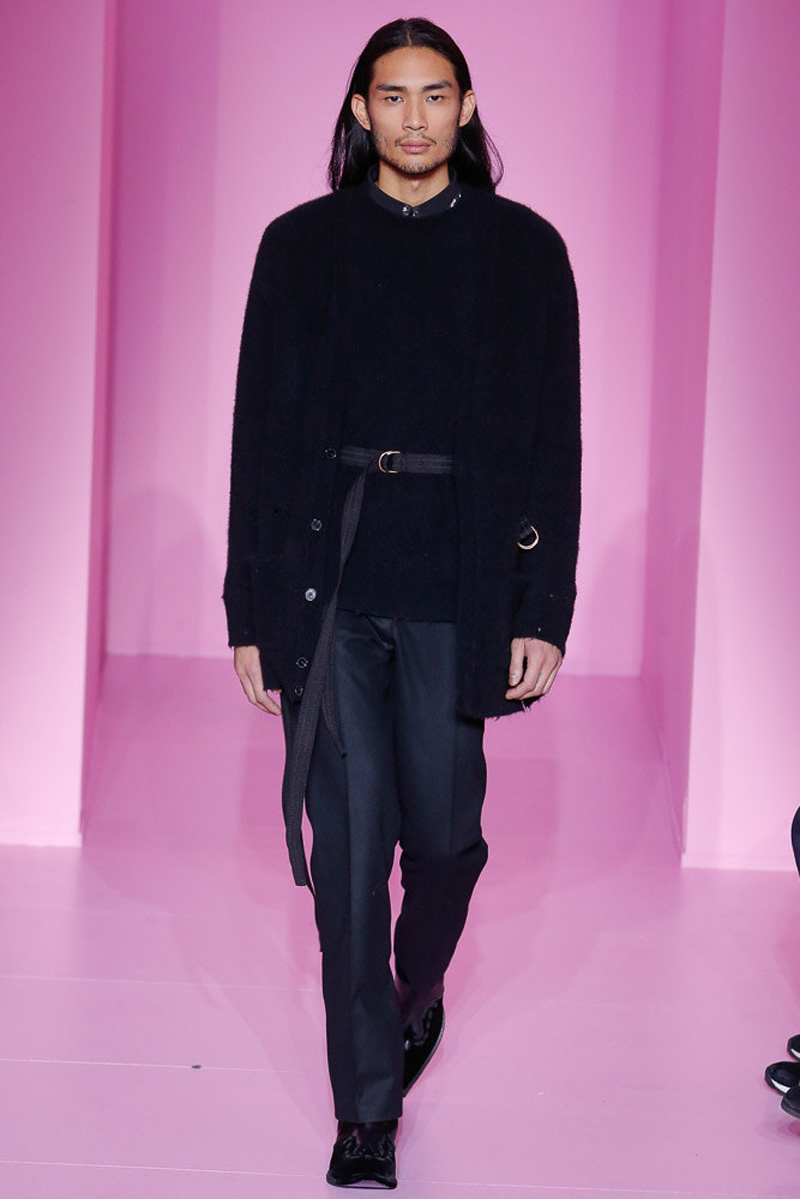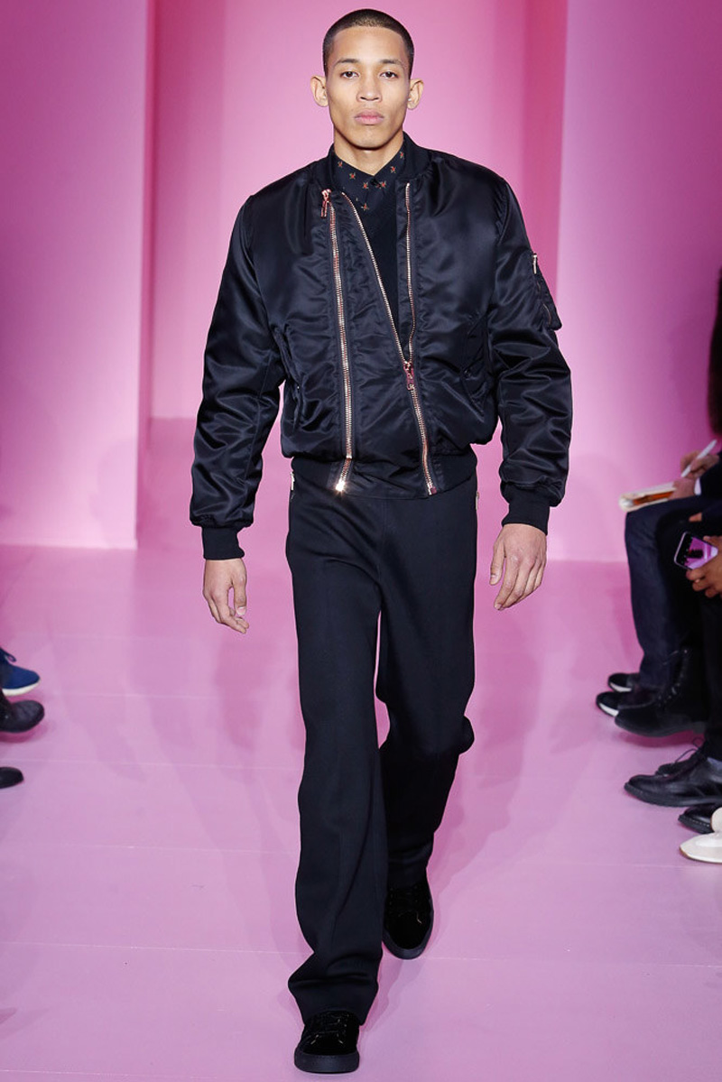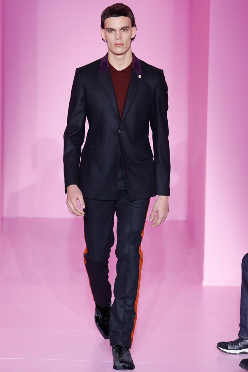 Givenchy creative director Riccardo Tisci offered a dark spin on western and Americana-inspired style for his fall-winter 2016 men’s collection. Sharp, trim tailoring received an instant update with lapels trimmed in fur and velvet. Boots accompanied the sartorial looks, finished in crushed velvet. Long boxy coats were embellished with patches of leather.