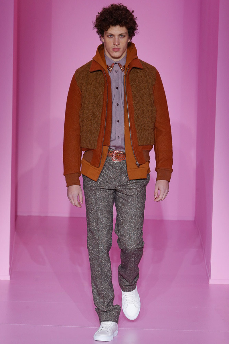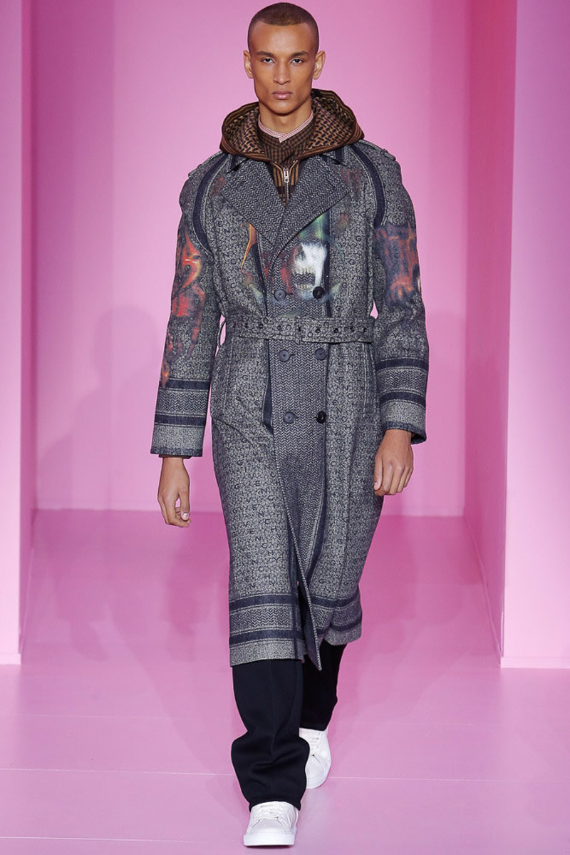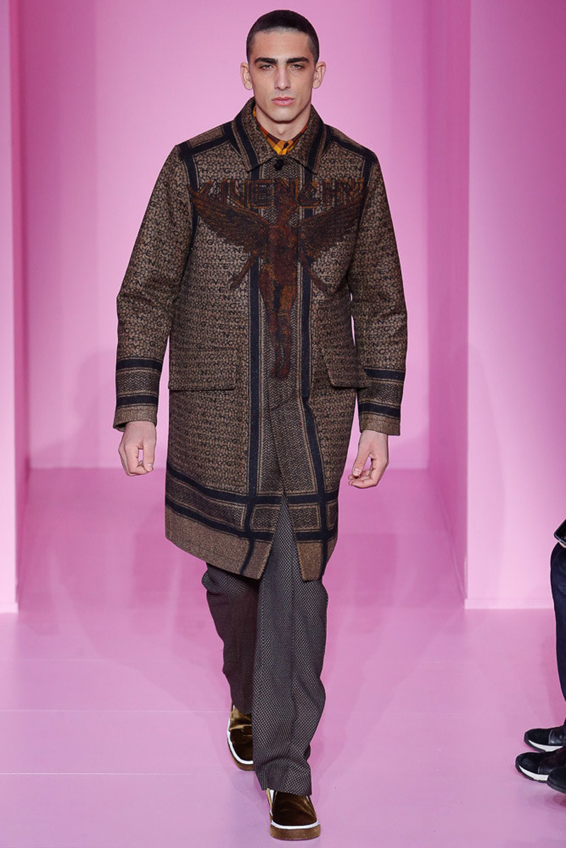 Updating a contemporary selection of hooded leather jackets and coats, Tisci added fringe to his design arsenal. Appearing alongside cable-knit adorned outerwear, Tisci’s fringed approach to the season still left room for Givenchy’s signature stars and stripes. The prints were scaled down and juxtaposed with dark images of skulls and angels. Rounding out the season with an earthy moment, brown tweeds and plaid offered a grounded counterpoint to sporty bomber jackets.