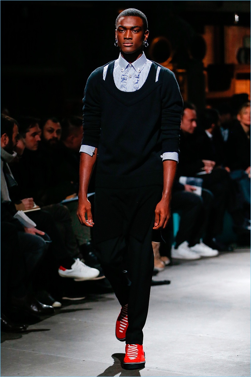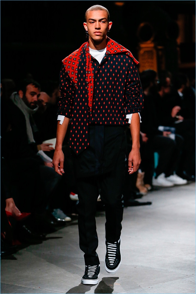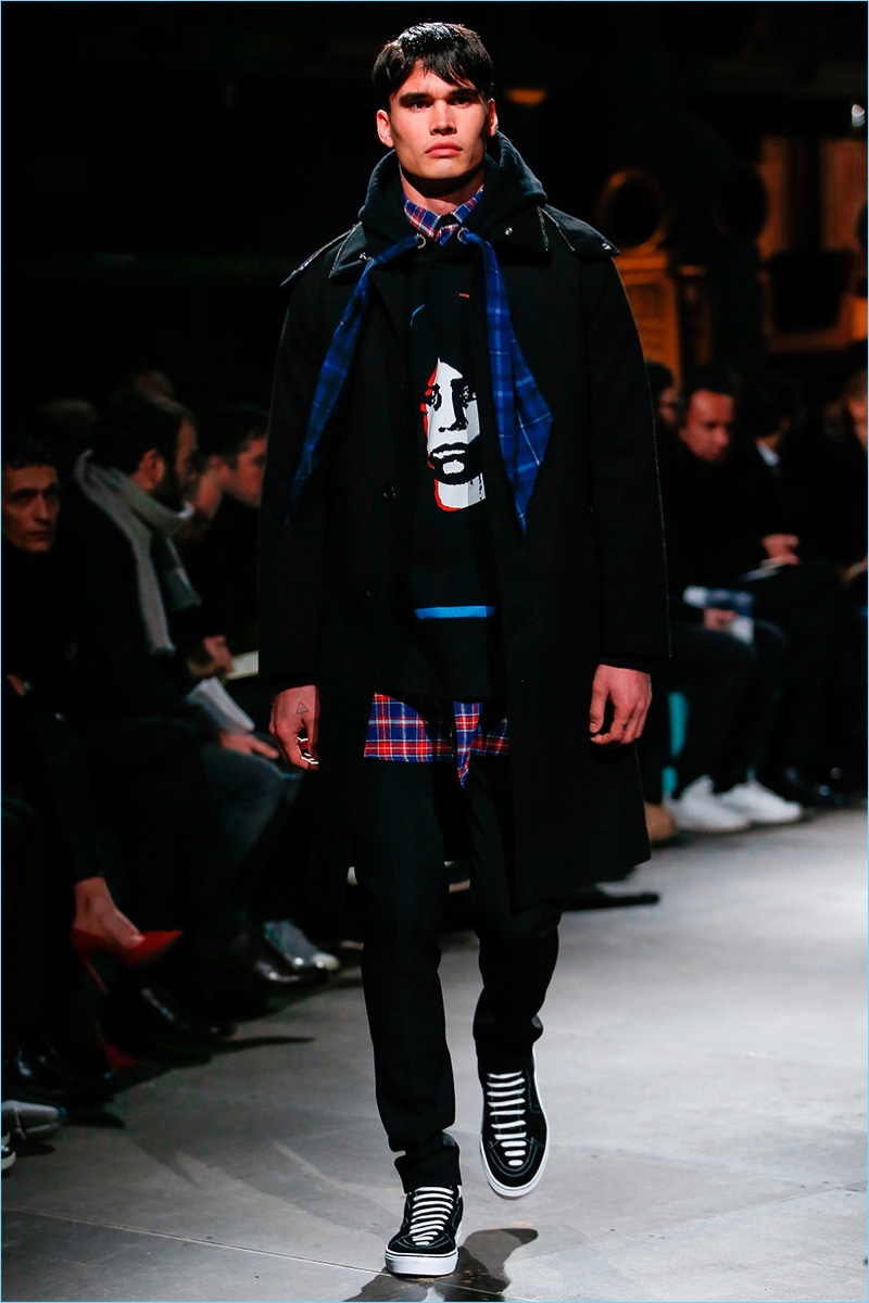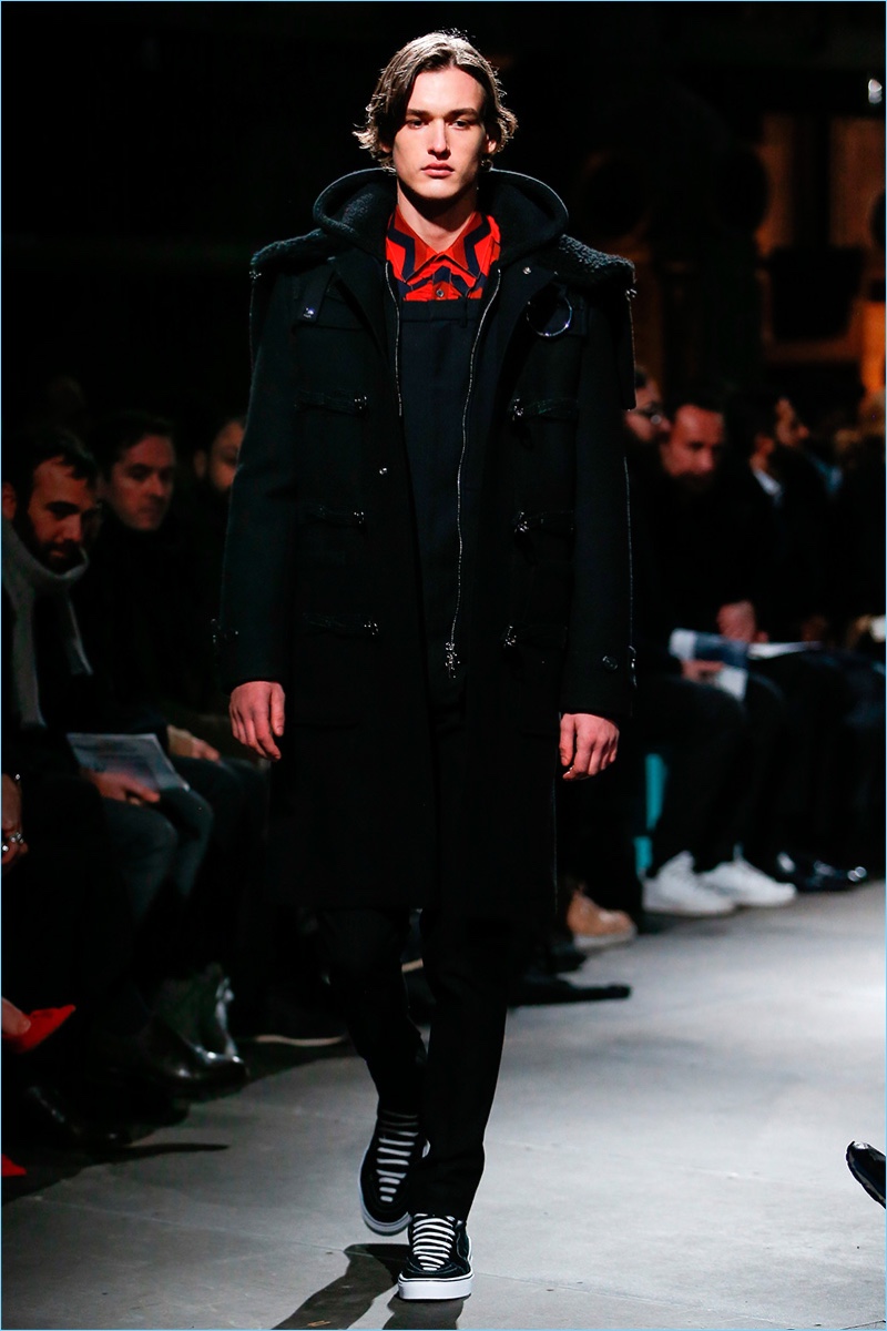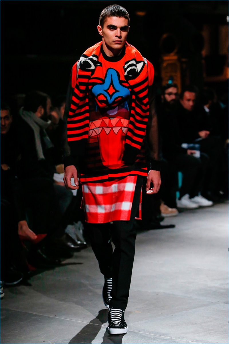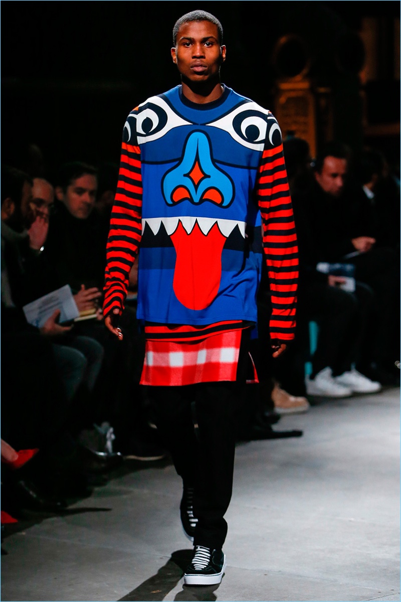 Givenchy creative director Riccardo Tisci looks to the American west as the inspiration of his fall-winter 2017 men’s collection. Referencing totem poles and stripes, Tisci turns out another graphic outing for the Parisian fashion house. Red, black, white, and blue contribute to the season’s color palette with a lineup of endless separates. A youthful flair flourishes with skate-inspired sneakers and oversized button details. Meanwhile, striped knitwear, tailored duffle coats, plaid shirting, and baseball tees round out the range.