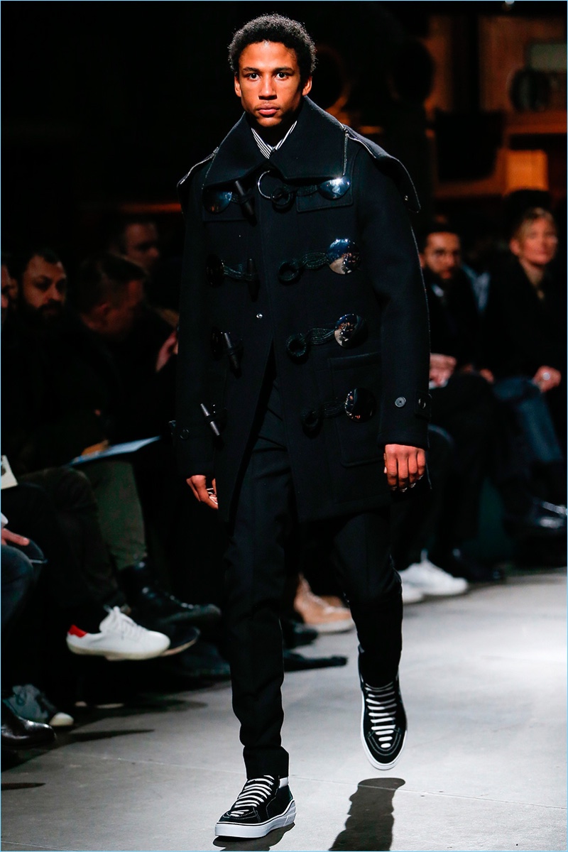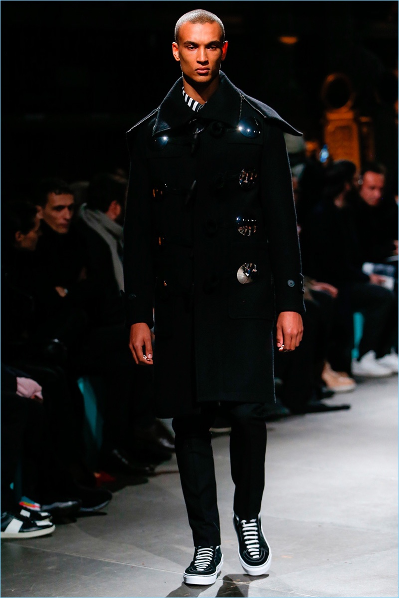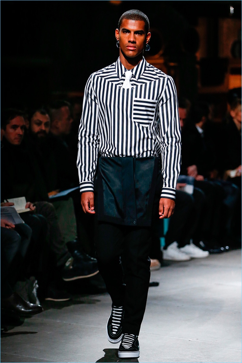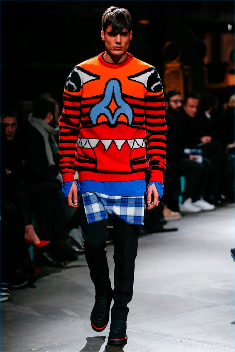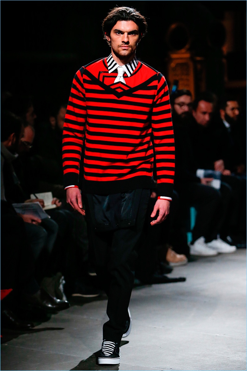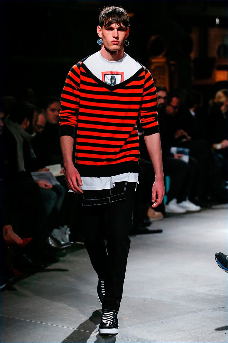Givenchy creative director Riccardo Tisci looks to the American west as the inspiration of his fall-winter 2017 men’s collection. Referencing totem poles and stripes, Tisci turns out another graphic outing for the Parisian fashion house. Red, black, white, and blue contribute to the season’s color palette with a lineup of endless separates. A youthful flair flourishes with skate-inspired sneakers and oversized button details. Meanwhile, striped knitwear, tailored duffle coats, plaid shirting, and baseball tees round out the range.