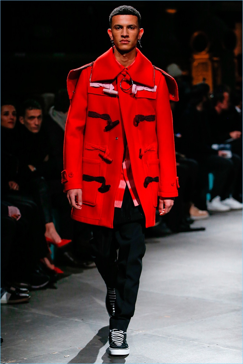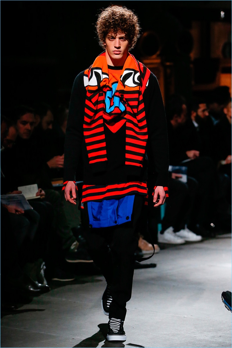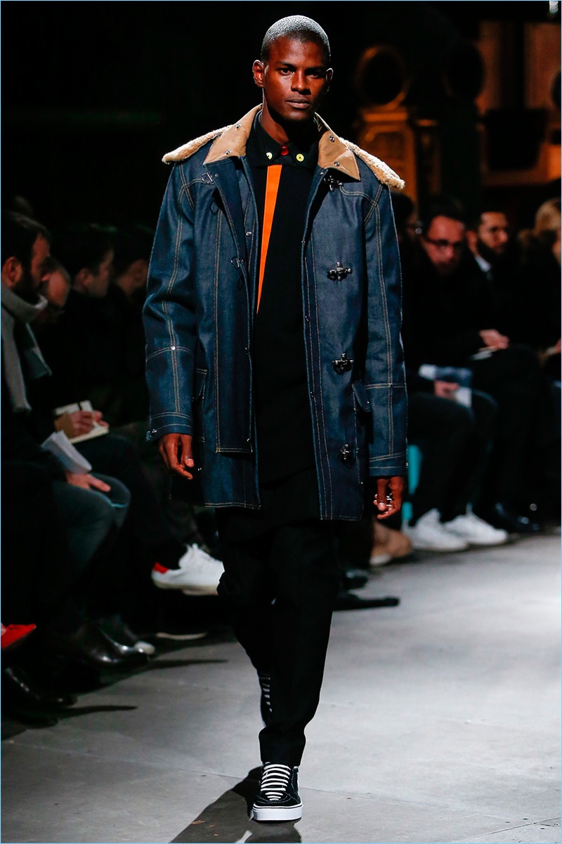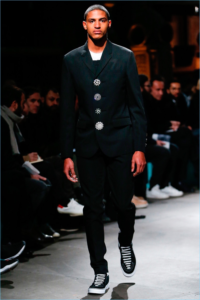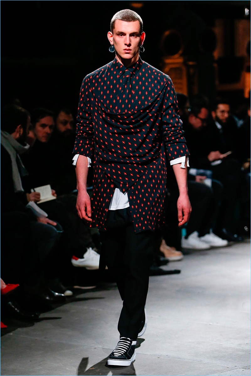 Givenchy creative director Riccardo Tisci looks to the American west as the inspiration of his fall-winter 2017 men’s collection. Referencing totem poles and stripes, Tisci turns out another graphic outing for the Parisian fashion house. Red, black, white, and blue contribute to the season’s color palette with a lineup of endless separates. A youthful flair flourishes with skate-inspired sneakers and oversized button details. Meanwhile, striped knitwear, tailored duffle coats, plaid shirting, and baseball tees round out the range.