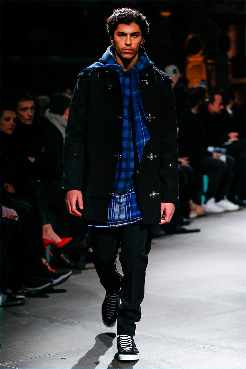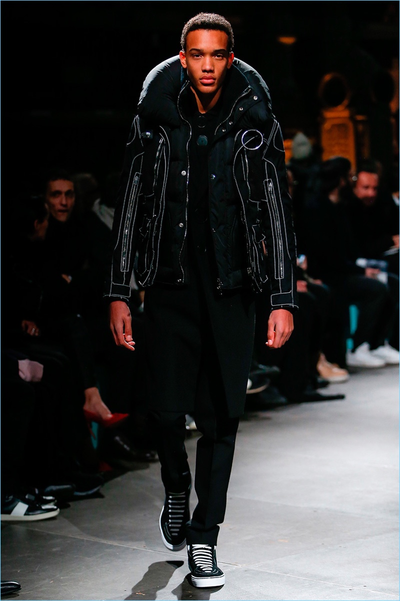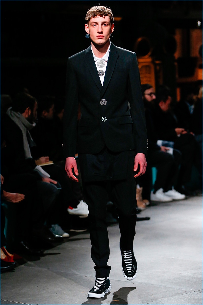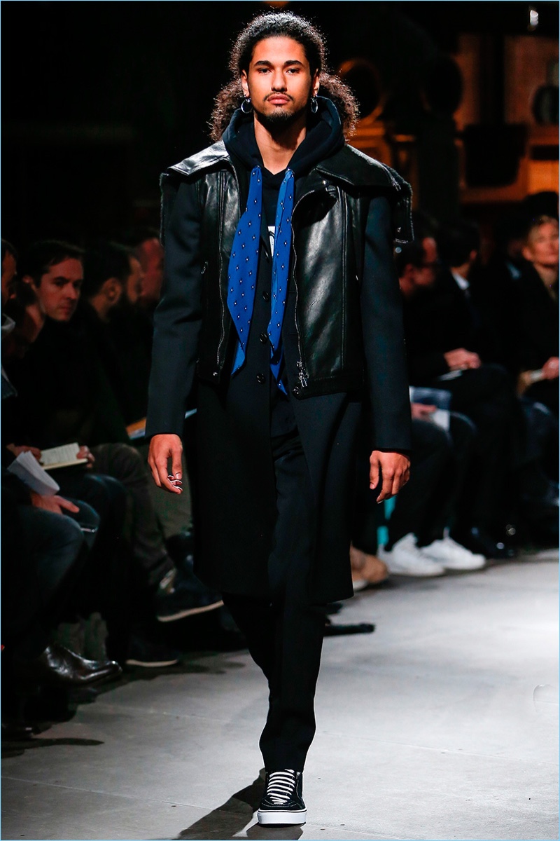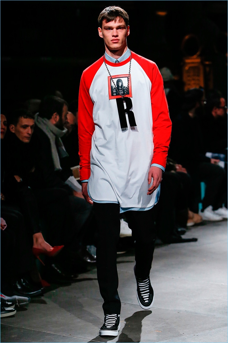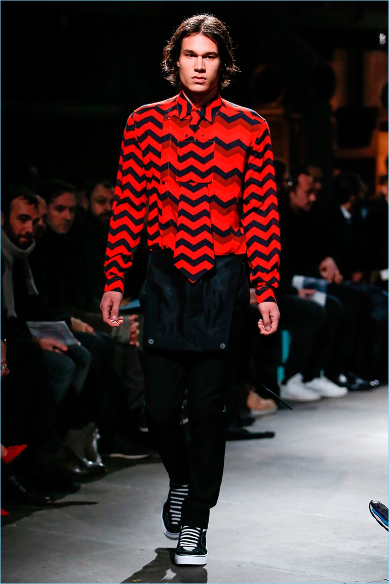 Givenchy creative director Riccardo Tisci looks to the American west as the inspiration of his fall-winter 2017 men’s collection. Referencing totem poles and stripes, Tisci turns out another graphic outing for the Parisian fashion house. Red, black, white, and blue contribute to the season’s color palette with a lineup of endless separates. A youthful flair flourishes with skate-inspired sneakers and oversized button details. Meanwhile, striped knitwear, tailored duffle coats, plaid shirting, and baseball tees round out the range.