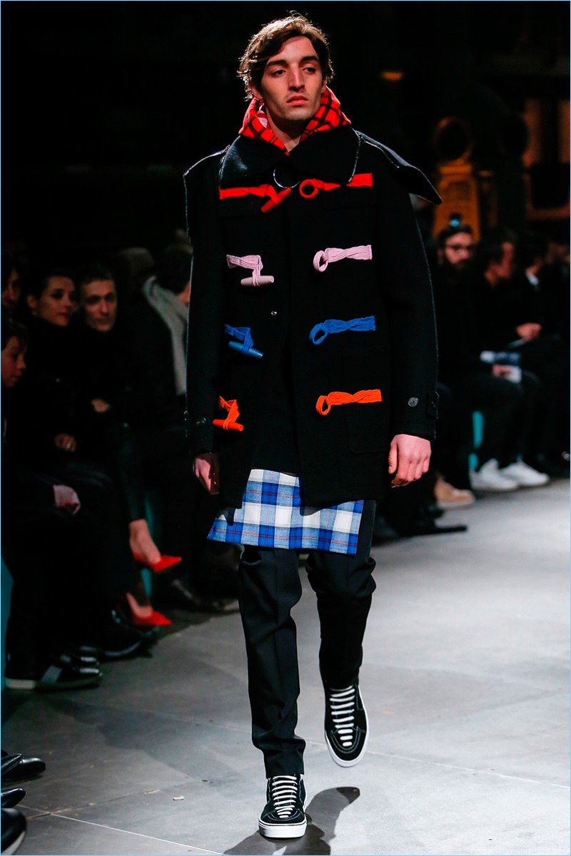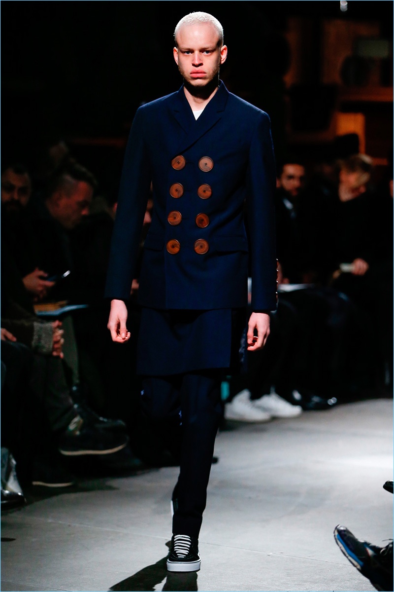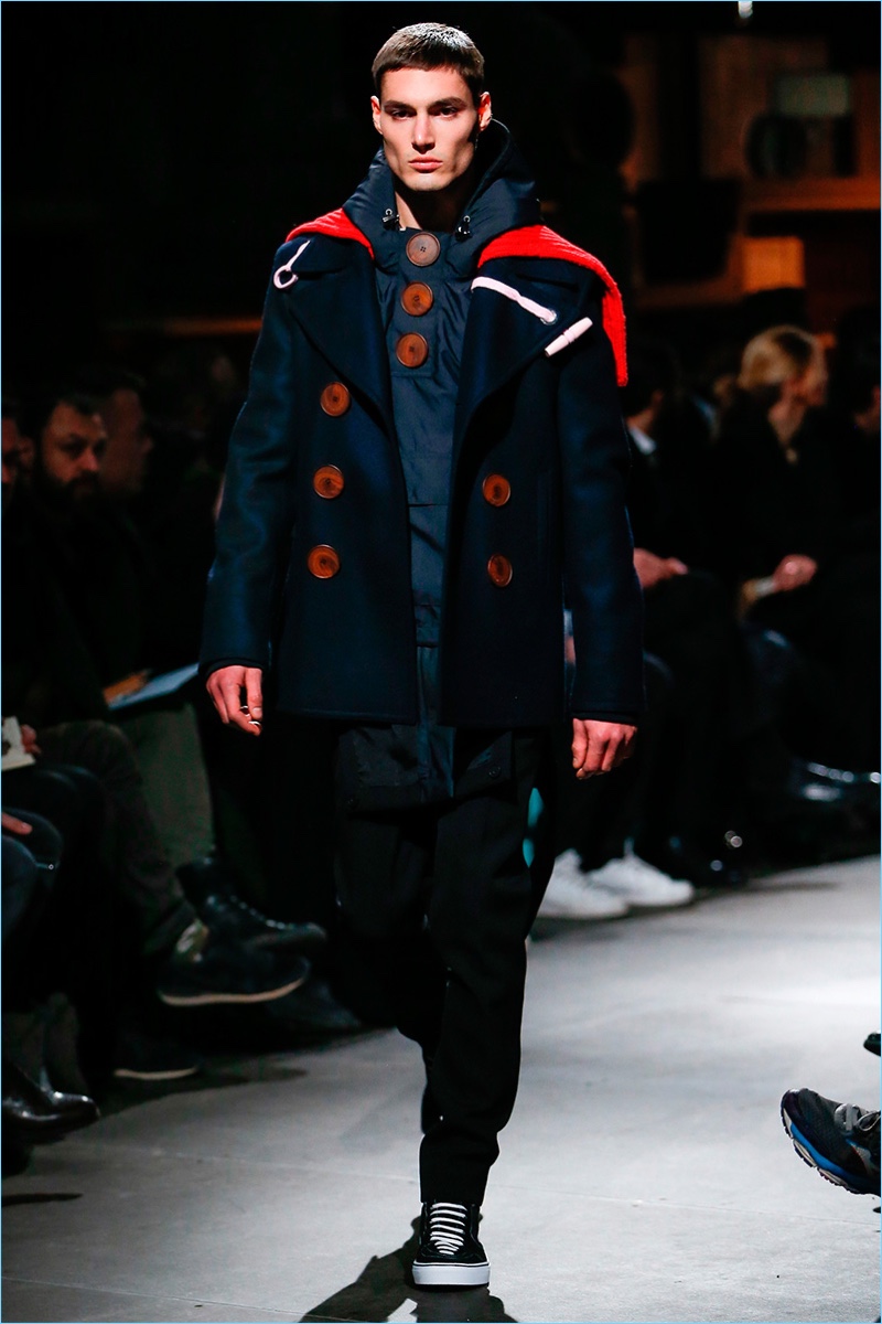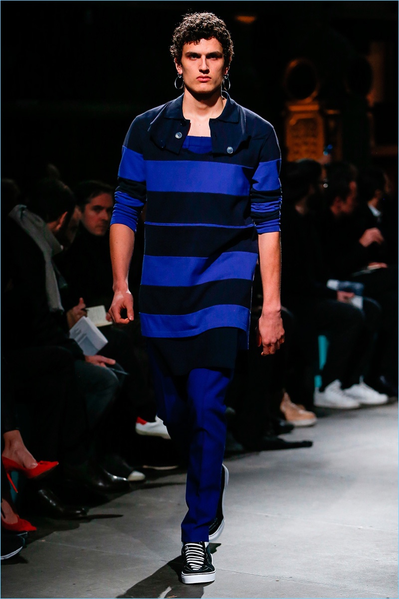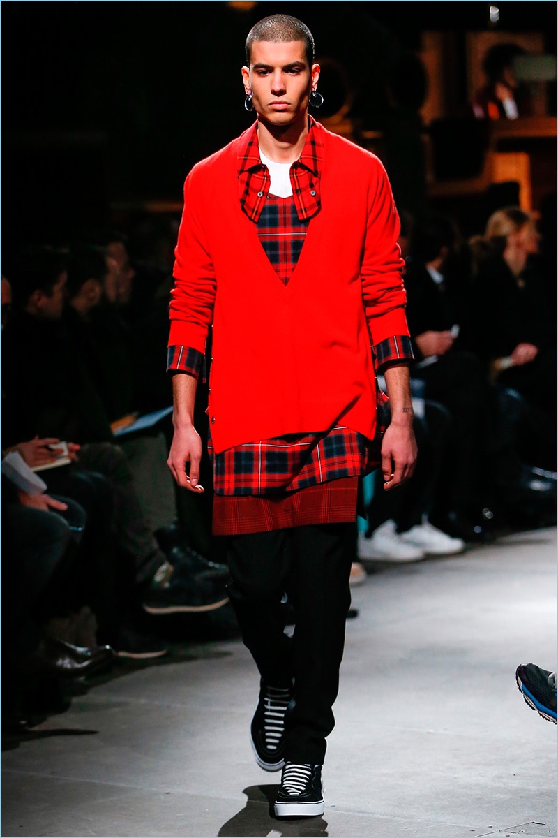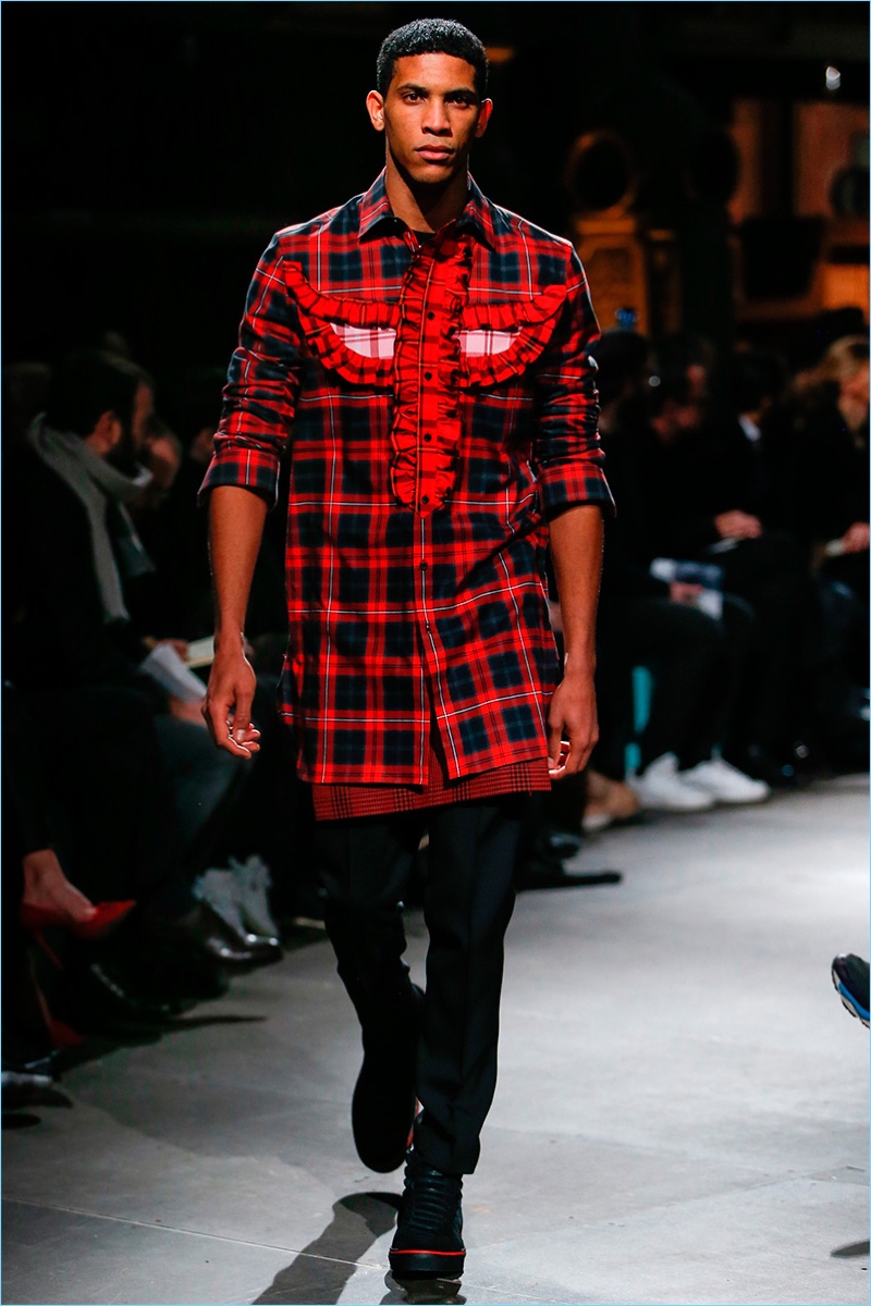 Givenchy creative director Riccardo Tisci looks to the American west as the inspiration of his fall-winter 2017 men’s collection. Referencing totem poles and stripes, Tisci turns out another graphic outing for the Parisian fashion house. Red, black, white, and blue contribute to the season’s color palette with a lineup of endless separates. A youthful flair flourishes with skate-inspired sneakers and oversized button details. Meanwhile, striped knitwear, tailored duffle coats, plaid shirting, and baseball tees round out the range.