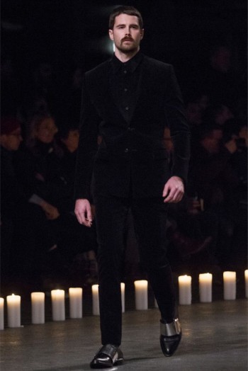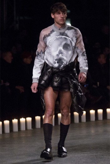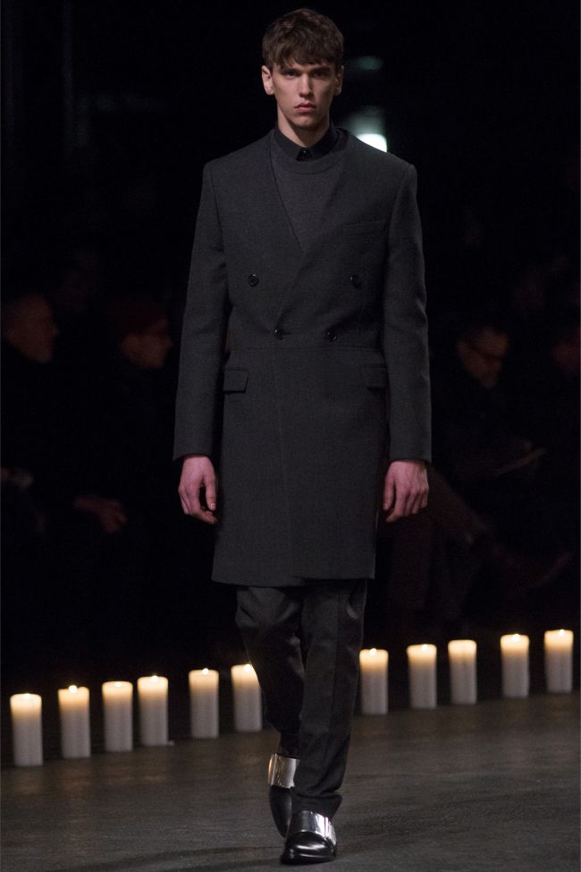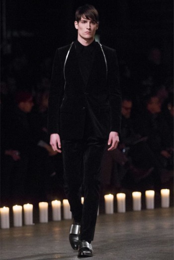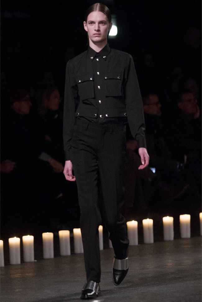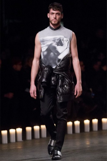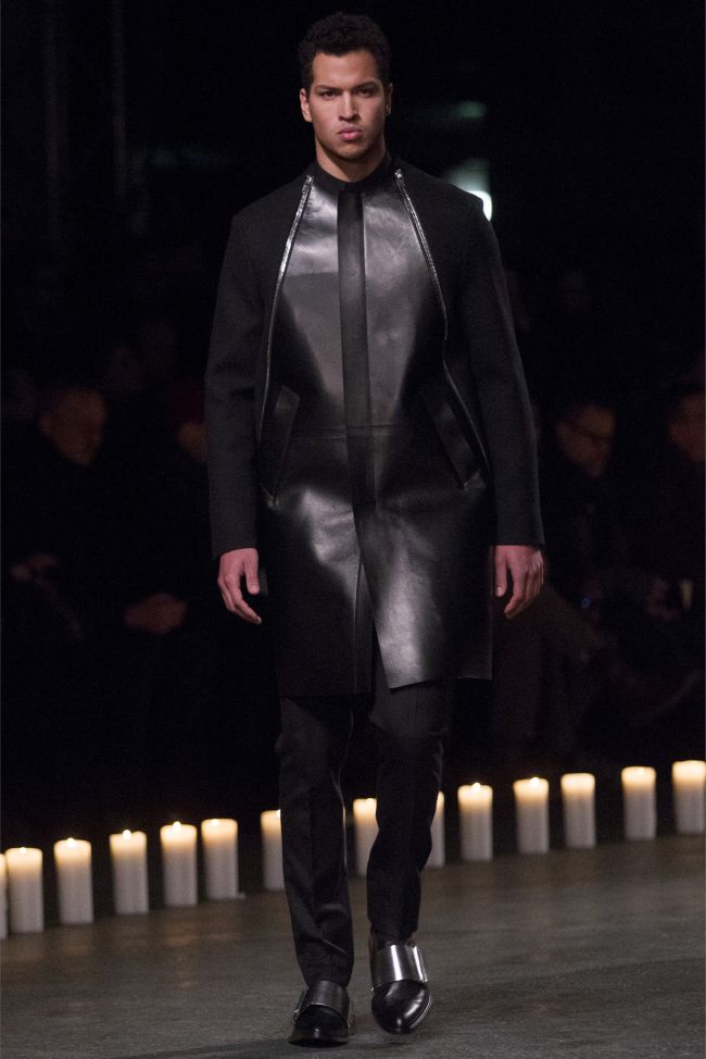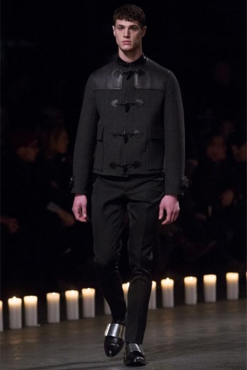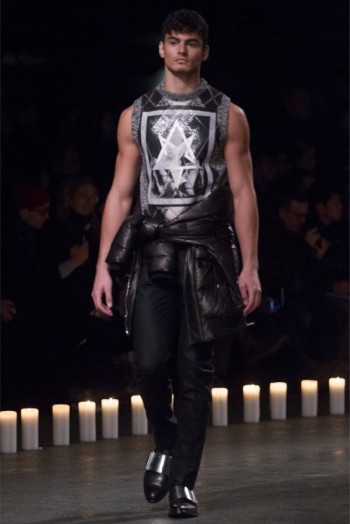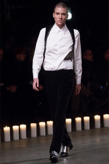 Changing Guard-Removing color from the conscious and opting for a black & white show, Givenchy creative director Riccardo Tisci took his brave men in a new direction for the fall/winter 2013 season. Touching upon religious undertones from the previous season but evolving, the new Givenchy man took up armor for a combative season ahead. Accented with photographs taken by Robert Mapplethorpe, the latest lineup maintained a certain strictness. Shoes were topped with silver plates, skirts replaced by jackets tied at the waist, the field jacket reinterpreted as a leather shirt and countless interpretations of classic menswear essentials represented as armor. Altogether decisive and sleek, Tisci’s fall painted a subdued picture where the details reigned as king.