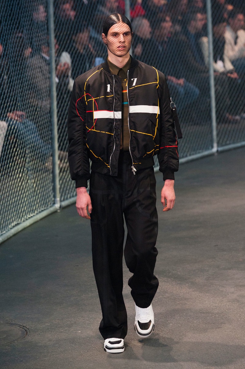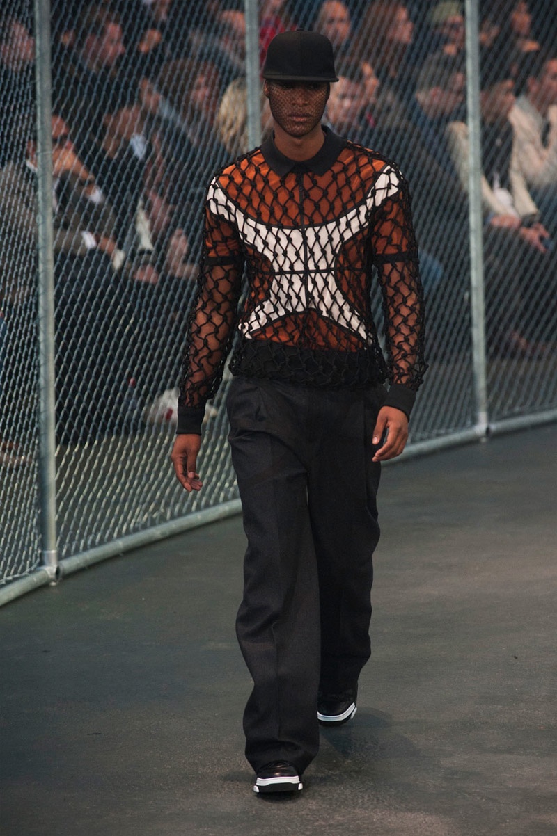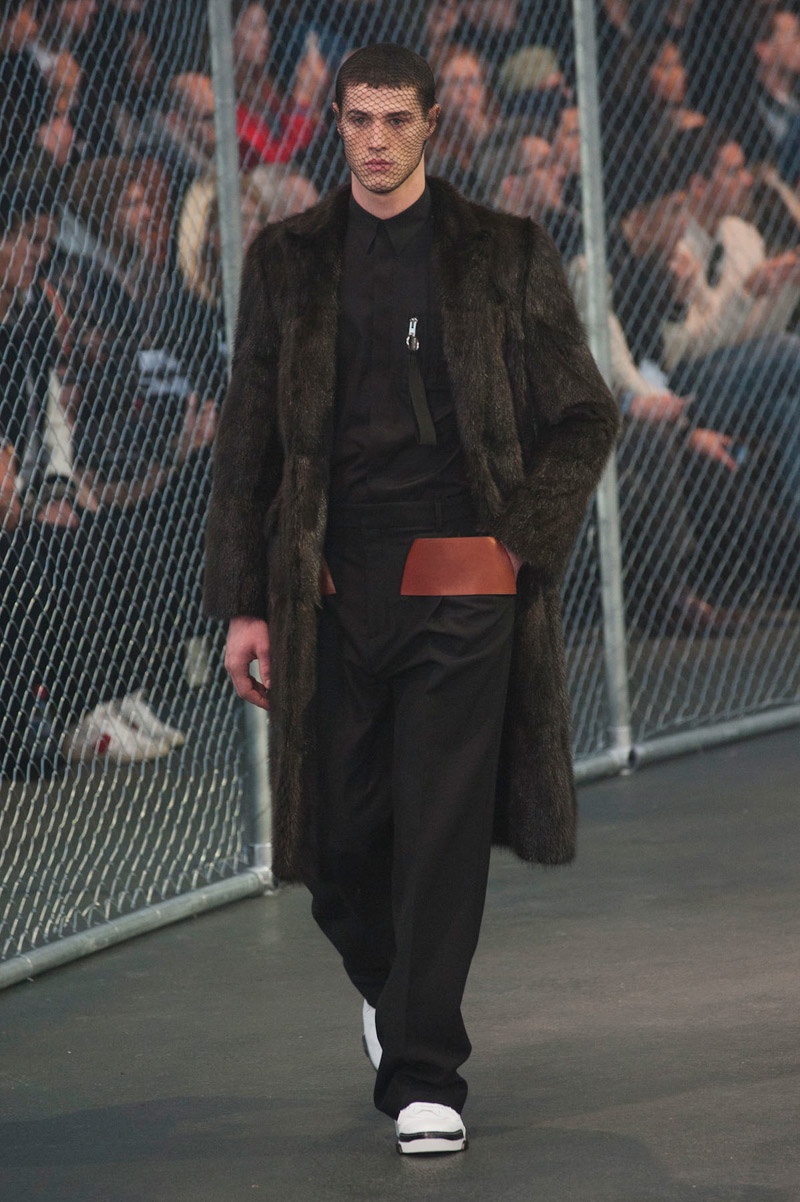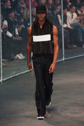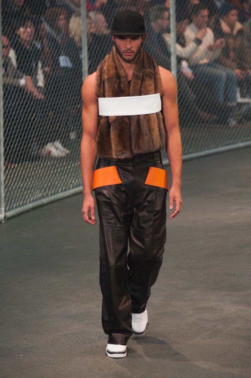 Givenchy Fall/Winter 2014-Presenting his latest collection for French fashion house Givenchy, creative director Riccardo Tisci truly challenged his man’s devotion to a streetwear-inspired aesthetic, turning to basketball for inspiration. Prompting his most urban collection to date, the sportiness of the occasion was juxtaposed with mesh-covered faces and slicked back hair. Oversized suits were presented as a minimal overture, while their flashier counterparts played into a series of blank canvases, covered in abstract prints. From sweatshirts and bombers to leather jackets, the basketball court was interpreted for graphic lines. Dispersed throughout the collection as a finishing touch, Tisci added fur, blending a casual sportiness with luxe ideas.