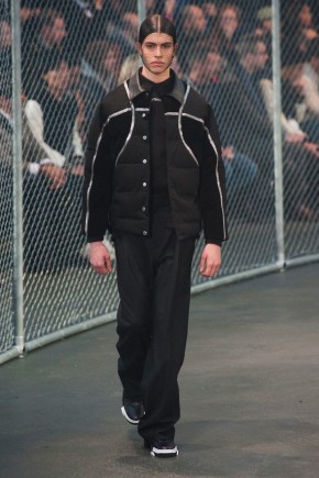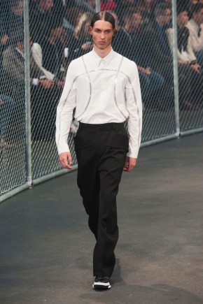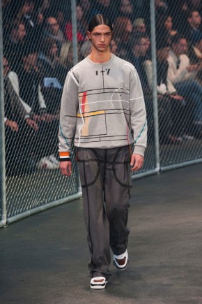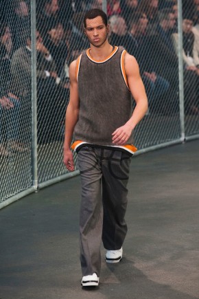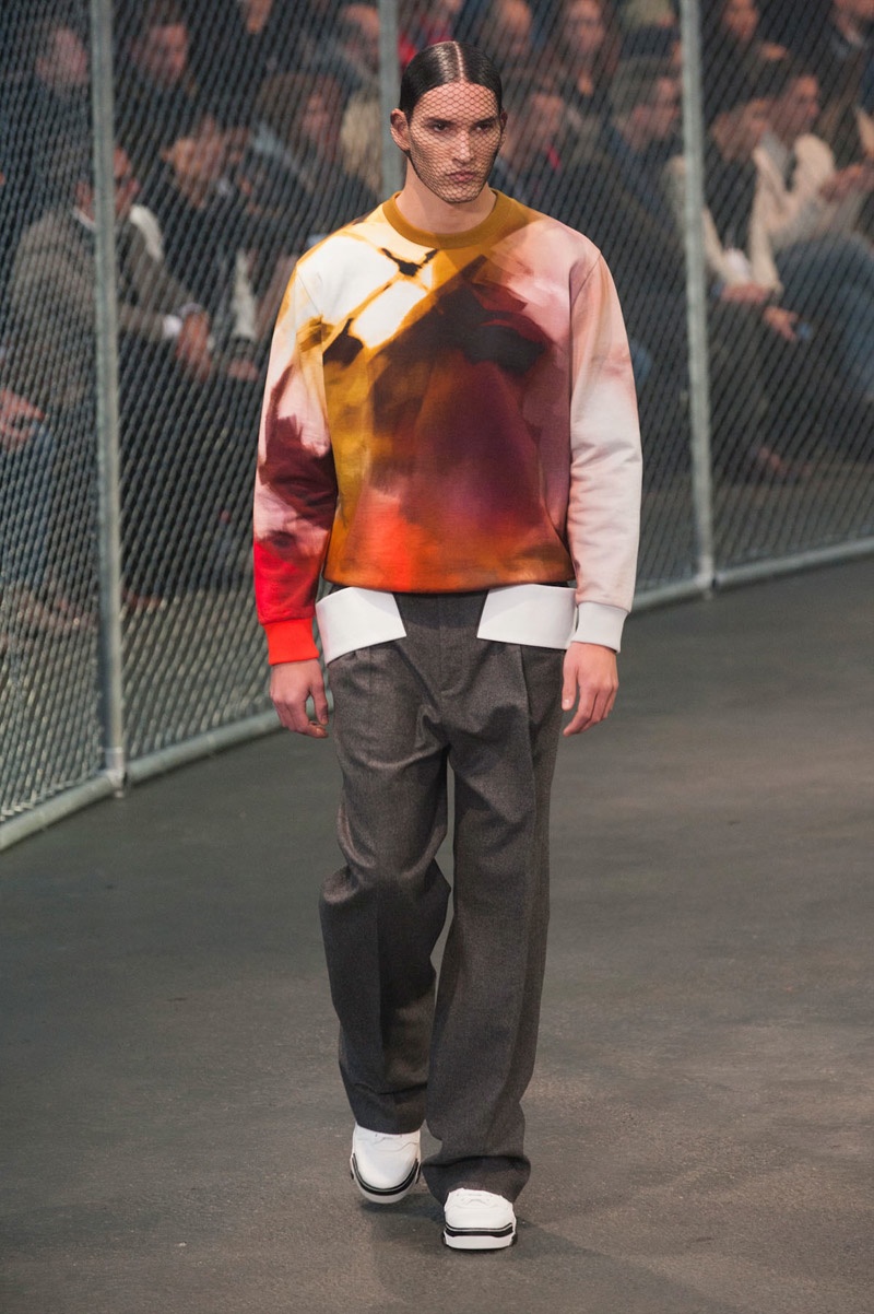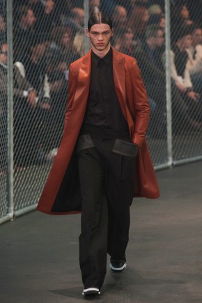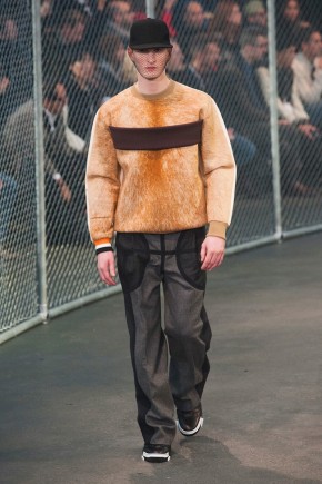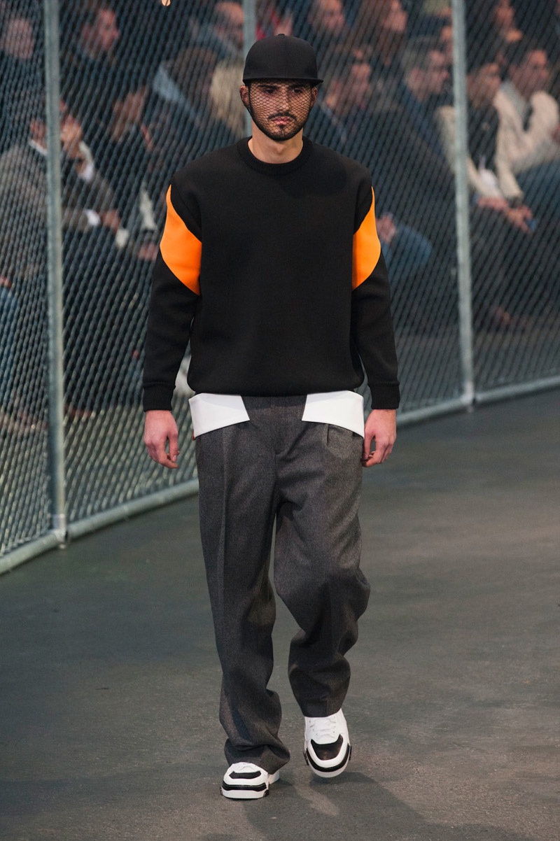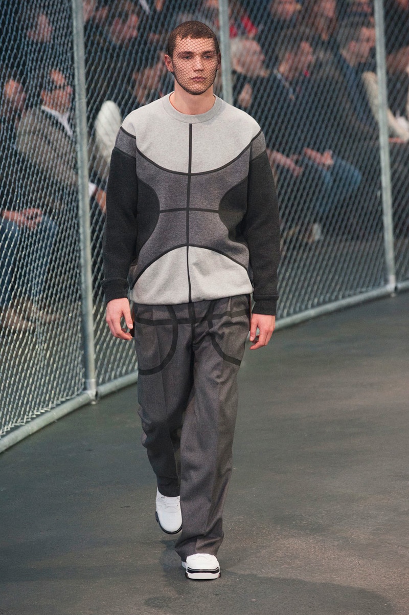 Givenchy Fall/Winter 2014-Presenting his latest collection for French fashion house Givenchy, creative director Riccardo Tisci truly challenged his man’s devotion to a streetwear-inspired aesthetic, turning to basketball for inspiration. Prompting his most urban collection to date, the sportiness of the occasion was juxtaposed with mesh-covered faces and slicked back hair. Oversized suits were presented as a minimal overture, while their flashier counterparts played into a series of blank canvases, covered in abstract prints. From sweatshirts and bombers to leather jackets, the basketball court was interpreted for graphic lines. Dispersed throughout the collection as a finishing touch, Tisci added fur, blending a casual sportiness with luxe ideas.