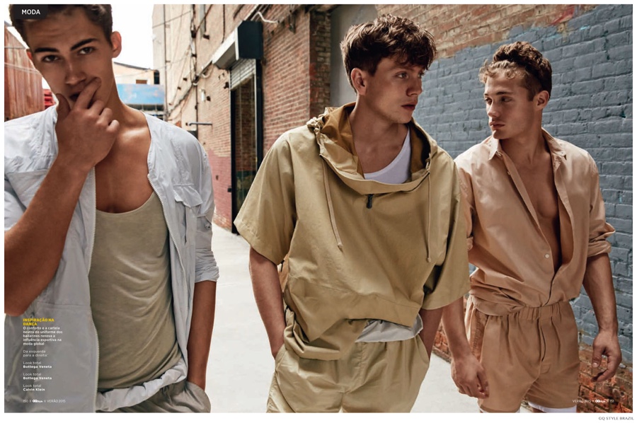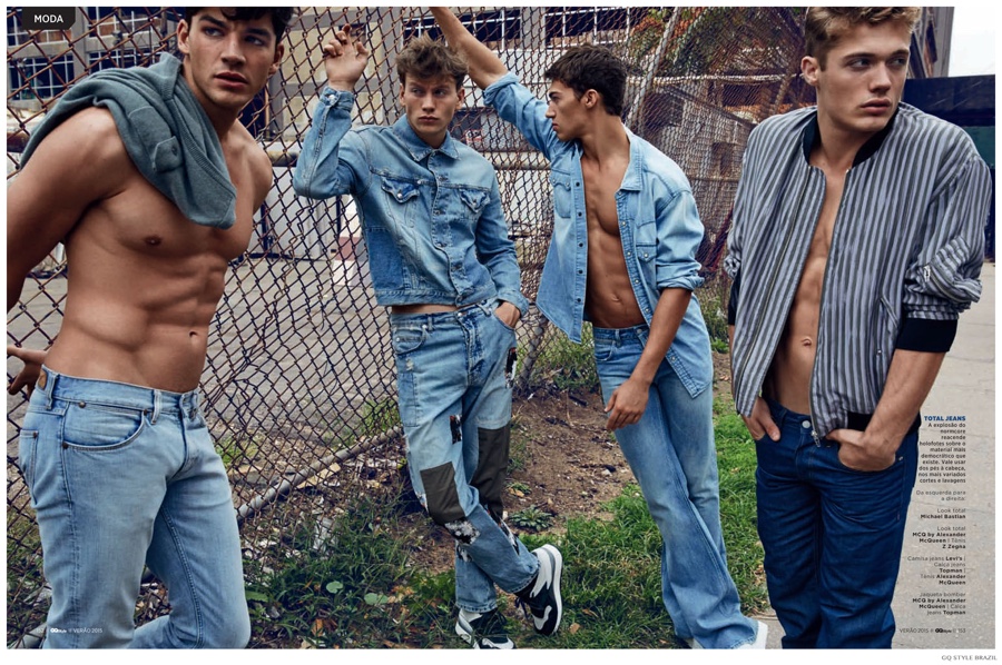 GQ Style Brasil embraces the global fashion scene with a new editorial featuring spring-summer 2015 looks from Prada, Dsquared2 and Alexander McQueen, among other labels. Styled by Antonio Branco and captured by the lens of photographer David Roemer (Atelier Management), models Alessio Pozzi, Steven Chevrin, Tarik Lakehal, Sid Ellisdon and Chris Hakos look their best in graphic prints, trendy denim pieces, relaxed silhouettes and more. / Grooming by Riad Azar (Atelier Management).