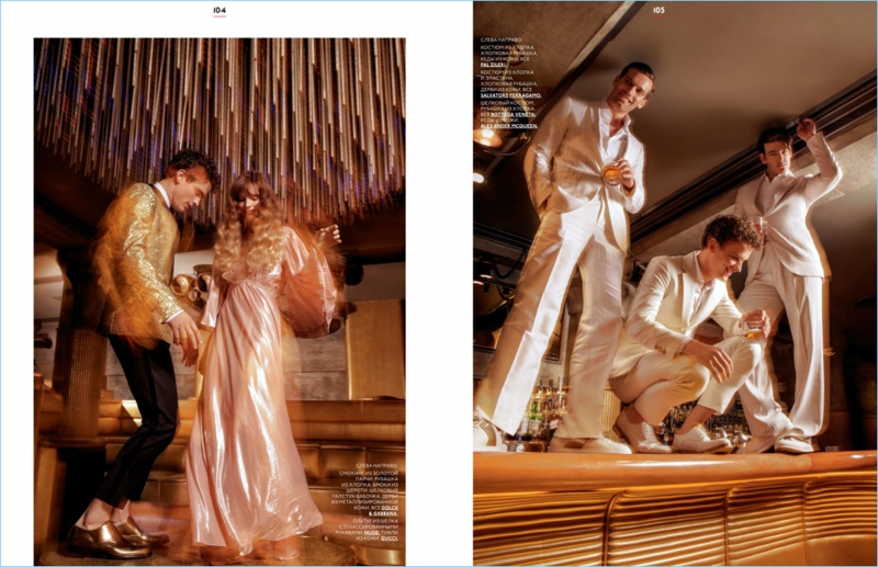 Simon Nessman, Justin Hopwood, and Sean Harju put on their best designer attire for a night out on the town. Joined by Grace Corton and Martina Dimitrova, the trio stars in an editorial for GQ Style Russia. Photographer Arnaldo Anaya-Lucca and stylist Vadim Galaganov join creative forces for the occasion. Galaganov pulls together an impressive lineup of tailoring. Dapper looks leave an impression with the likes of Dsquared2 and Gucci.