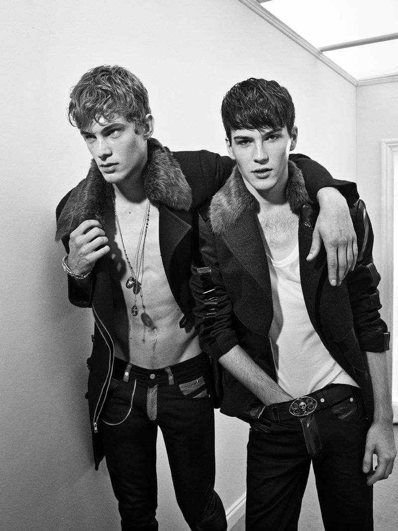 Boys Band–Panda models Greg Nawrat, Filip Grudzewski, and Wojtek Hare form a new band in Łukasz Stępień’s latest fall collection for Polish magazine Fashion. Stylist Andrzej Sobolewski (D’Vision Art) and photographers Michał Kar and Maciej Piórko team up to shoot the boys in a youth driven wardrobe featuring fur-laced jackets, motif dress shirts and sharp accessories to readily capture that strapping rock star look. / Hair by Marcin Het with makeup by Zosia Krasuska-Kopyt (D’Vision Art).