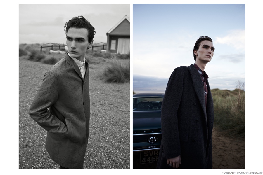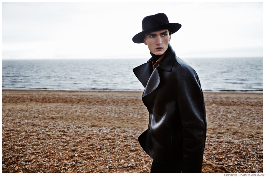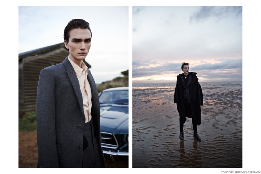 Channeling the energy of a young Johnny Cash, British model Gryphon O’Shea appears in the December 2014 edition of L’Officiel Hommes Germany. Venturing outdoors, Gryphon enjoys solitude as his tracks are covered by photographer Olgac Bozalp. Fashions from the likes of Hermes open up to a wardrobe of strong, tailored coats and suiting, pulled together by stylist Rose Forde. / Makeup by Michelle Dacillo. Hair by Atsushi Takita.