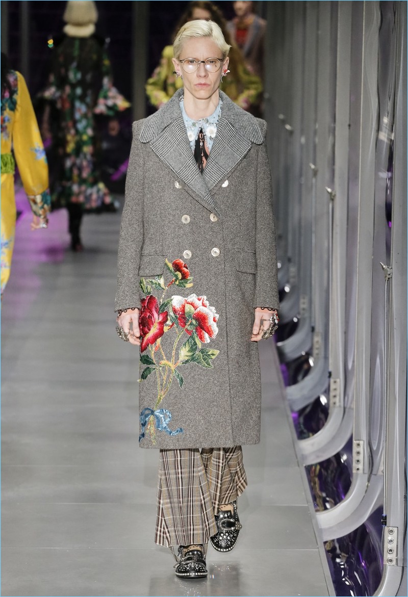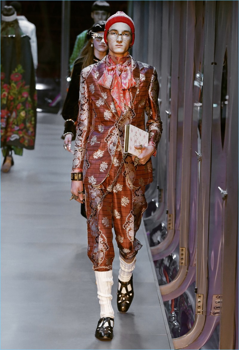 Gucci turns out a floral print suit for its fall-winter 2017 men’s collection.