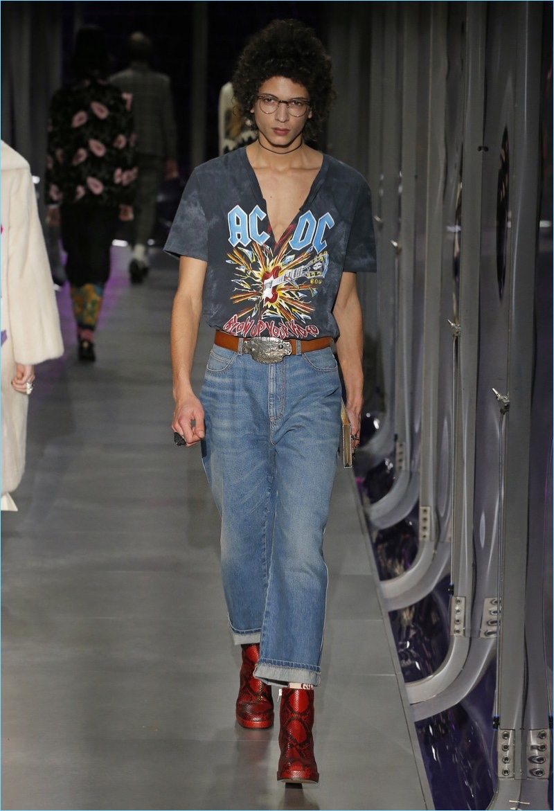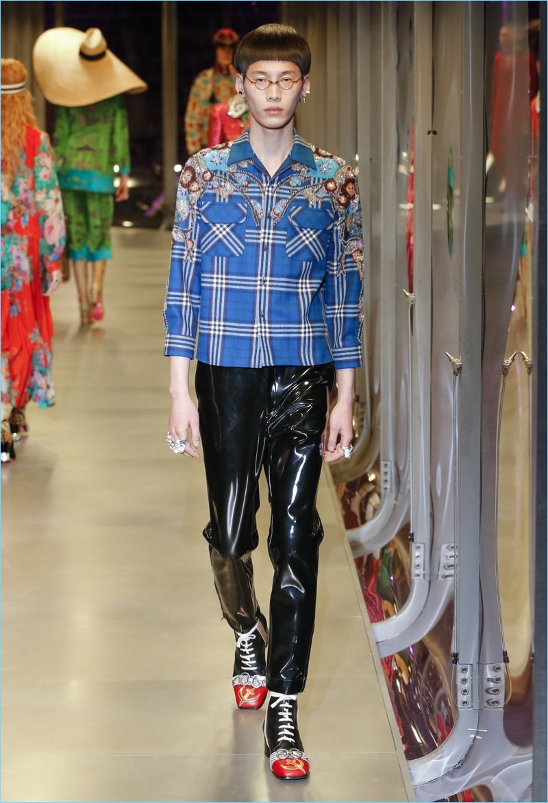 Overalls contribute to the style agenda for Gucci’s fall-winter 2017 men’s collection.