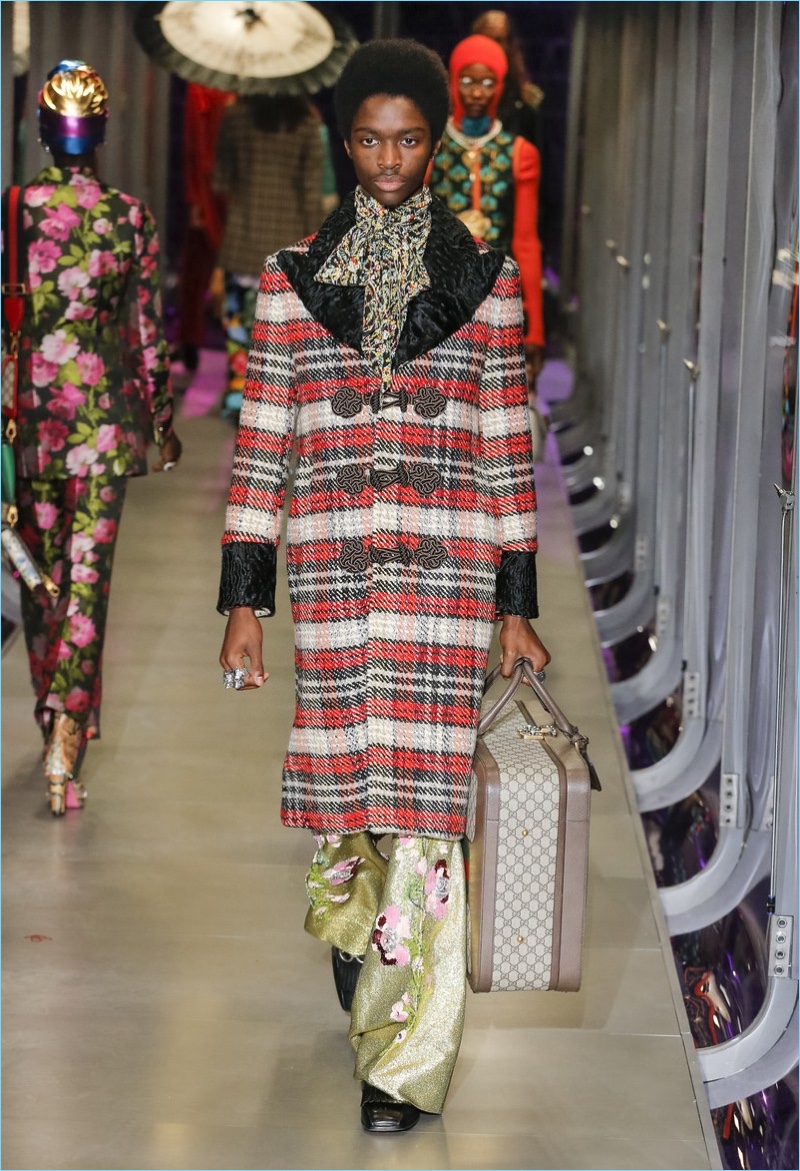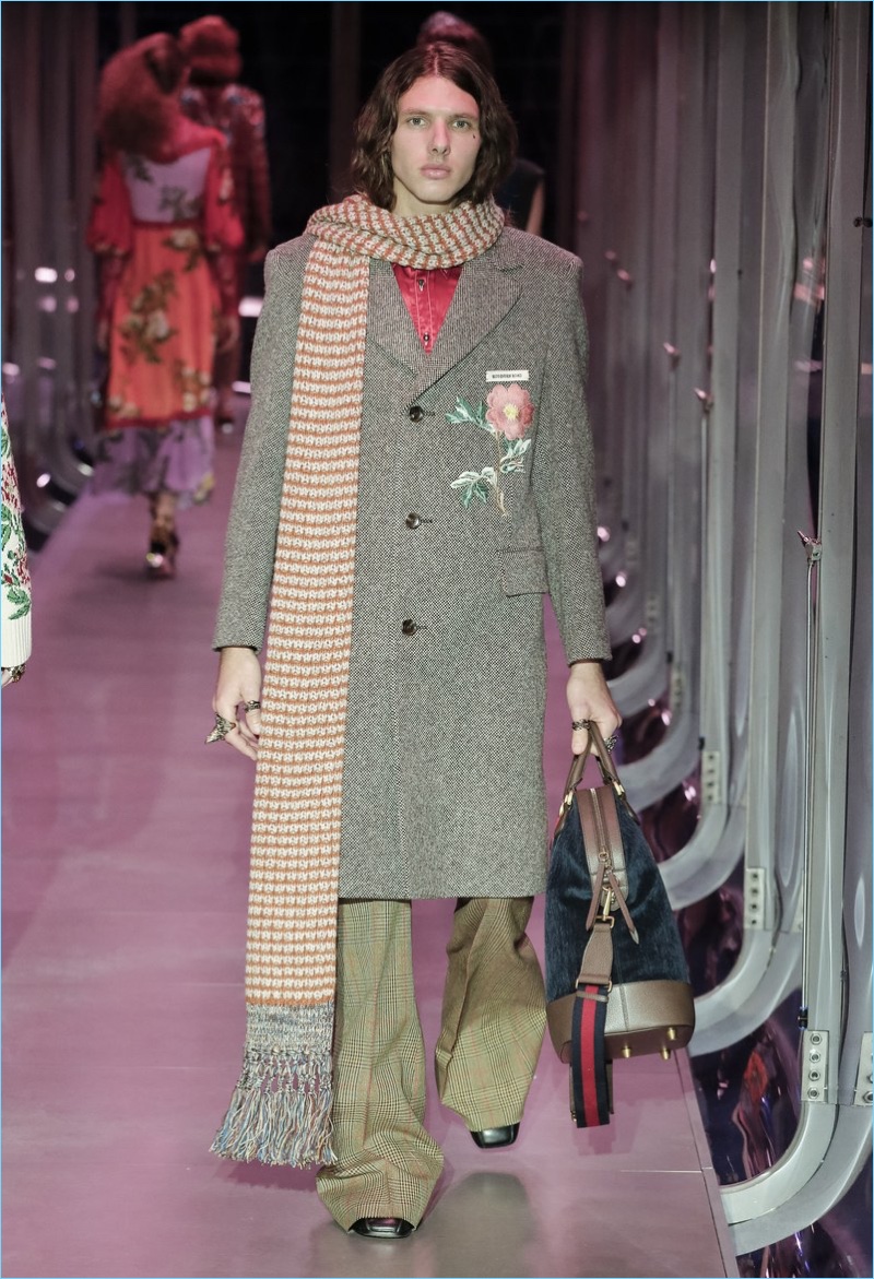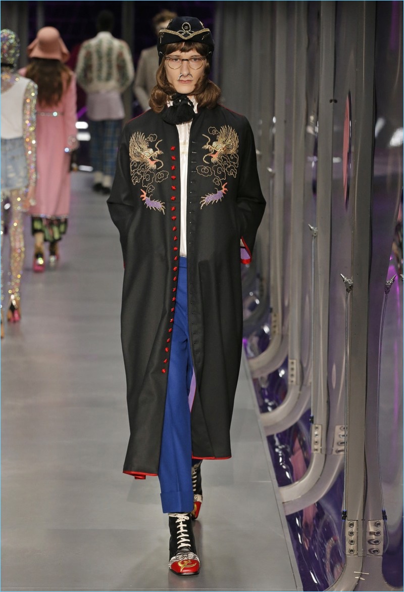Designer Alessandro Michele makes quite the statement with a graphic coat for Gucci's fall-winter 2017 men's collection.Pin