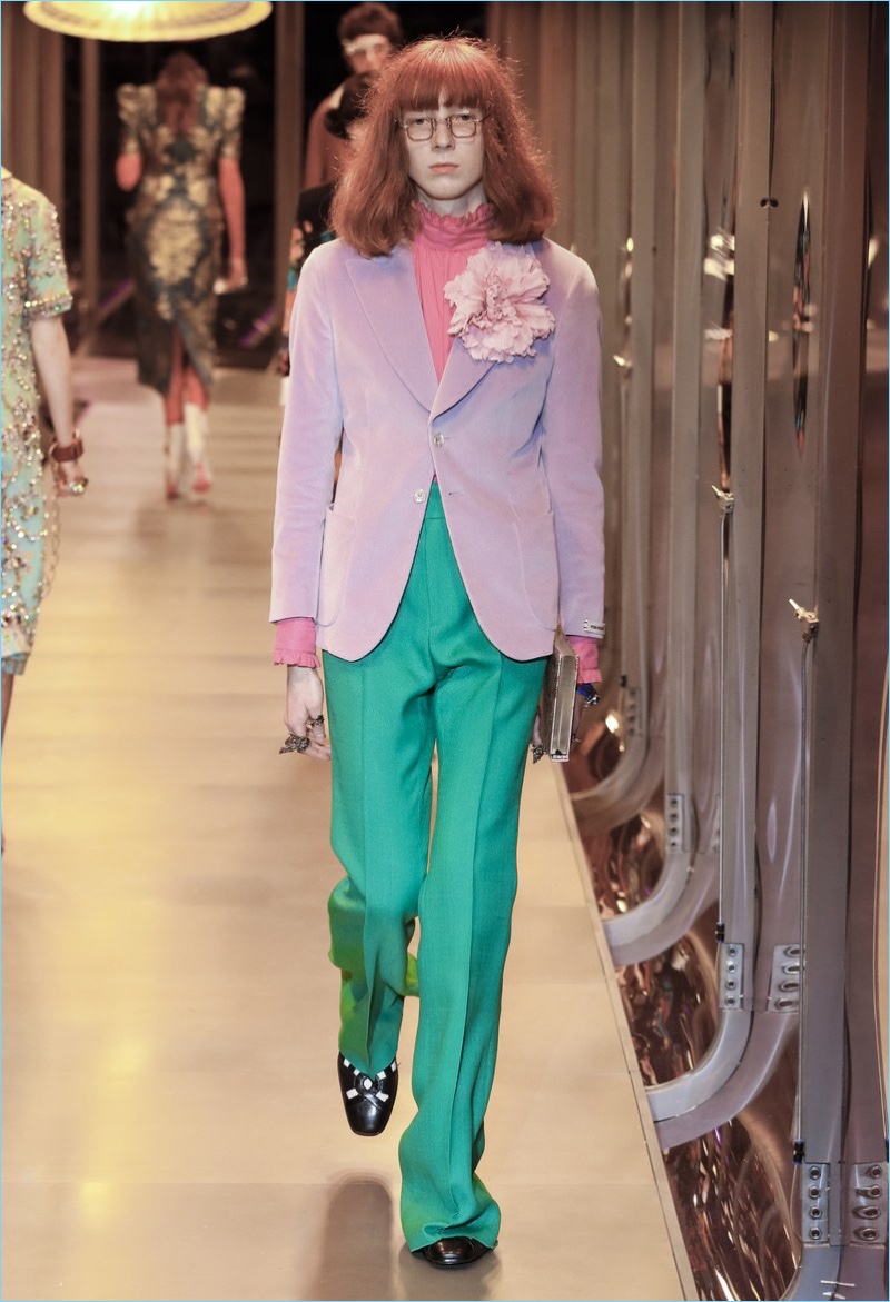 Gucci turns out a floral print suit for its fall-winter 2017 men's collection.Pin