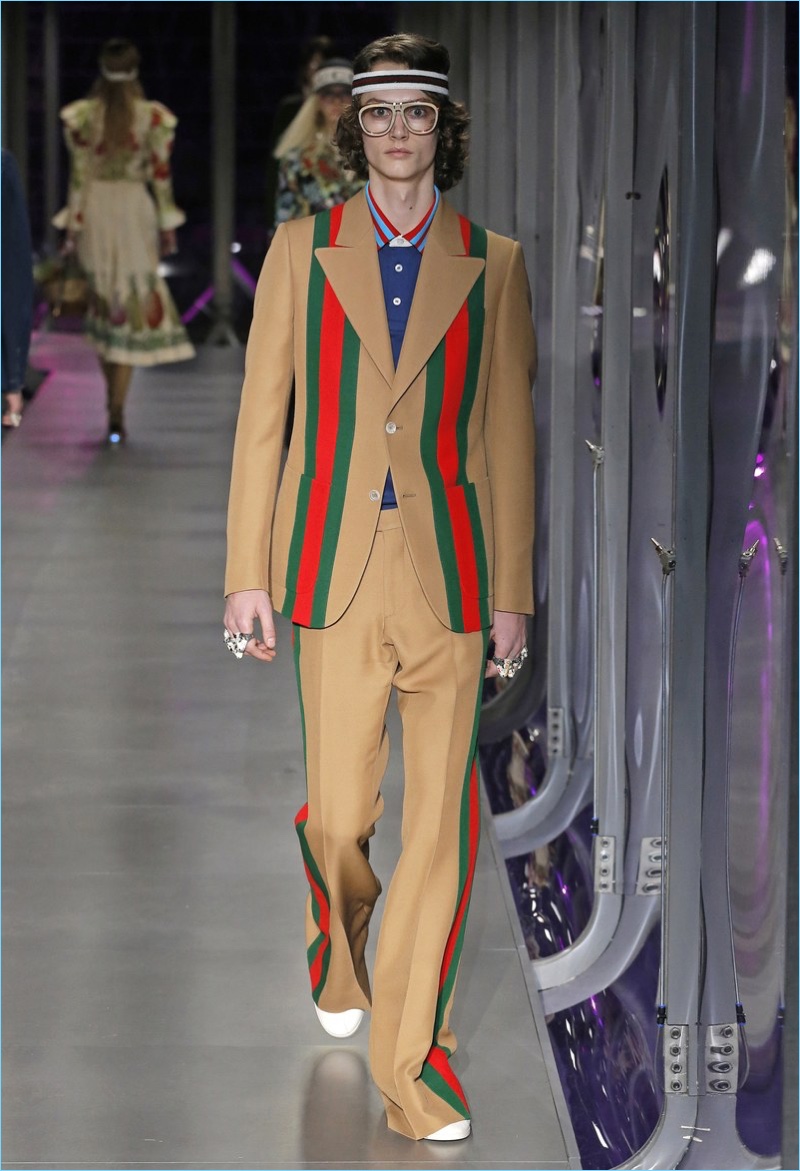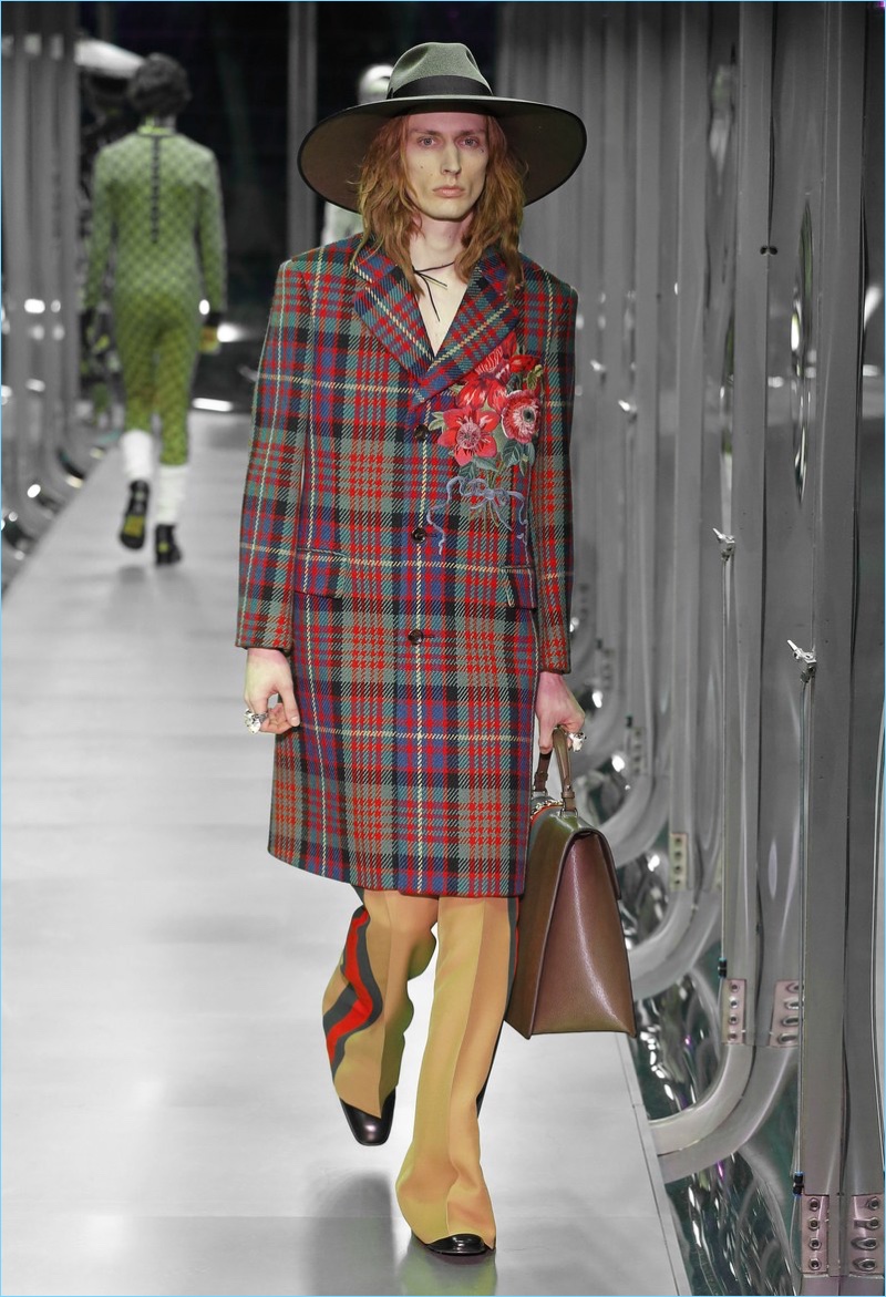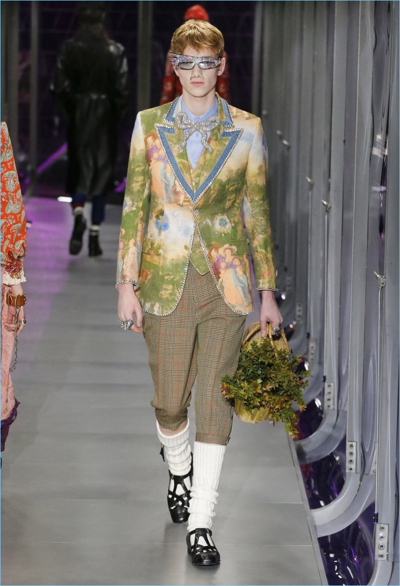 Plaid suiting comes together with cheeky knitwear for Gucci's fall-winter 2017 lineup.Pin