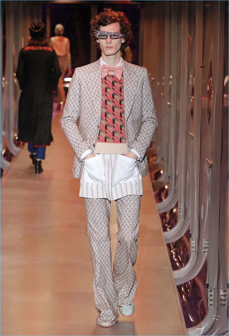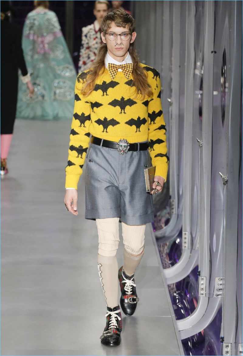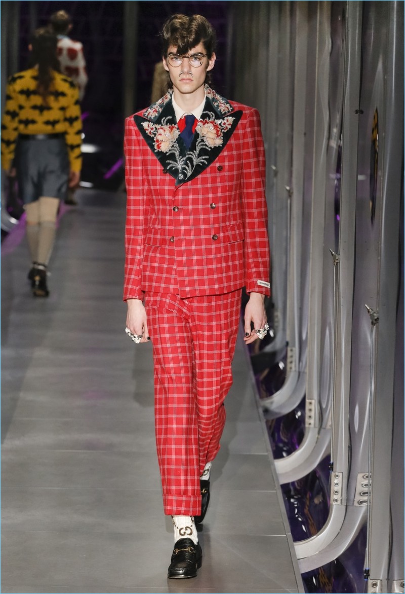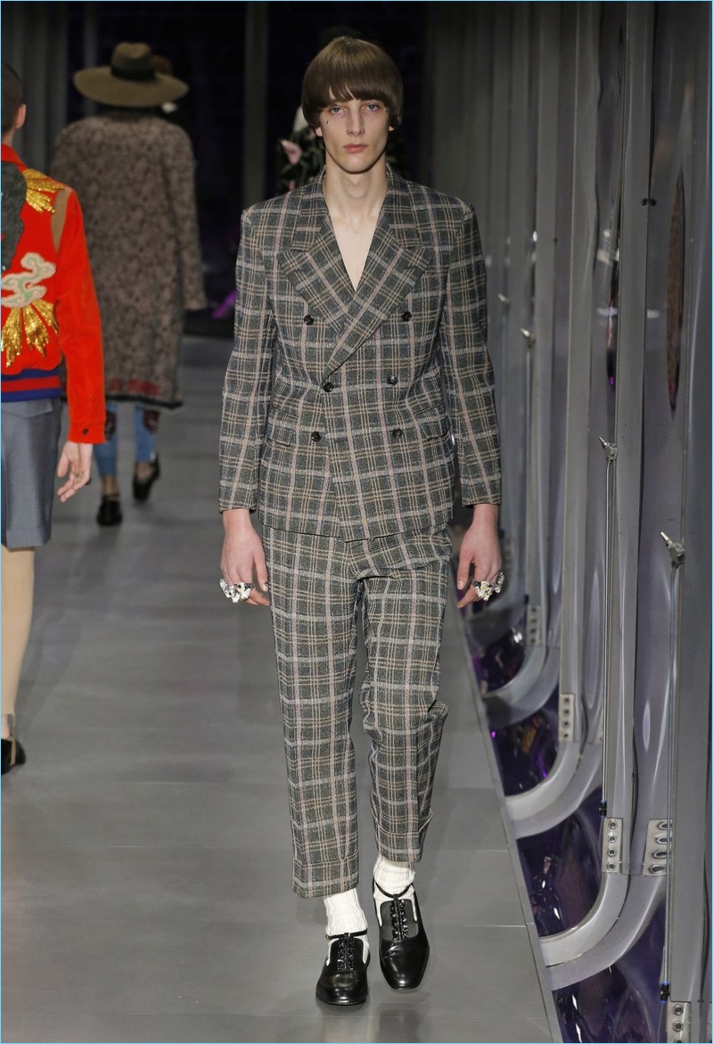 Plaid suiting comes together with cheeky knitwear for Gucci’s fall-winter 2017 lineup.