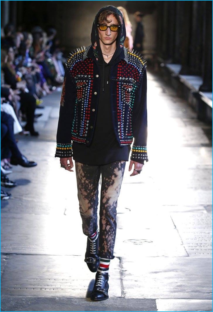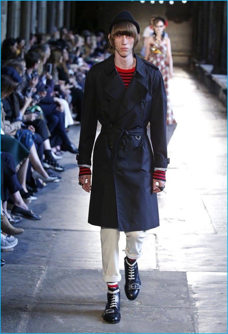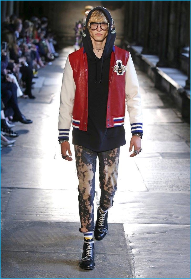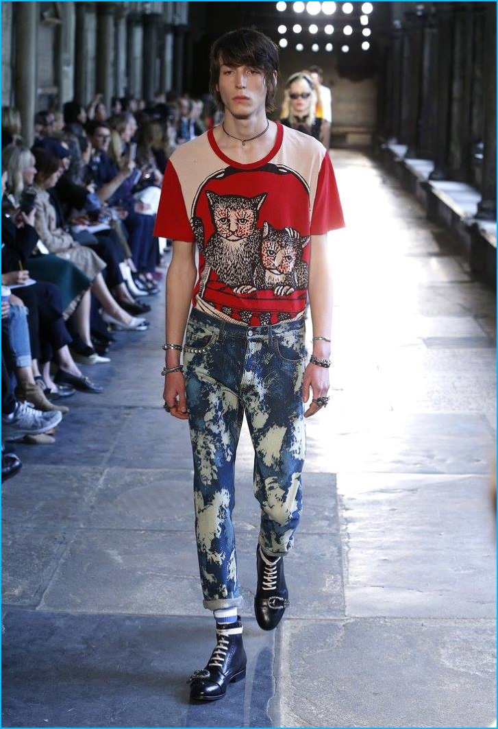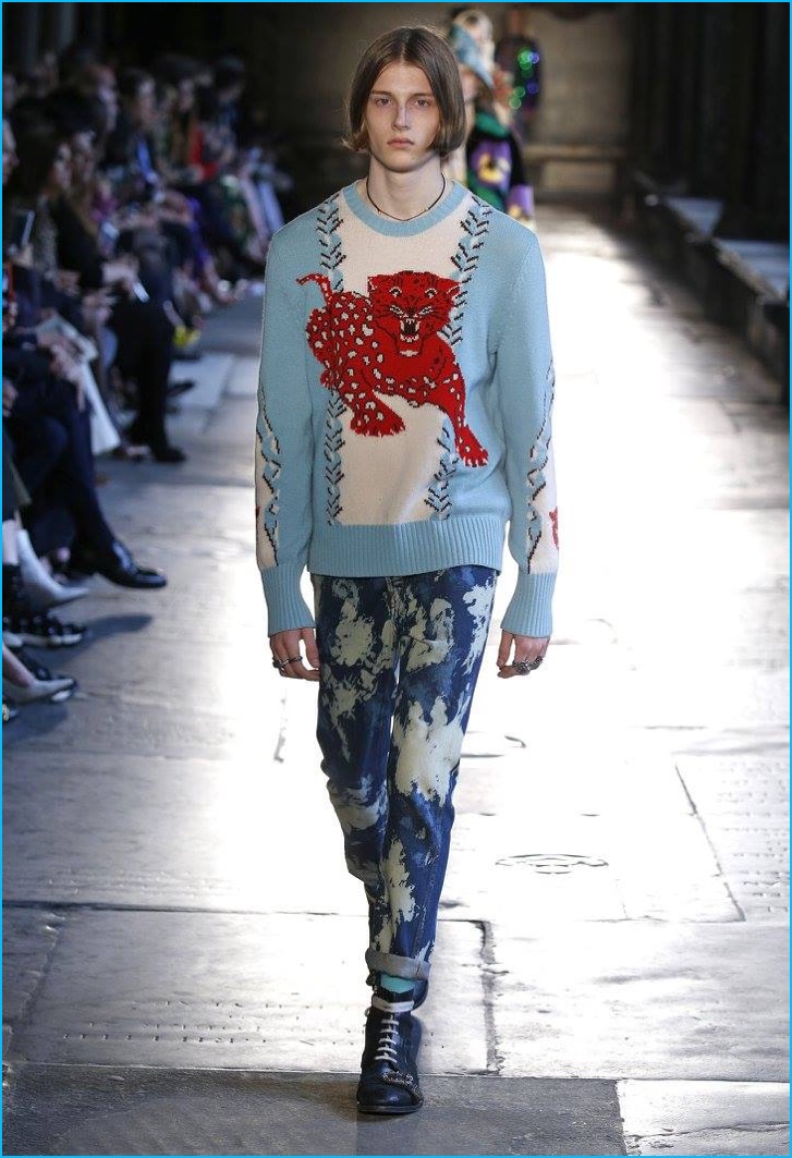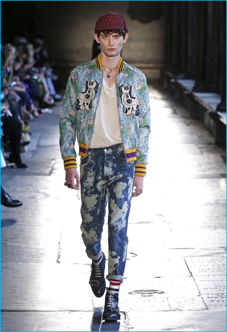 Gucci set up shop in London at The Cloisters in Westminster Abbey to show its cruise 2017 collection. Talking about the collection, which was originally unveiled with a lookbook, Gucci creative director Alessandro Michele shares, “The collection is like a little poem to London. I have tried to put into it some of the pieces in my heart when I think about London: Victorian, schoolboy, crazy young noble guys and some romantic punk.” The extensive lineup brings together a kitschy mix of styles with cat adorned sweaters, bleached denim jeans, plaid suiting, printed bomber jackets and more.