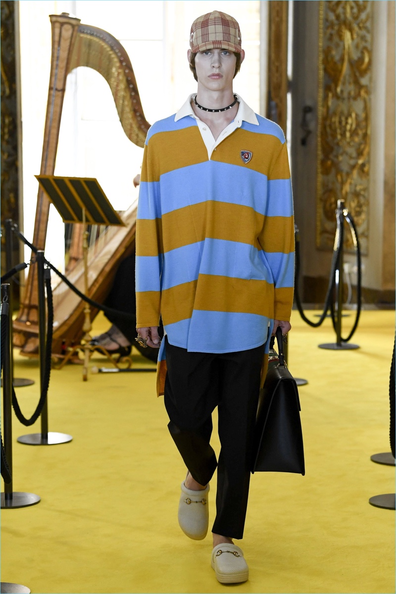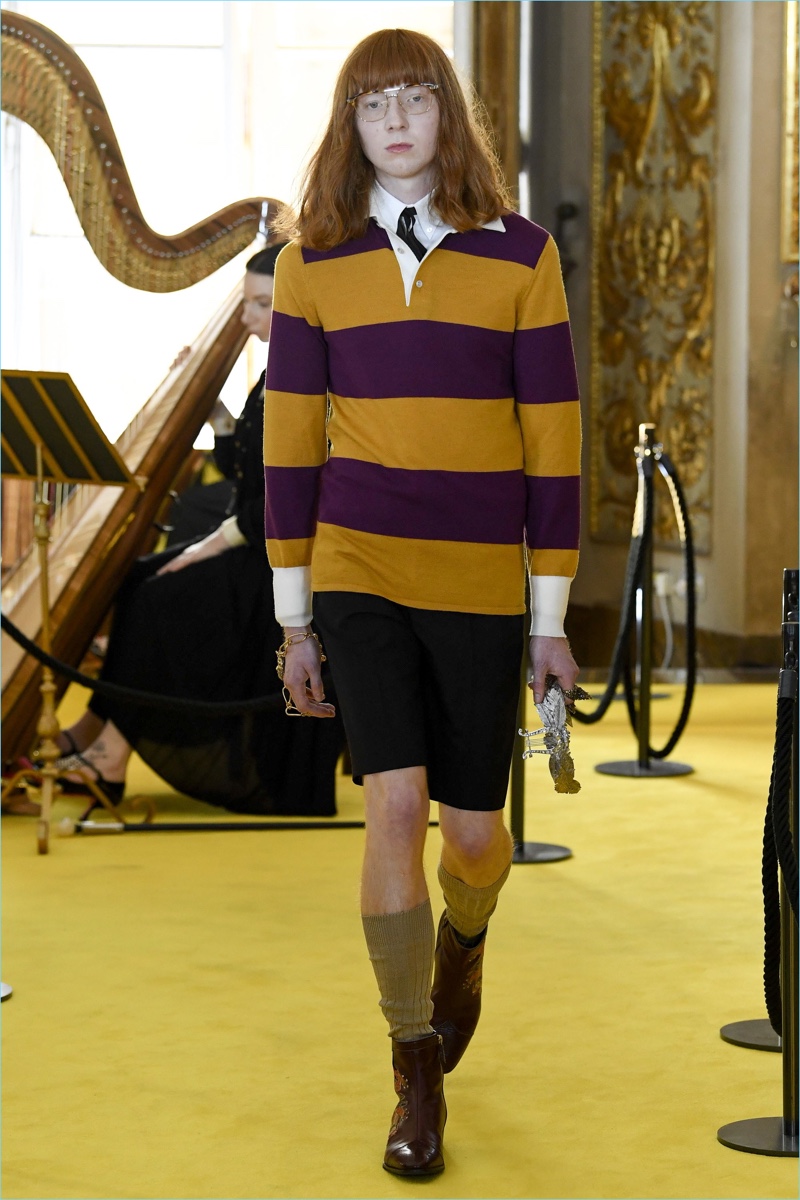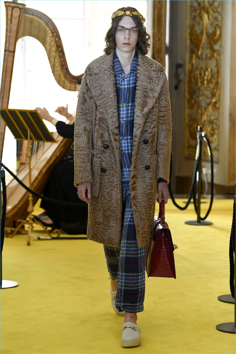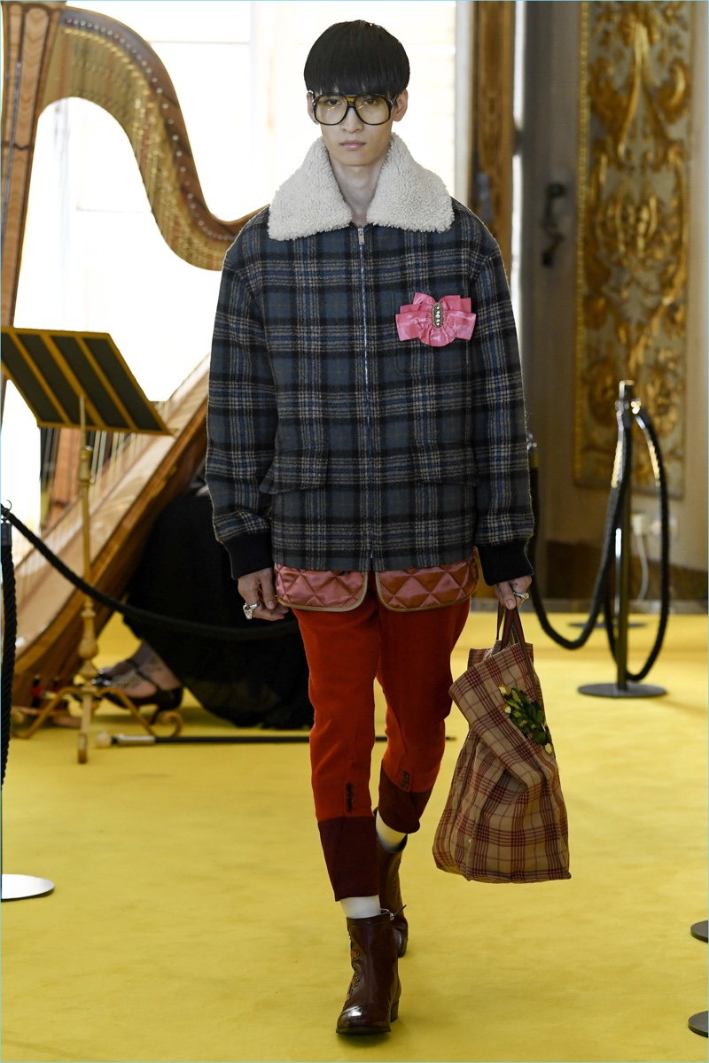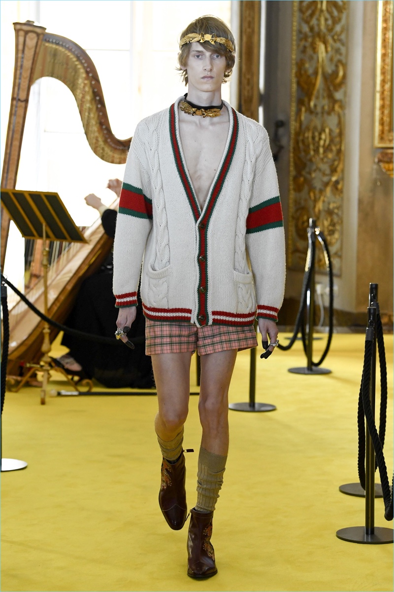 Expanding on straight silhouettes, the collection’s shorts and pants explore a baggy territory. Meanwhile, Michele has fun with Gucci’s image, courtesy of a new Guccy motif. Garden inspirations also contribute to the range with plenty of floral prints. Finally, slouchy cardigan sweaters, embellished pullovers, and plaid outerwear point to a quirky but smart Gucci man.