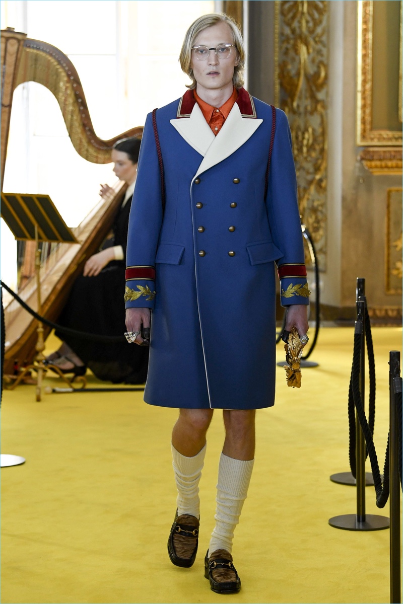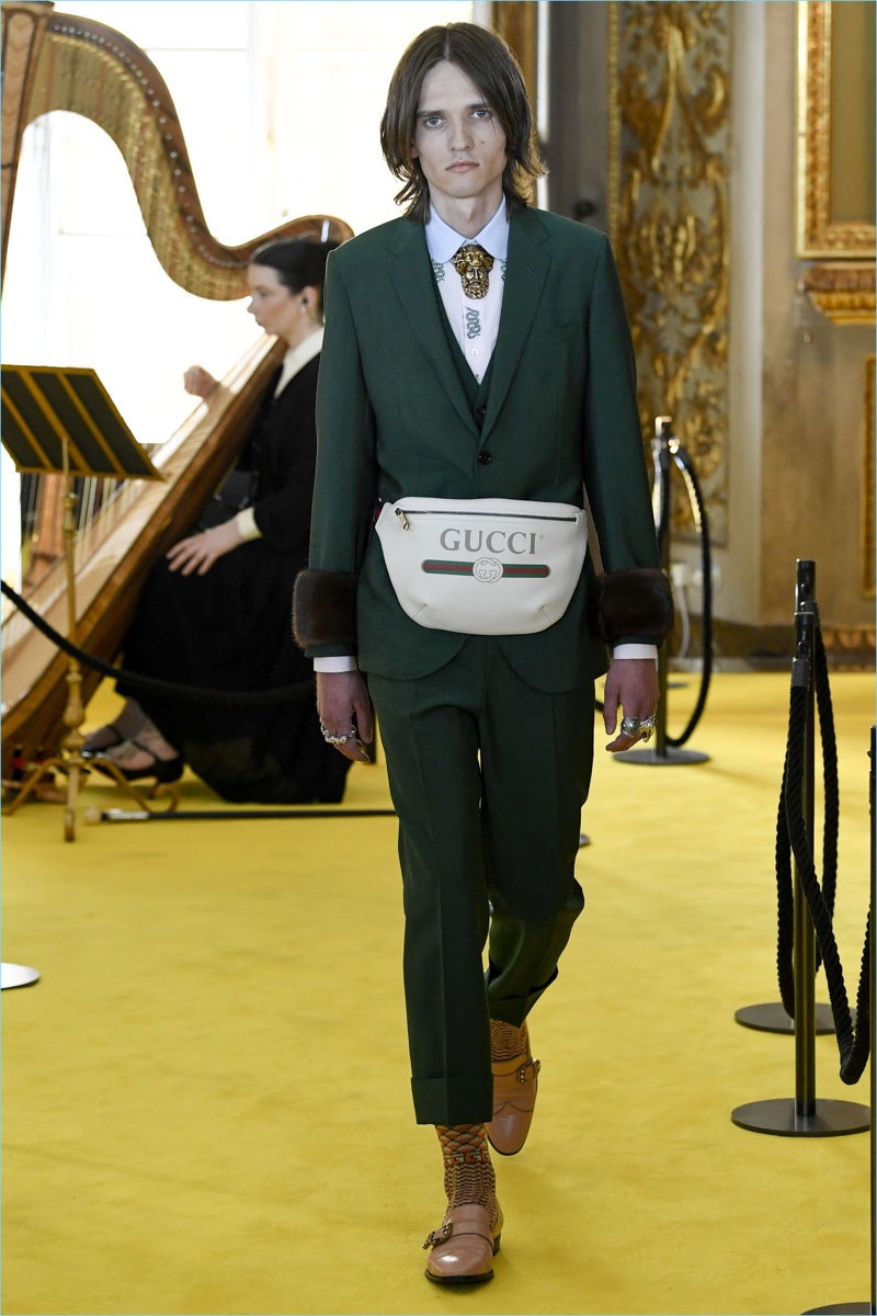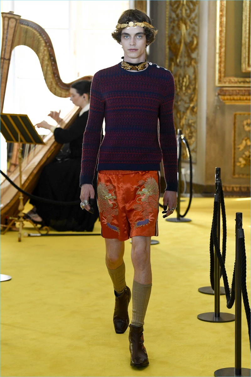 As usual, Gucci’s latest runway show is quite the spectacle to review. The Italian fashion house staged its cruise 2018 co-ed runway show in Florence. The venue was none other than the Palatina Gallery at Palazzo Pitti. The storied location provides endless inspiration for Gucci creative director Alessandro Michele. Approaching the season, a rock ‘n’ roll attitude collides with references to Greek and Roman culture.
