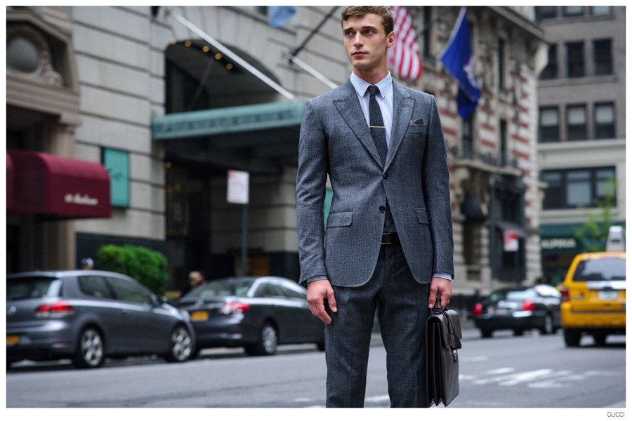 Italian fashion house Gucci highlights its men’s tailoring and suiting for a new outing featuring French model Clément Chabernaud. Directed by Remi Paringaux, Clément reunites with Gucci after starring in its fall 2014 campaign. Followed on a day out, Clément is the ultimate man of style as he wears his Gucci tailored best, involving sharp slim lines and charcoal hues, as he stops in for tasks such as a shoe shine or a trip to the barber for a shave.