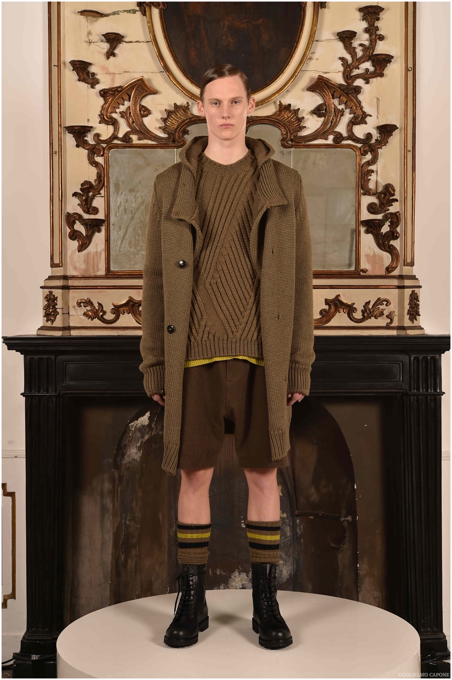 Designer William Capone revisits fond memories of childhood for Guglielmo Capone’s fall-winter 2015 menswear collection. Celebrating elegance and simplicity, generous volumes come together, tracing the life journey, from childhood to adulthood. Oversized knitwear makes a strong impression, paired with Bermuda shorts and warm wool socks. Continuing the boyishness of the collection, soft peacoats and parkas are mixed in with relaxed trousers, double-breasted coats and other must-haves for the season.