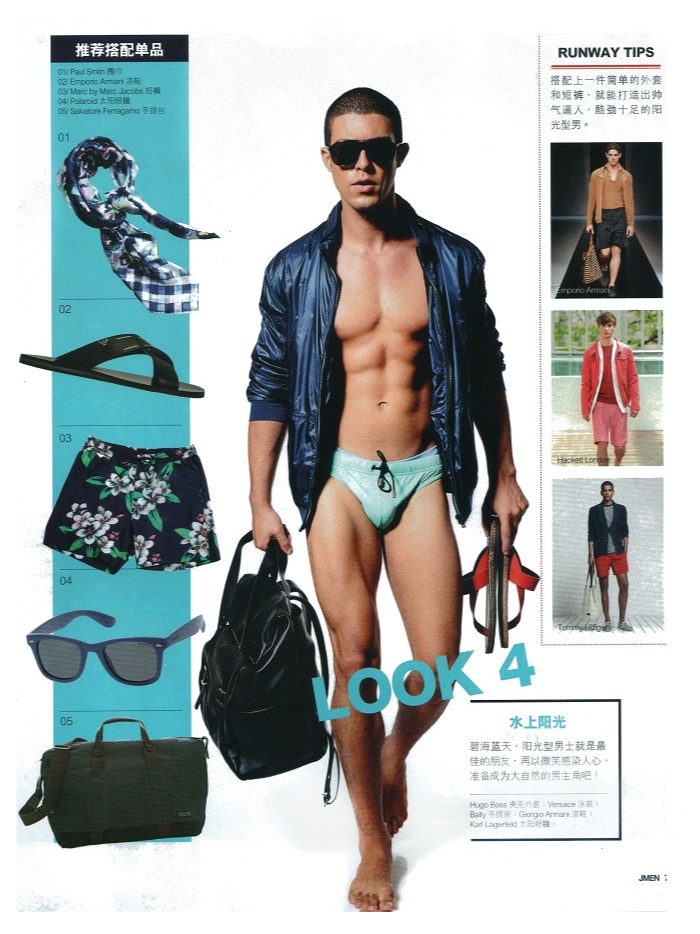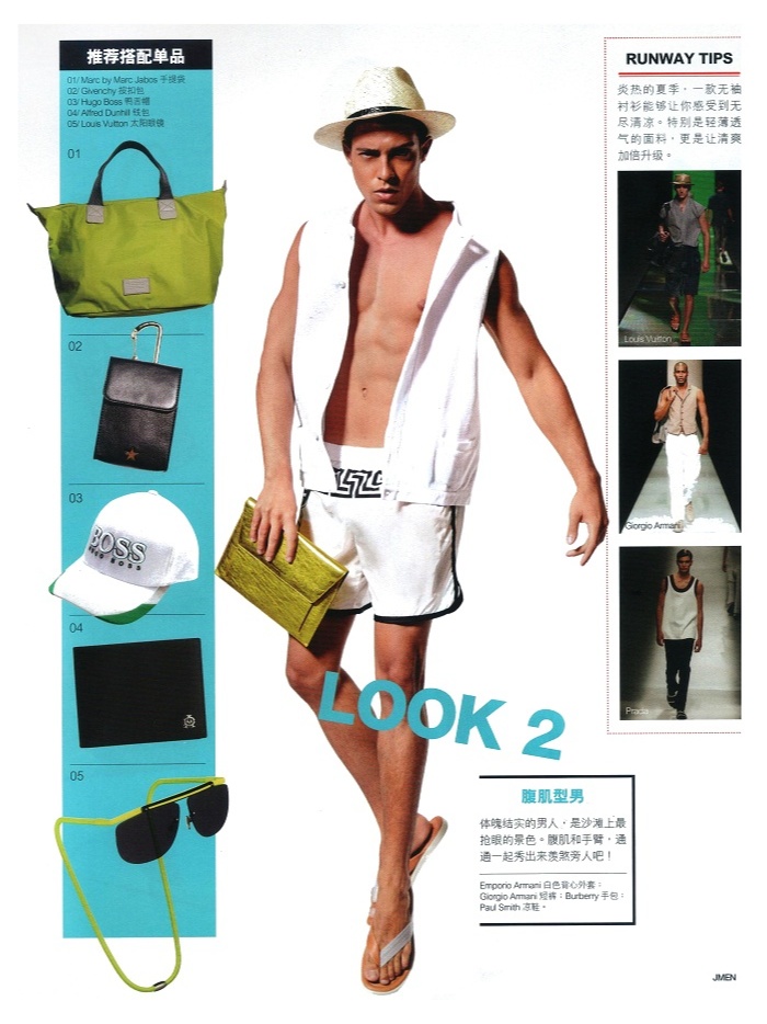 Summer Bound–Appearing in this month’s edition of JMEN, Brazilian model Gui Costa exudes the attitude of summer, embracing a casual wardrobe along with seasonal essentials. Photographed by Delvin Xian with styling by Max Mak, Gui transitions from lightweight garments from Giorgio Armani and Burberry Prorsum to bathing suits, clutches and sandals.