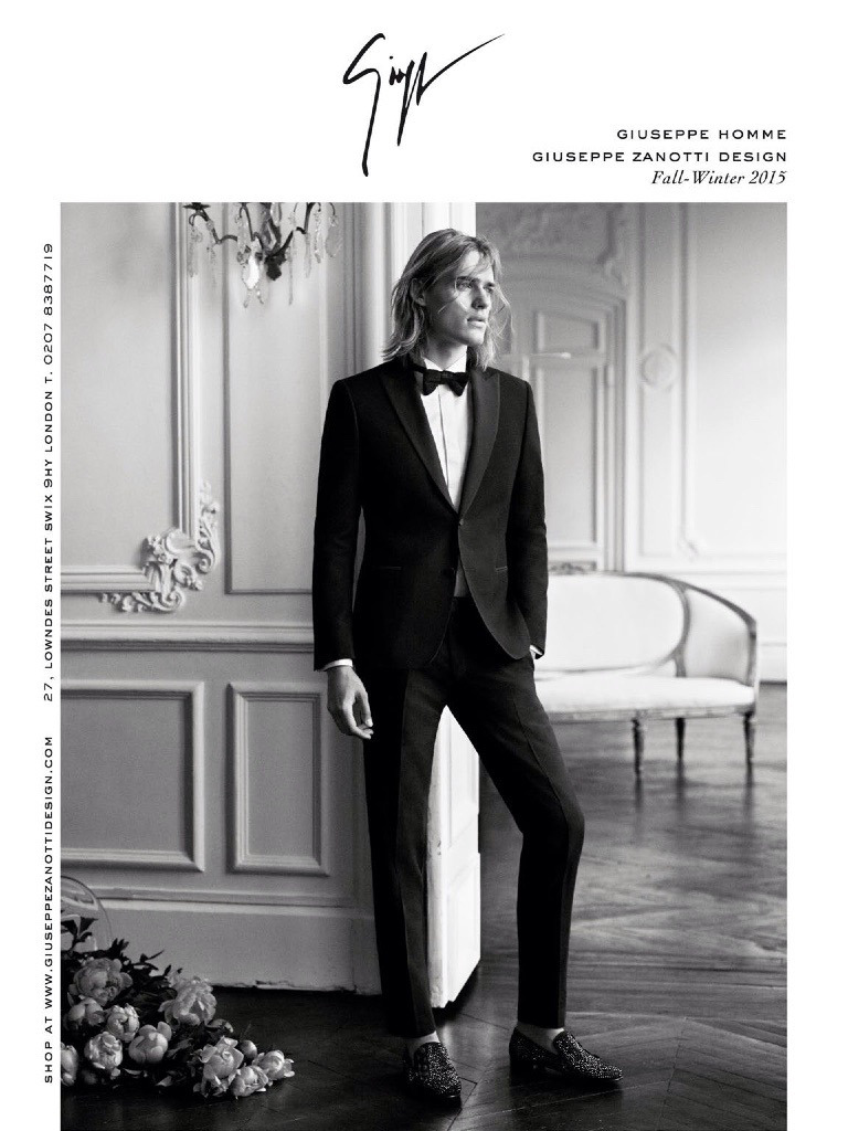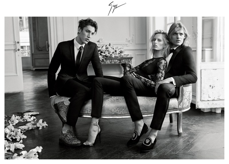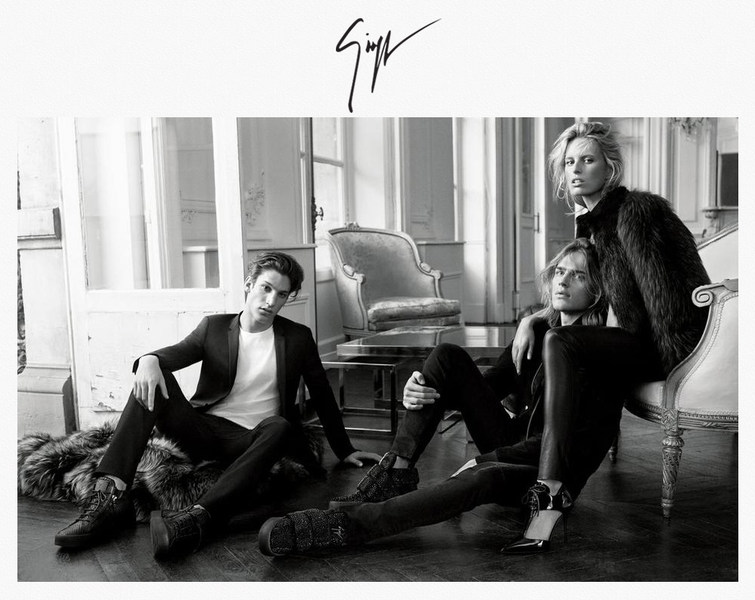 Guiseppe Zanotti is ready for the new season with an elegant black & white fall-winter 2015 advertising campaign. Shot by photographer Josh Olins, the sharp outing features models Iasonas Laios and Ton Heukels, joined by Karolina Kurkova. The trio keep to formal looks in black, dressing up their ensembles with Guiseppe Zanotti’s splashy footwear.