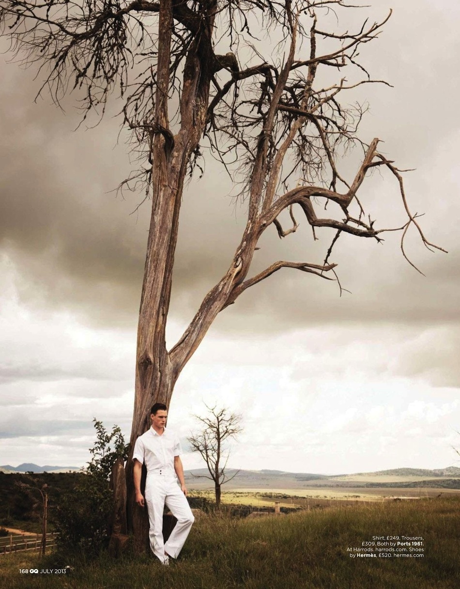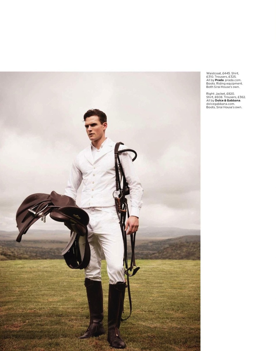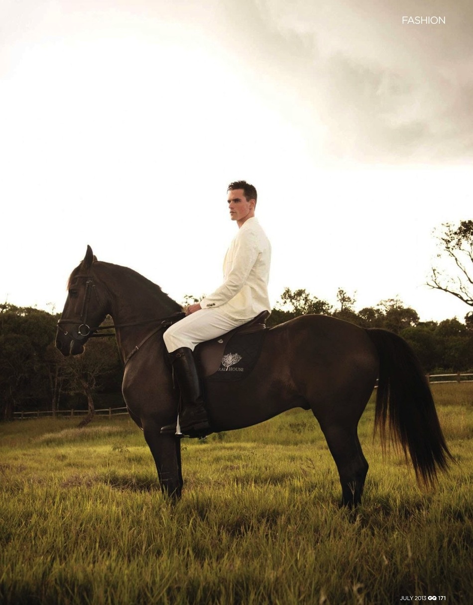 It’s All About White–Decked out in an all-white wardrobe, British model Guy Robinson appears before the lens of David Goldman for an equestrian-inspired story published in GQ UK’s July 2013 issue. Heading to the African state of Kenya, Guy is styled by GQ’s Jo Levin in a series of white numbers that blend refinement with the maximum comfort. Clad in pieces from the likes of Gucci, Giorgio Armani and others, the FM model poses surrounded by a breathtaking nature, joined only by a strong horse, that accompanies him on endless rides in the African territory. / Styling assistance by Holly Roberts. Grooming by Kota.