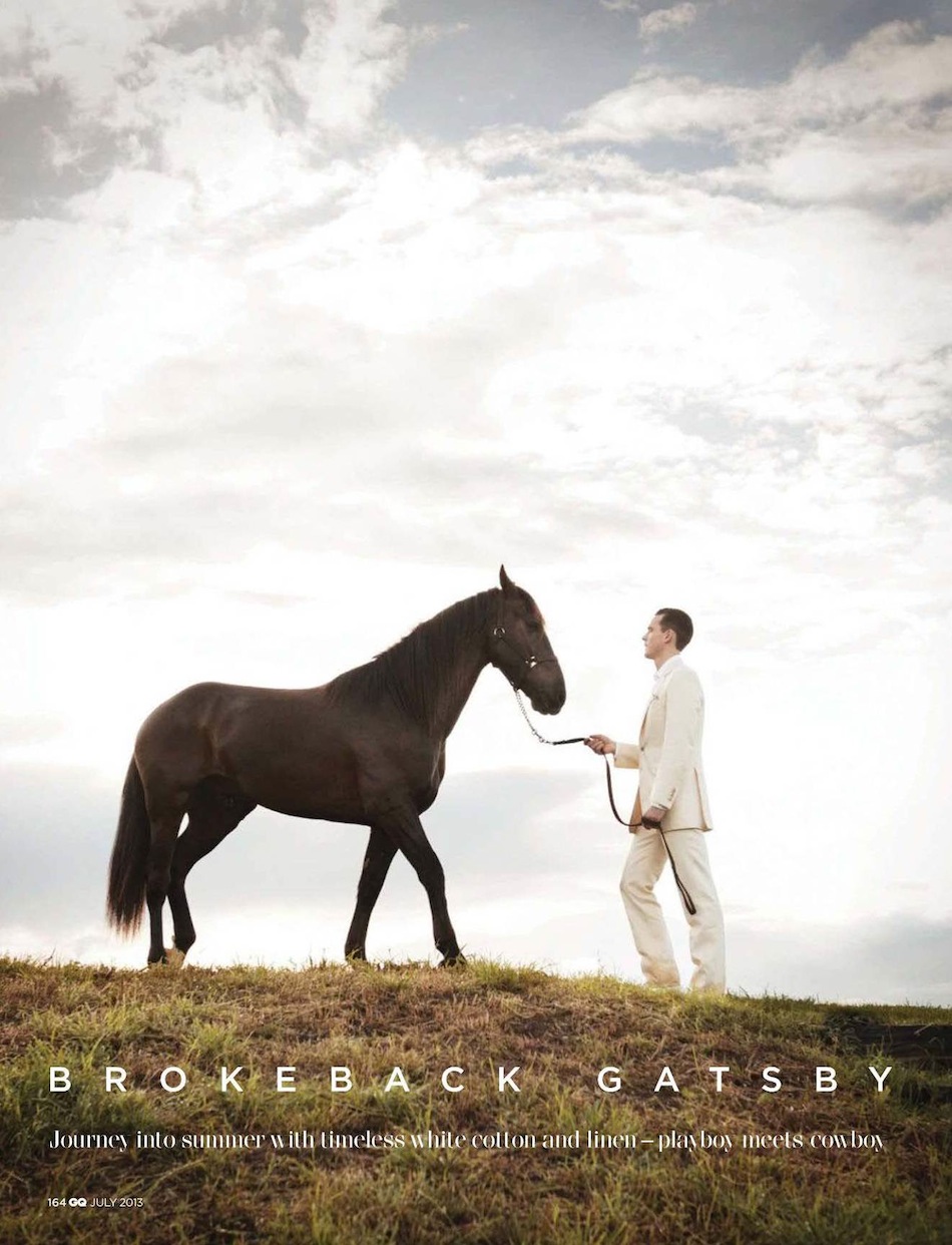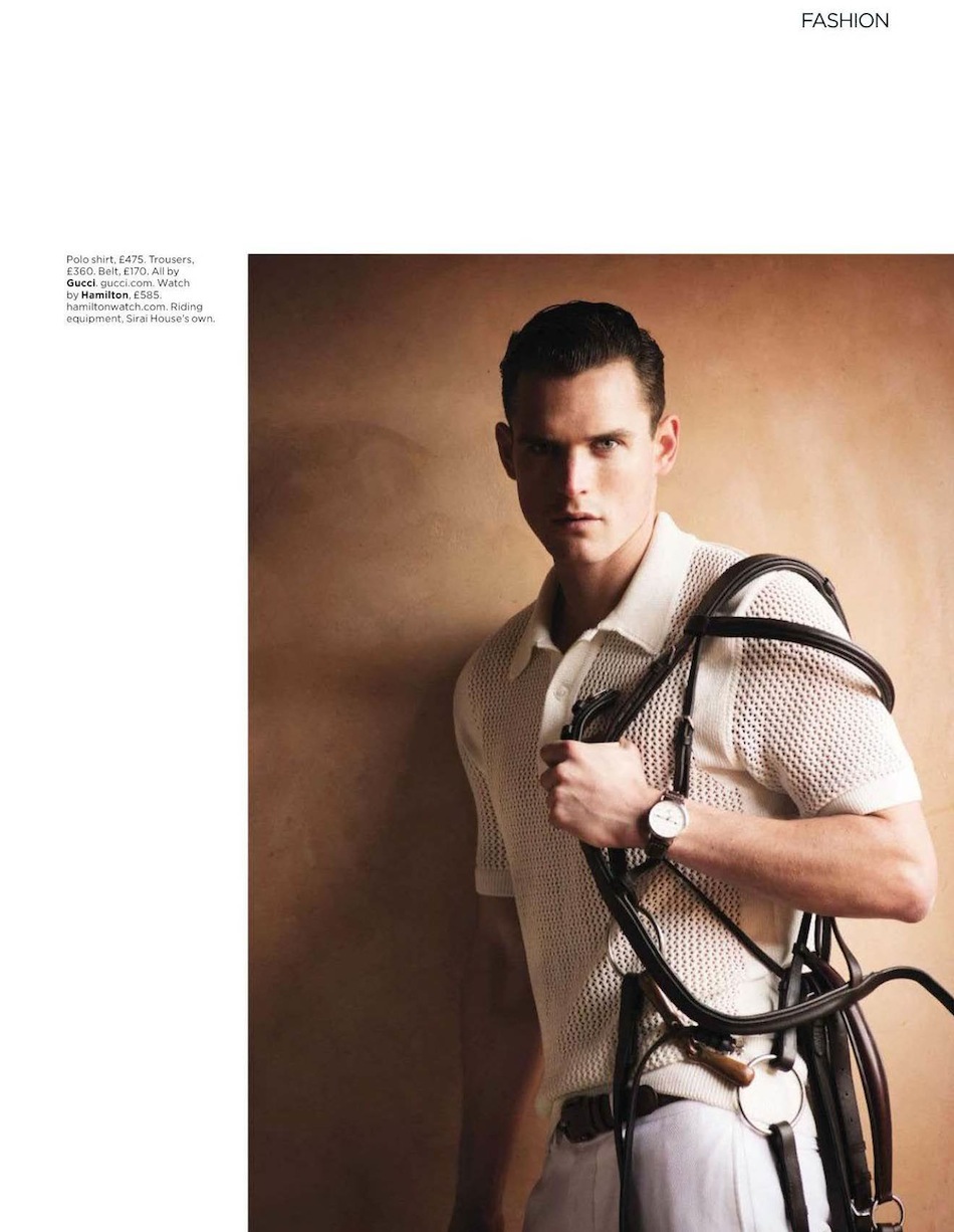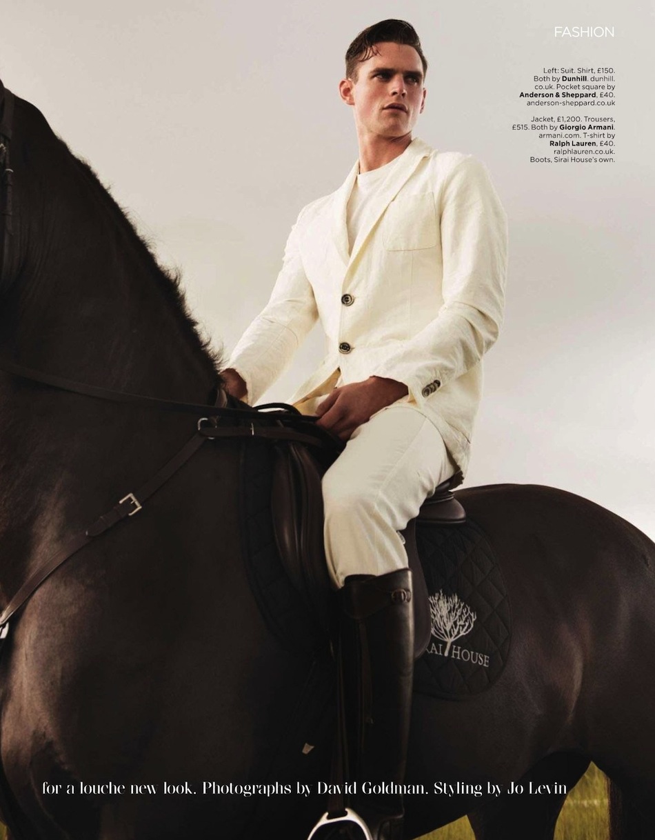It’s All About White–Decked out in an all-white wardrobe, British model Guy Robinson appears before the lens of David Goldman for an equestrian-inspired story published in GQ UK’s July 2013 issue. Heading to the African state of Kenya, Guy is styled by GQ’s Jo Levin in a series of white numbers that blend refinement with the maximum comfort. Clad in pieces from the likes of Gucci, Giorgio Armani and others, the FM model poses surrounded by a breathtaking nature, joined only by a strong horse, that accompanies him on endless rides in the African territory. / Styling assistance by Holly Roberts. Grooming by Kota.