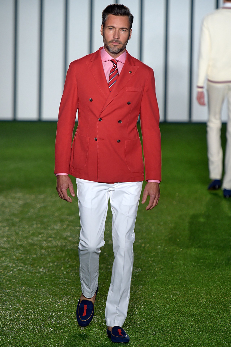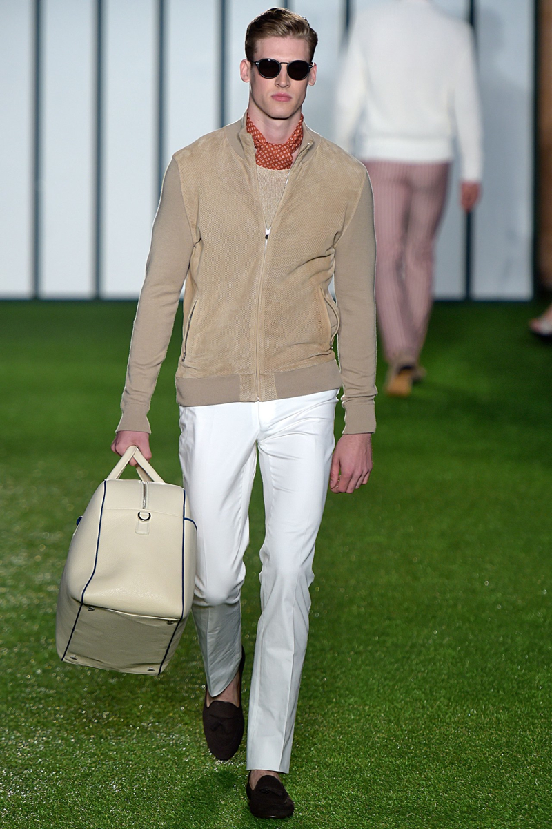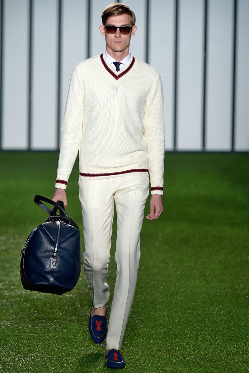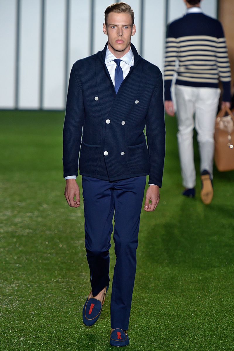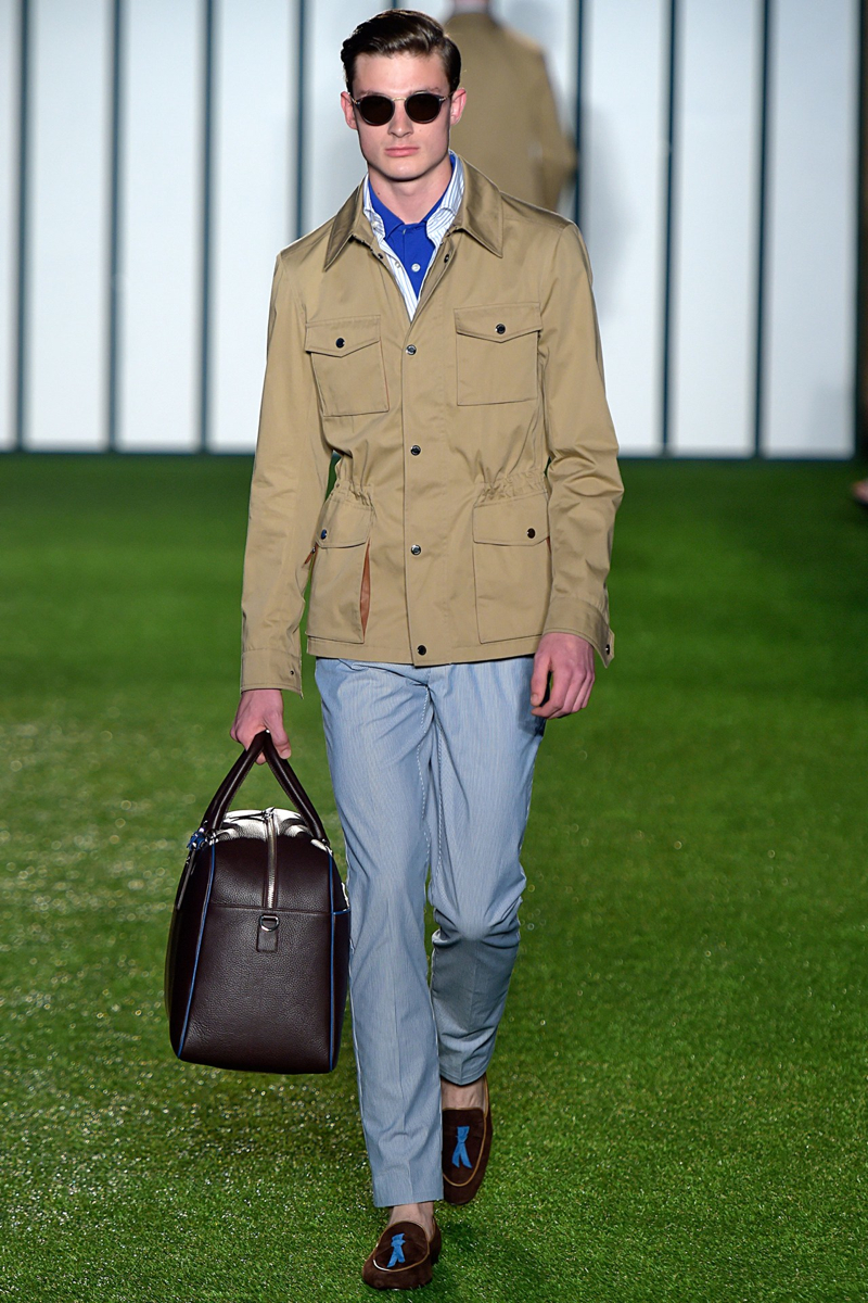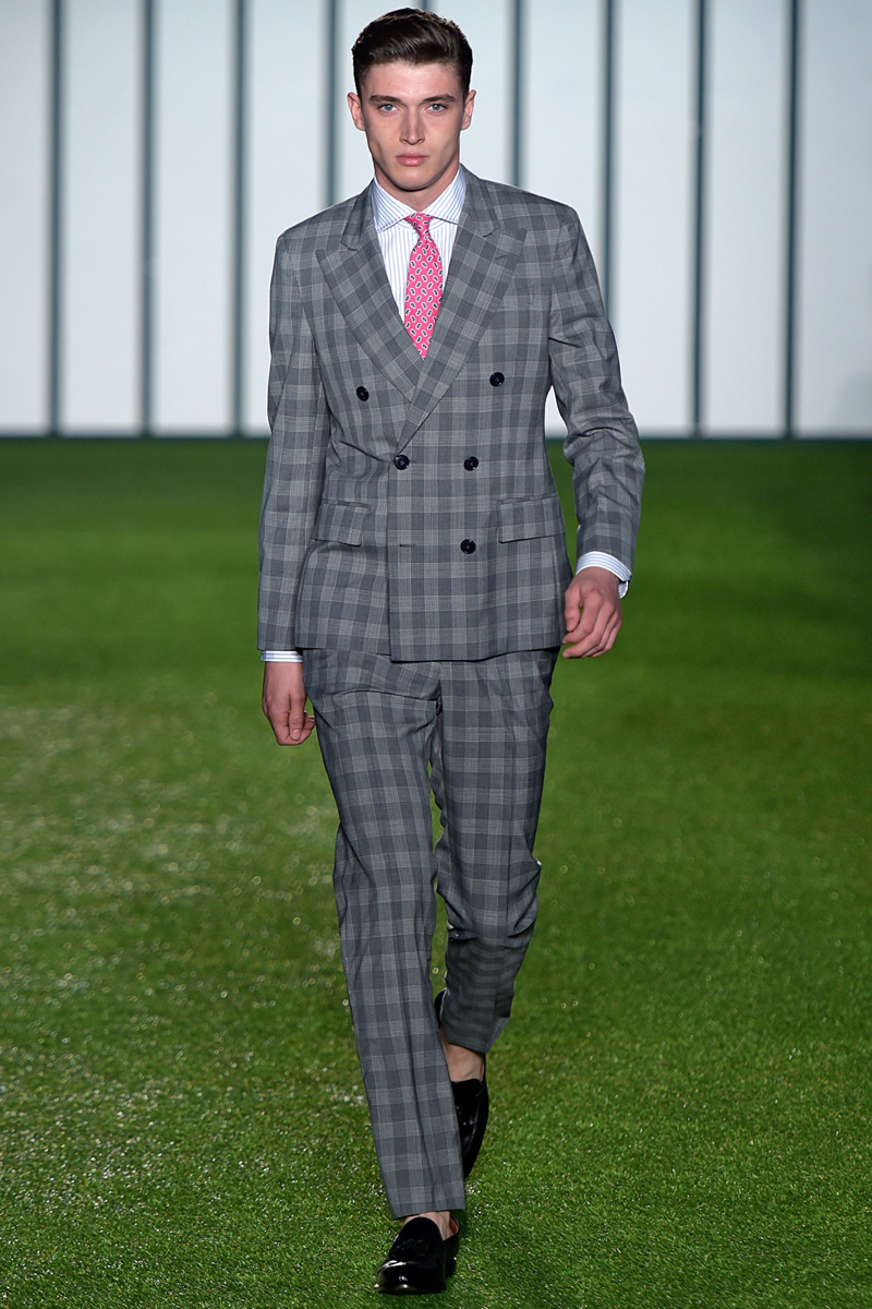 Hackett London Spring/Summer 2015–Unapologetically British, Hackett London looked to warm-weather sports to inform its spring/summer 2015 outing. Taking to the green, models unveiled looks that were perfect for a game of rugby or cricket. Creative director Jeremy Hackett showed a knack for color as sophisticated hues dressed tailored suits, relaxed knitwear and lightweight outerwear. Mixing patterns and colors, the well-tailored separate was the true hero of the outing.
