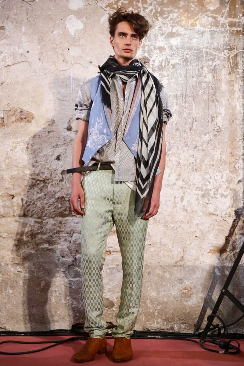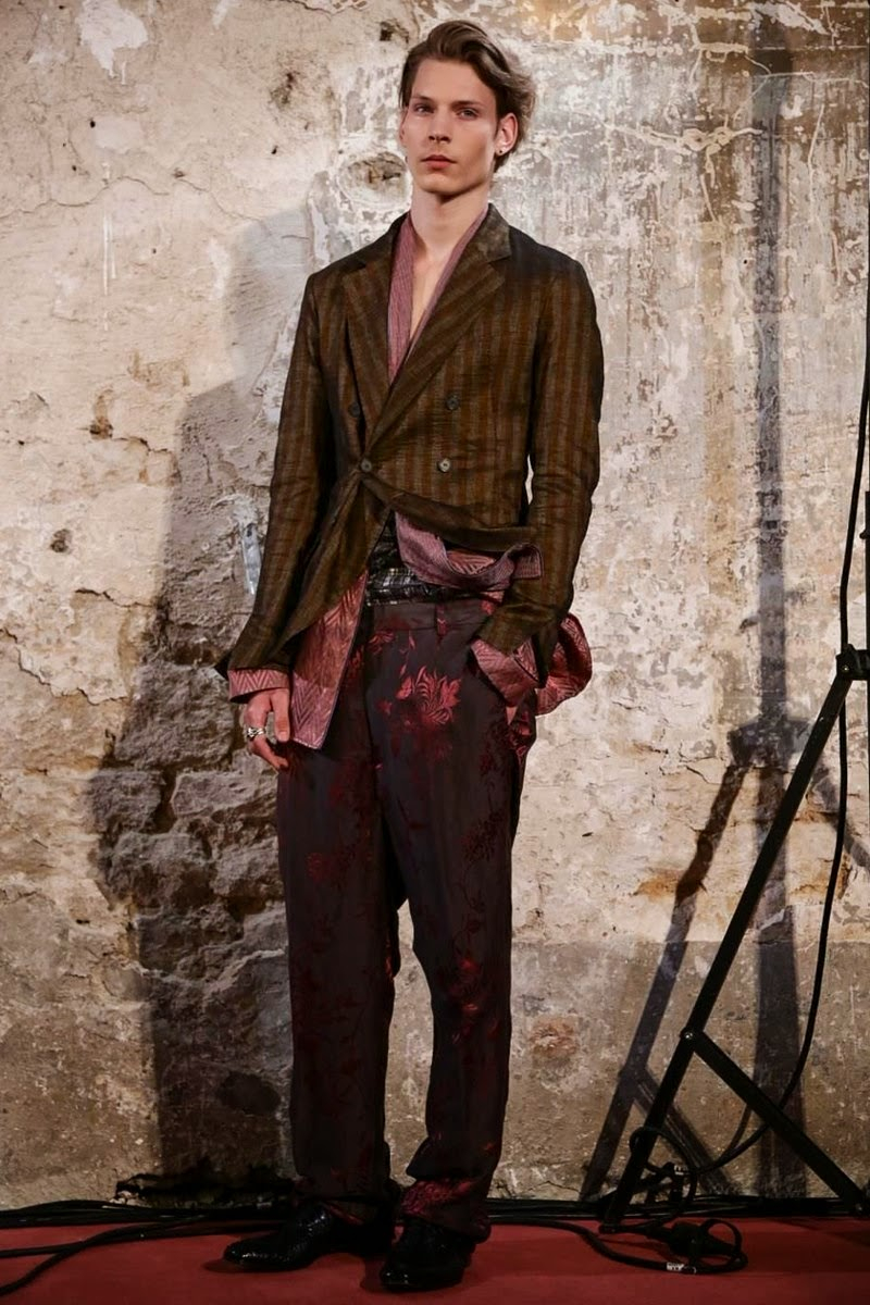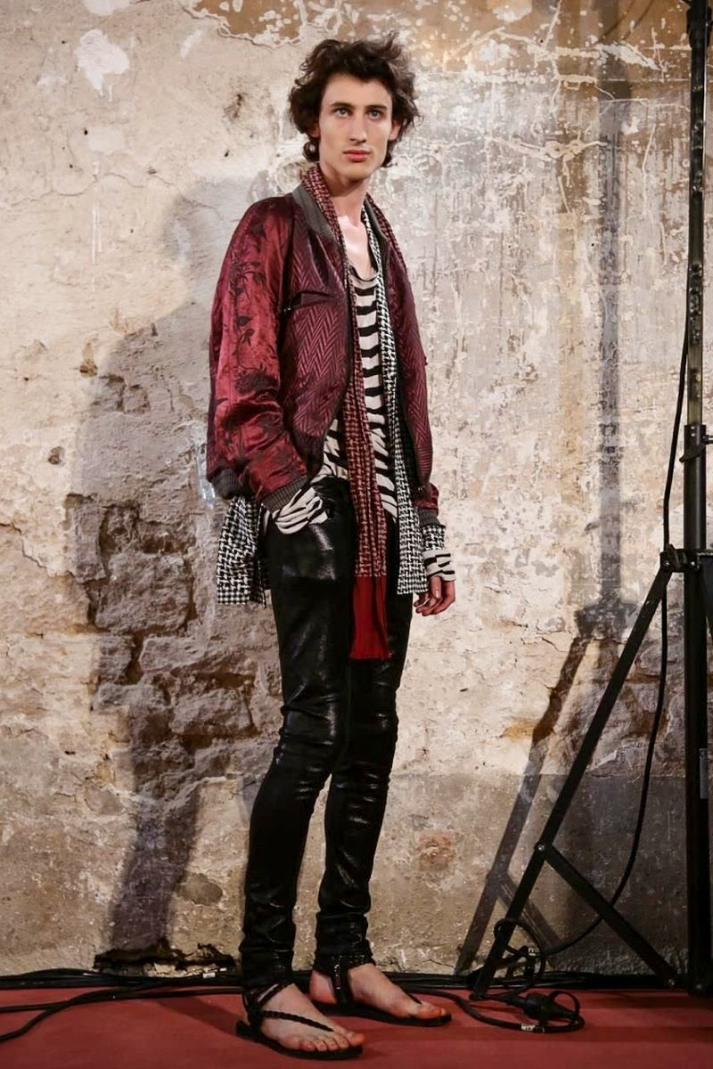 Haider Ackermann Spring/Summer 2015–Presenting his spring/summer 2015 collection during the first day of Paris Fashion Week, Haider Ackermann unveiled a lineup rich in luxe layers, intricate patterns and draped silhouettes. Offset against skin tight leather jeans, the first look revealed a slouchy black and white striped tee, paired with a short burgundy silk jacket. The way in which the colors played off of each felt so natural that it captured the perfect sentiments of Ackermann’s man. Exuding an organic feel, separates come together with such ease that they mirror the comforts of a wardrobe filled with worn-in favorites. From silk scarves and printed shawl collar waistcoats to velvet jackets worn with slim cropped trousers, Ackermann’s world is a sartorial dream that just feels right–it’s somehow the perfect fit.