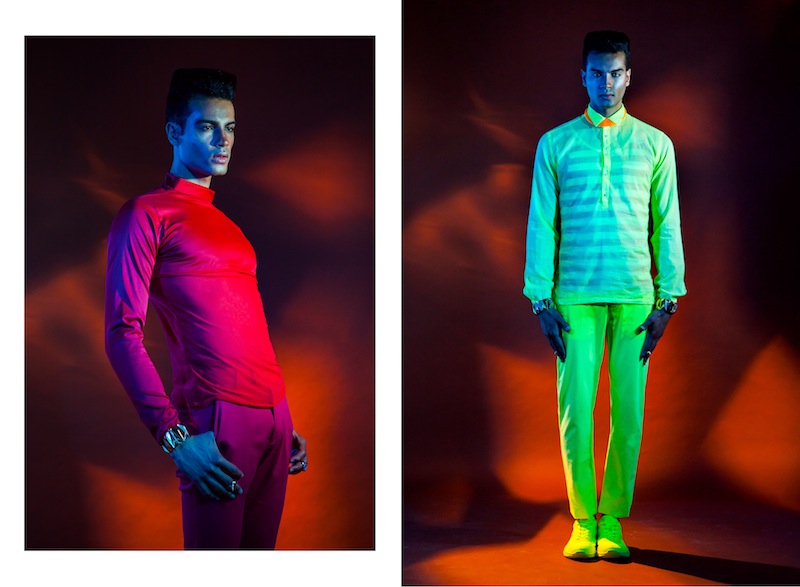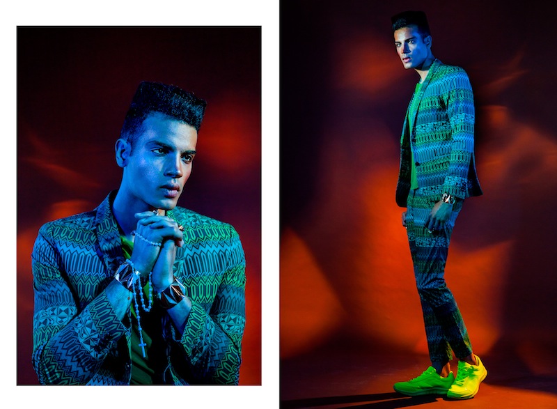 Radioactive–The need for a great summer theme is executed in a new color story featuring Trend model Hamza Lahboub. Tacking fun suiting and separates in electrifying colors, ranging from fuchsia to teal, Hamza is styled by Marília Estevam and captured by the lens of Adriano Campos. / Grooming by Rut Sarmiento.