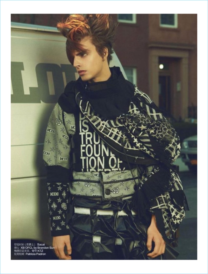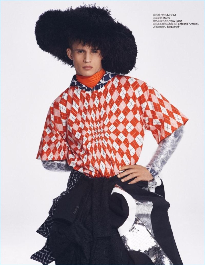 Daan van der Deen sports graphic fashions from Valentino, Jil Sander, and 3.1 Phillip Lim.Pin