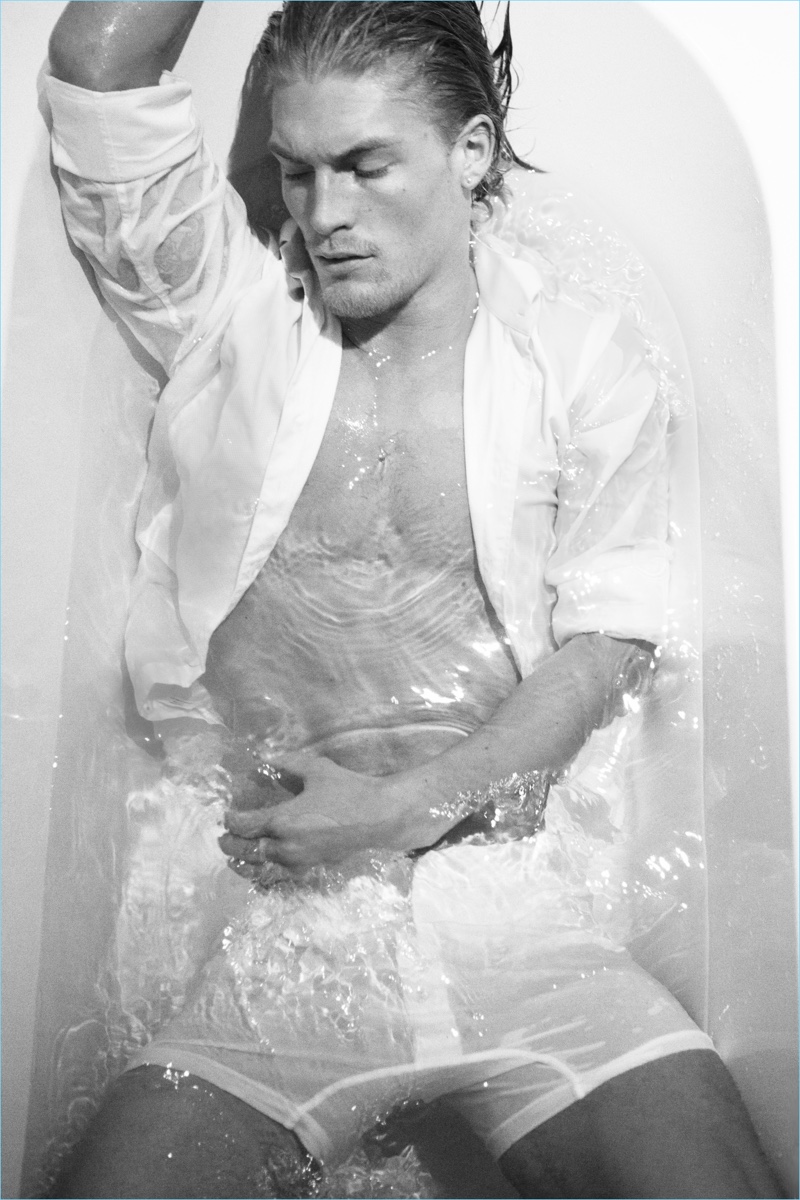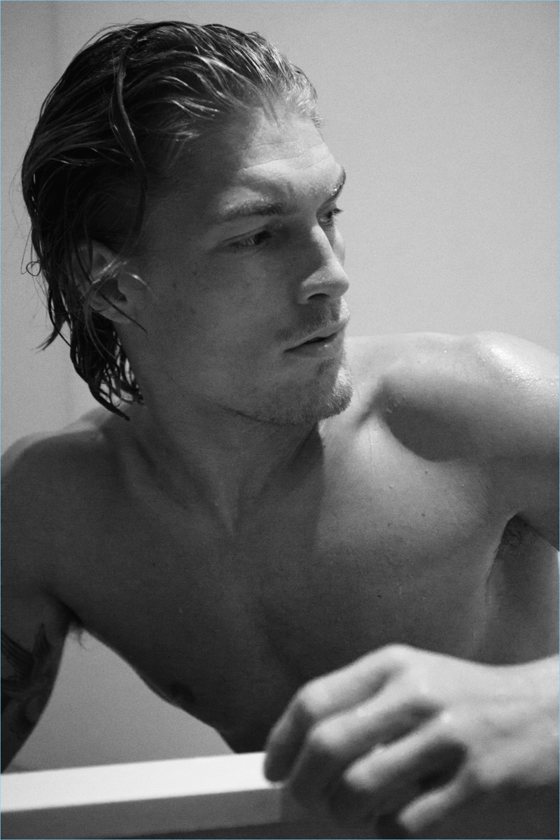 On the heels of a winter story with Playboy Germany, Harry Goodwins is back in the spotlight. The English model retreats indoors for a relaxed day with Wonderland. Embracing basics for lounging around the house, Harry connects with stylist, Kamran Rajput. Here, photographer Bartek Szmigulski captures the blond model in brands such as Sunspel and Thomas Pink.