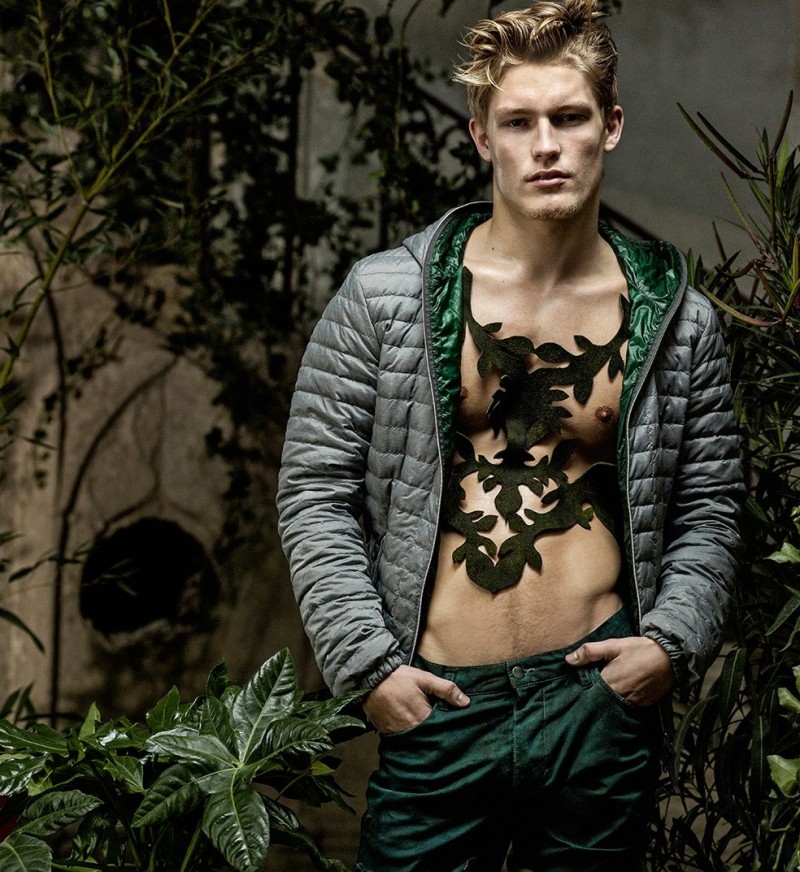 Secret Garden–It’s a decadent and romantic atmosphere, the one lensed by photographer Alessandro Bencini for Duvetica’s spring/summer 2013 campaign. Captured in a mysterious garden, covered with blooming and almost wild plants, Fashion Milano models Harry Goodwins and Mikkel Jensen don the brand’s latest offering, posing for striking images that emphasize their magnetic features. Lounging on a sofa or embracing a dreamy girl, the models are definitely at ease in a scenery where nature overcomes human beings.