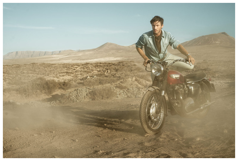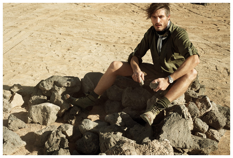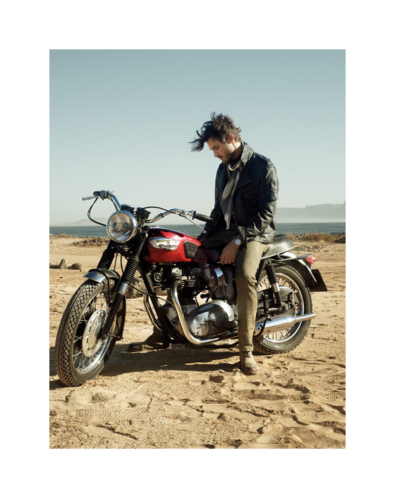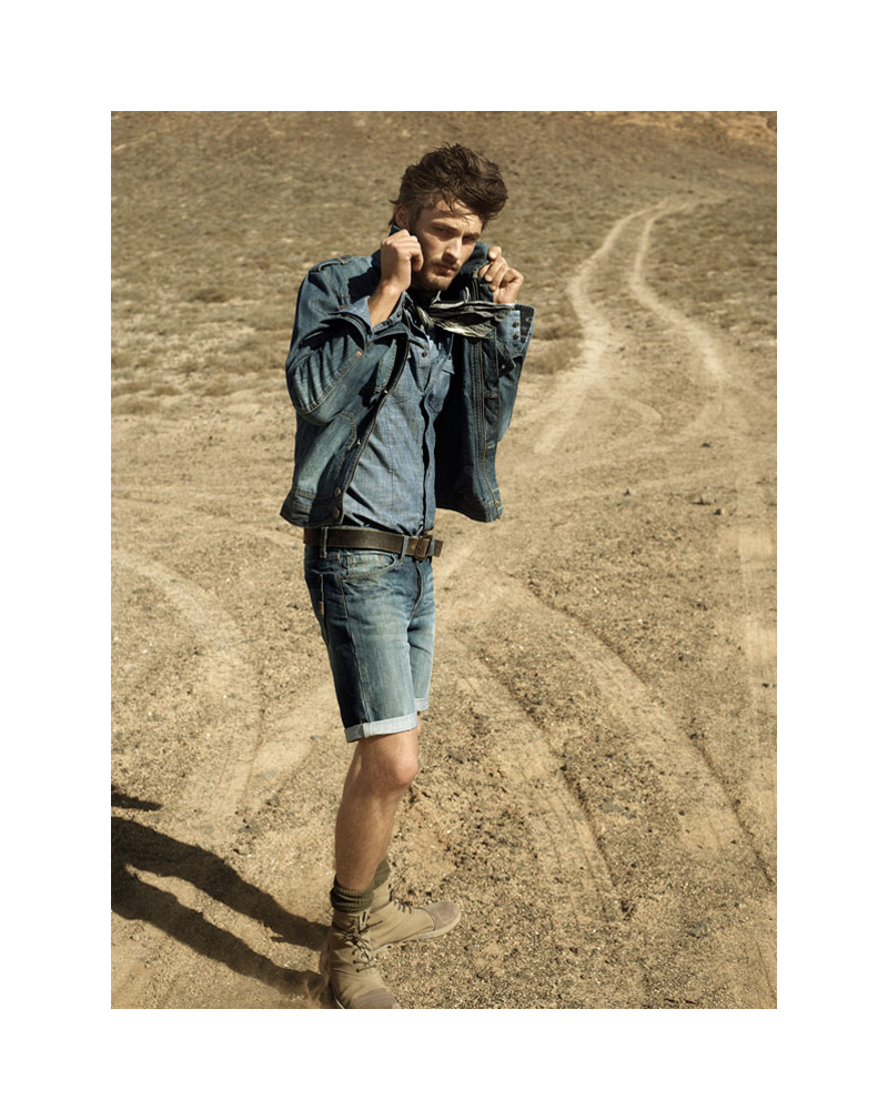 Denim and army green set the simple masculine tone for Homini Emerito’s spring 2010 campaign featuring the striking Ben Hill. Retreating to the desert on his bike and dressed in earthy hues, Ben paints a divinely rugged picture for HE’s spring lineup.