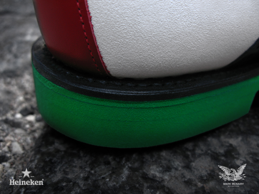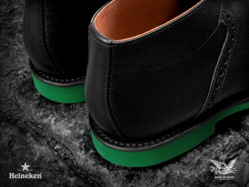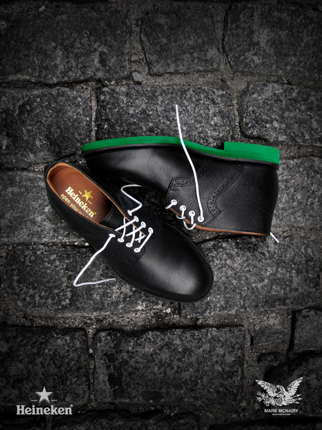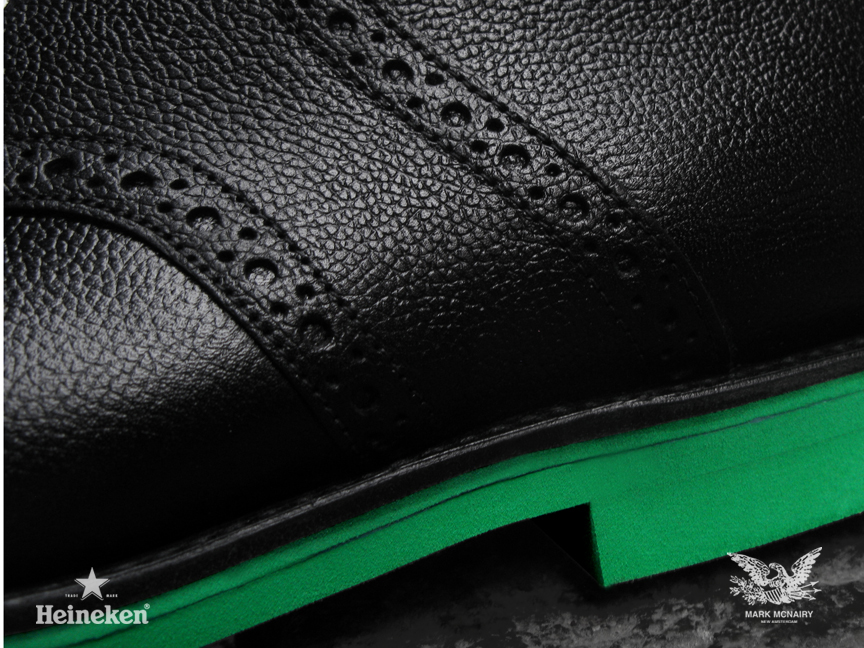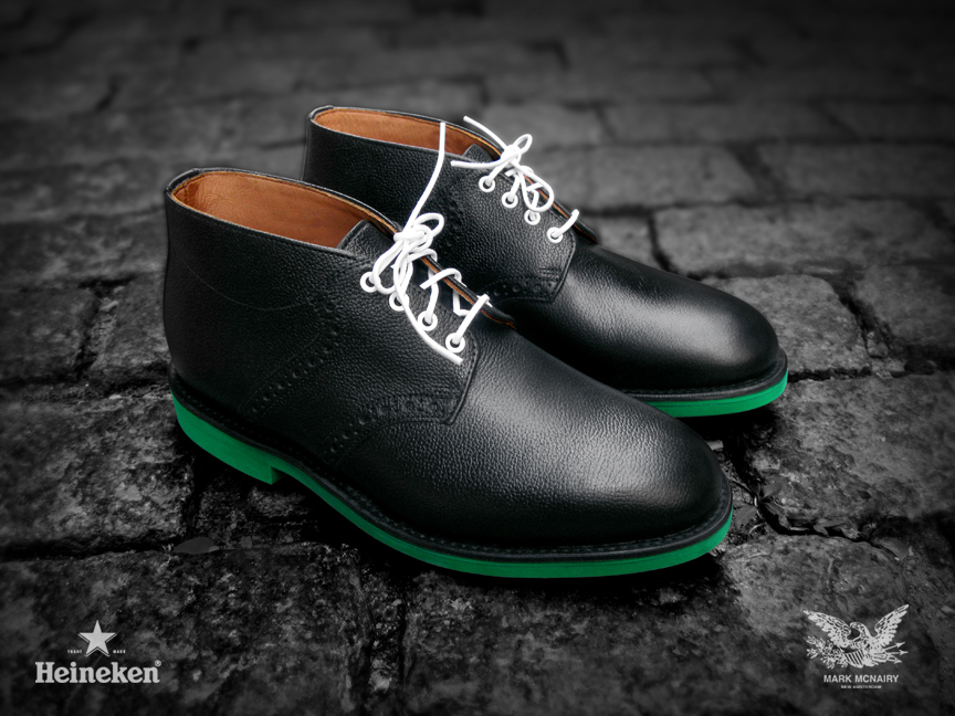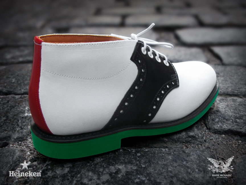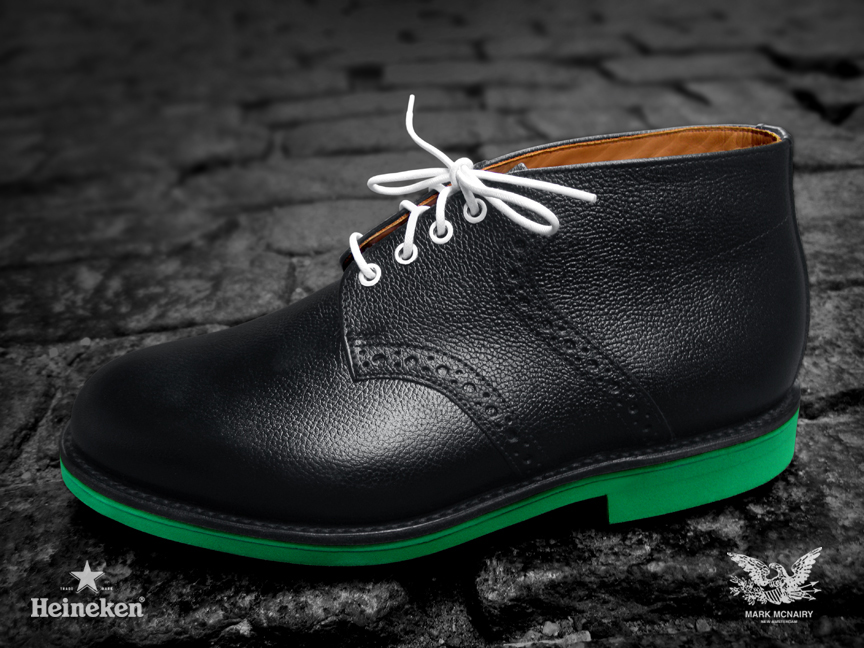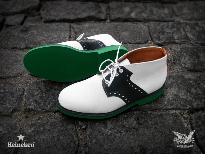 Beer Meets Fashion–World renown beer company Heineken collaborates with designer Mark McNairy for the #Heineken100 program, featuring an exclusive capsule collection of the classic chukka saddle boot. The program’s creative director, Chris Gibbs, worked closely with Mark McNairy to develop the modern twists on the timeless silhouette. The two highlighted colorways both share the signature Heineken green eva sole, while one takes on a black pebbled leather upper and the other boasts a white suede upper. Designing for “The Man of the World,” the exclusive shoes are only available for the 100 individuals on the #Heineken100 list.