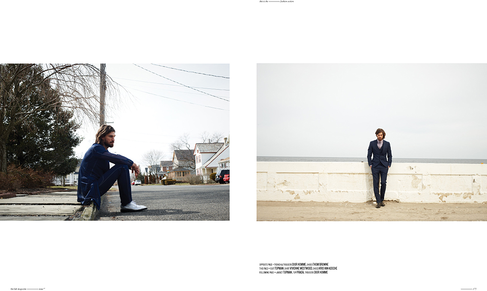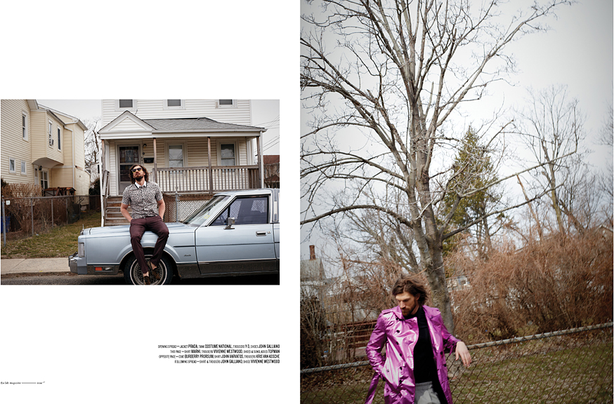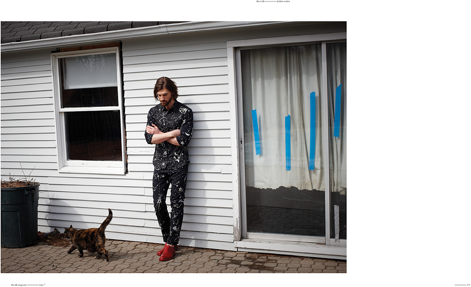Anywhere USA–Venturing into a suburban setting, Soul Artist Management model Henrik Fallenius is photographed before the lens of Ben Morris for a casual afternoon editorial for the latest issue of The Lab magazine. Contrasting a quiet residential background, stylist Michelle Carimpong dresses Henrik in energizing prints, metallic fabrics, and bright shades by labels such as KRISVANASSCHE, Dior Homme and Vivienne Westwood. / Grooming by Andy Starkweather. Photography assistance by Heath McBride.